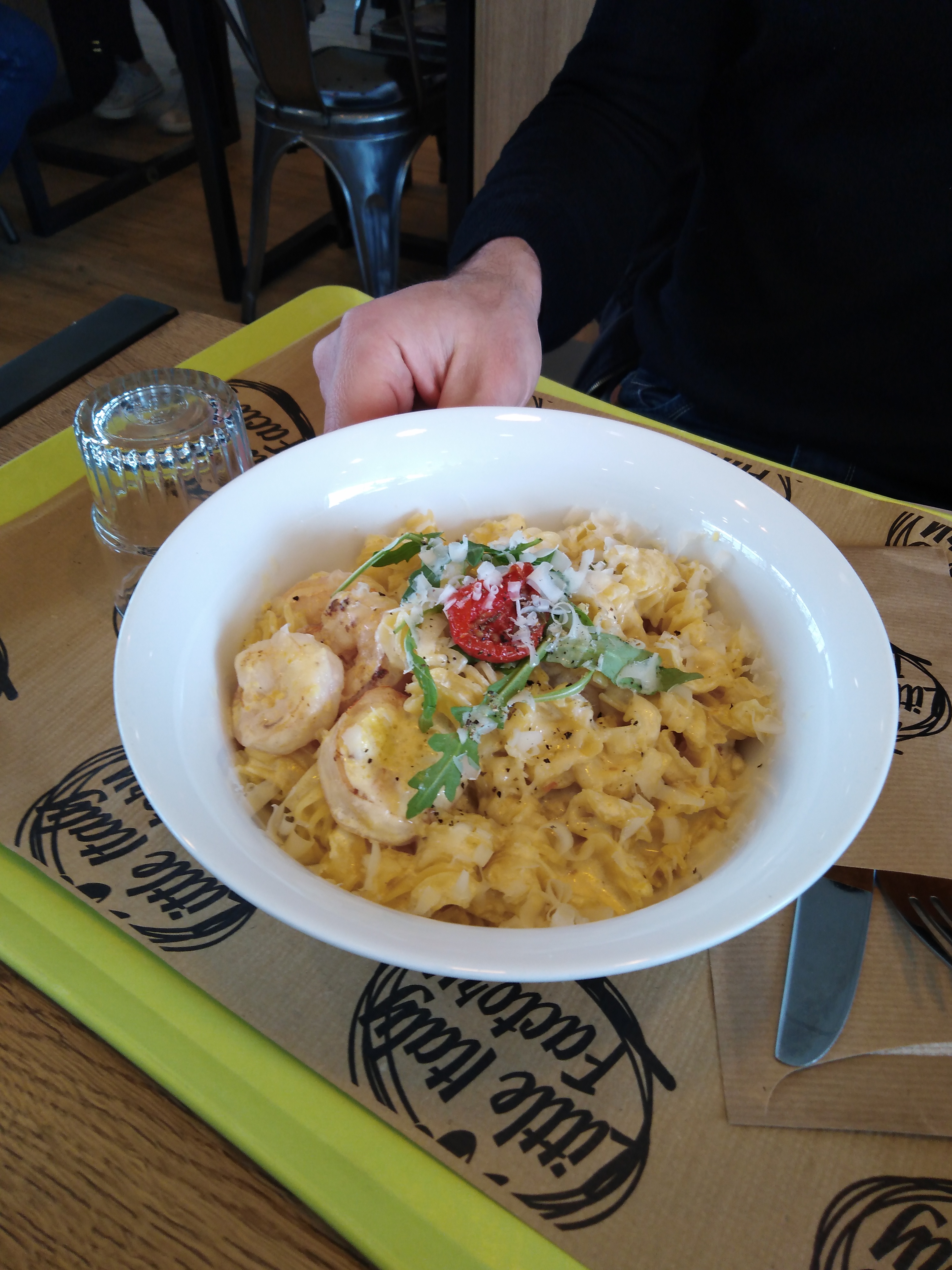 Nous n'avons pas apprécié le concept de se lever à chaque entrée plat dessert pour le commander puis se relever pour le recuperer en faisant parfois la queue en plus. Ça fait minimum 6 deplacements...Que ce soit en famille ou en amoureux on passe plus de temps debout. Et côté repas, nous avons pris des pâtes, le parmesan est râpé comme de l'emmental. Il en a d'ailleurs le goût. Les pâtes étaient trop cuites. Bref nous n'avons pas terminé notre assiette. Si vous aimez les assiettes pleines et que vous n'êtes pas fin gourmet et que le concept ne vous freine pas alors n'hésitez pas en revanche. Le cadre est idéal pour des groupes de jeunes.