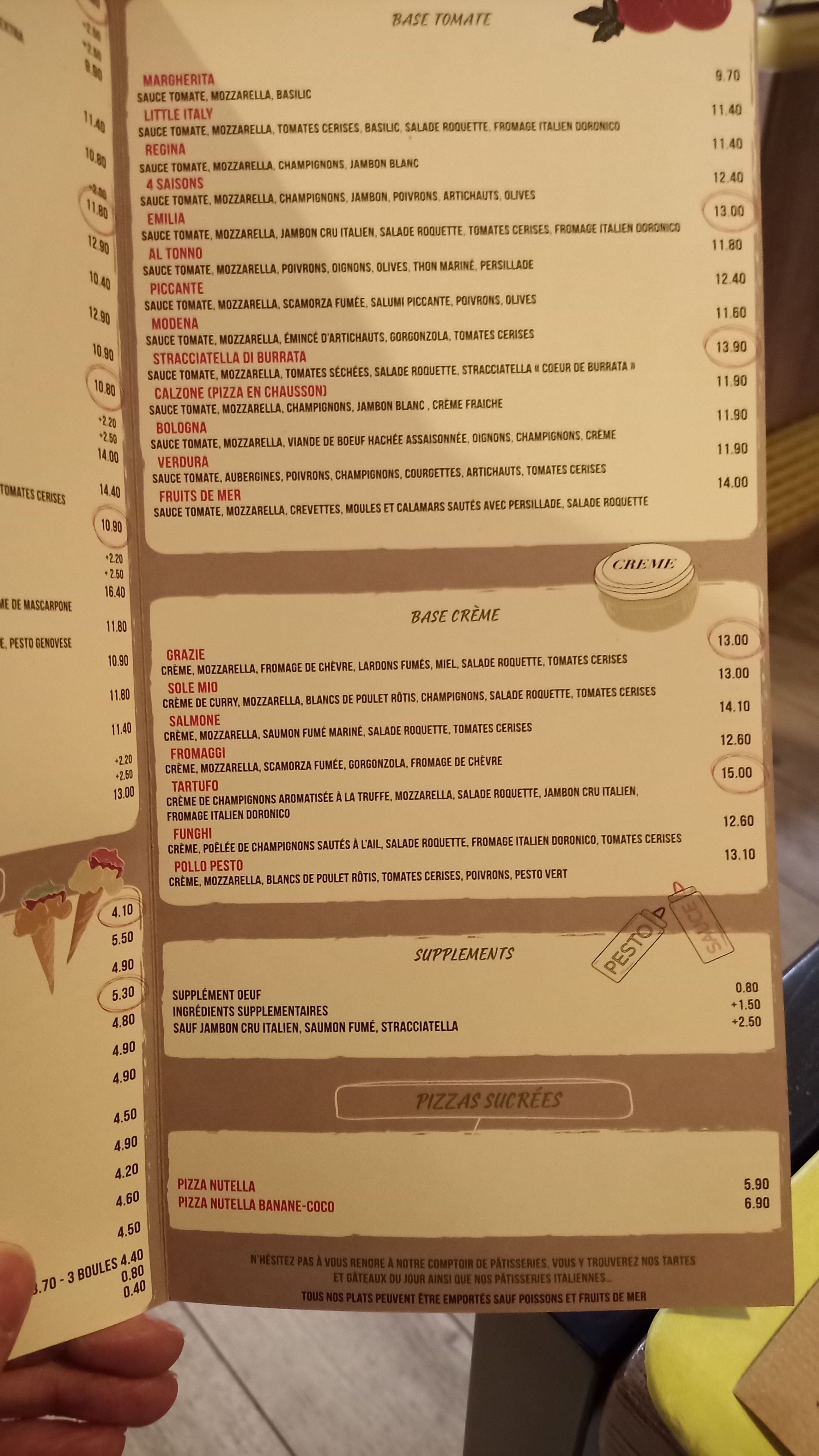 Parking restreint, chaises/tabourets inconfortables, passage entre les tables trop étroits voire impossible, fruits de mer sur pizza caoutchouteux, pâtes trop cuites, tiramisu bon mais écoeurant car trop de crème et pas assez de gâteau. Déçus car pas de glaces a l italienne. Sinon temps d attente correct, prix accessibles et personnel aimable.