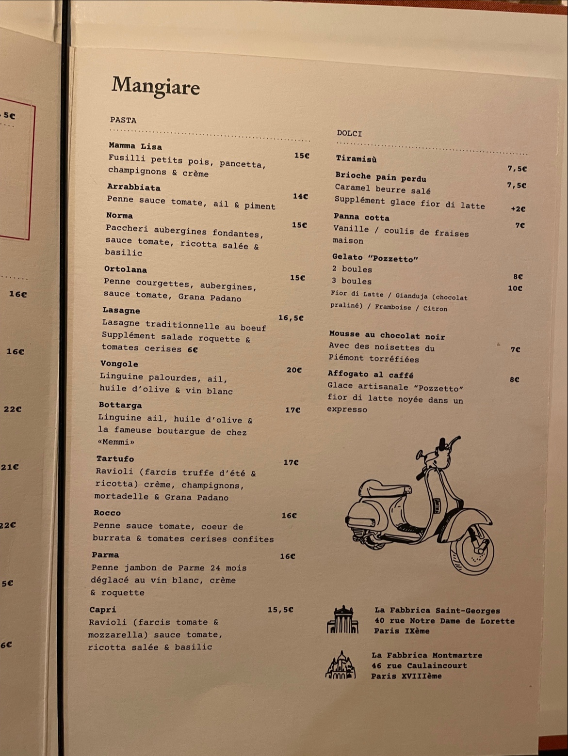 De passage à Paris, nous avons dîné dans ce joli restaurant italien où règne une agréable ambiance cosy. Le rosé servi en pichet est un vrai délice. Les plats sont très bons et je recommande à tous d'essayer la Mozzarella in carrozza car nous avons été très agréablement surpris ! Les toasts arrivent panés et accompagnés d'une sauce tomate qui rappelle celles qu'on trouve en Italie. Le Tartuffo est un excellent mariage et bien loin d'être fade, contrairement à ce que j'ai pu lire dans un commentaire. Le tout pour un prix abordable à Paris. Aucun regret, nous sommes ravis de notre soirée et merci au(x) chef(s).