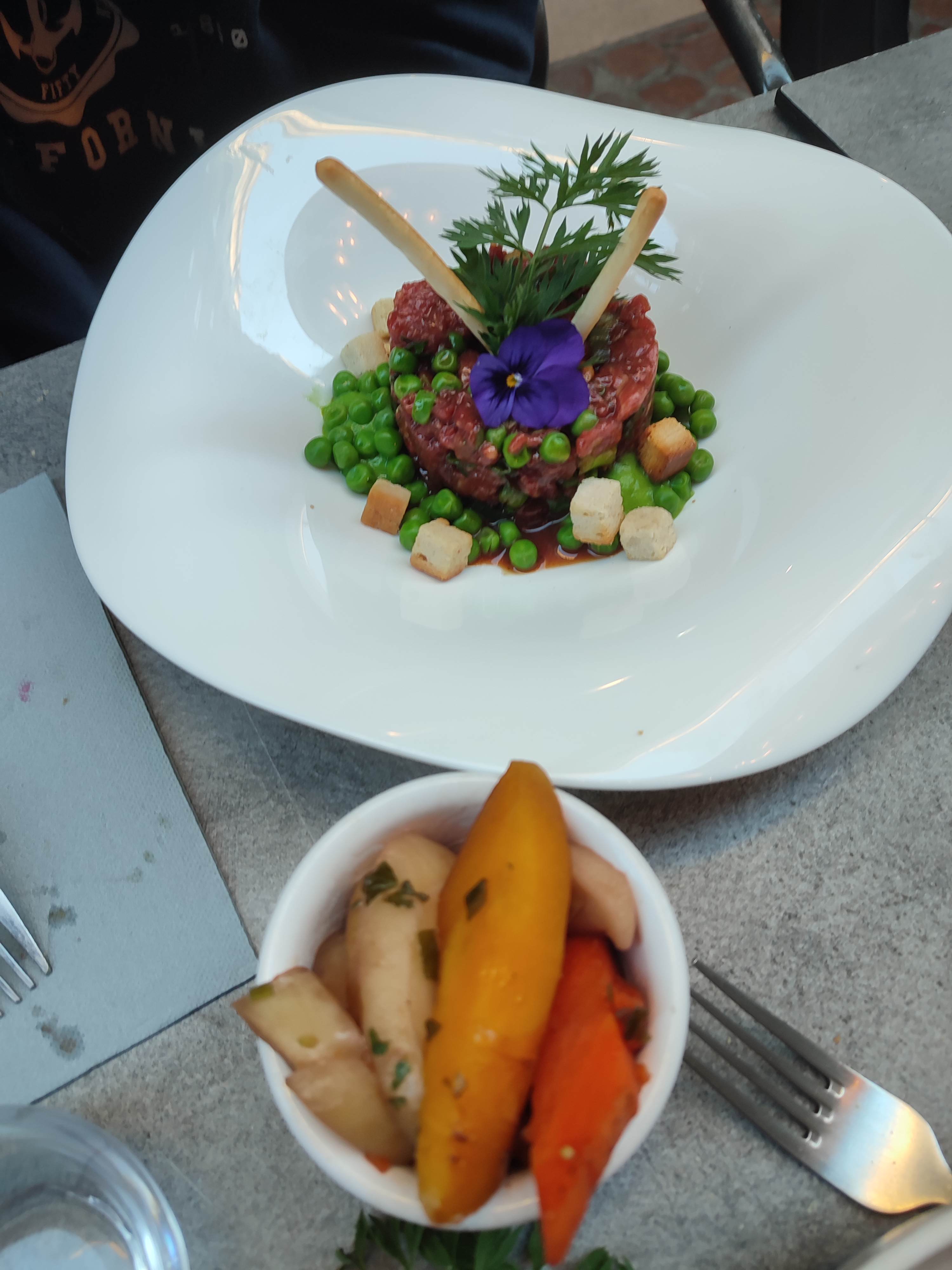 Pour 22-24€ Le tartare …. le tartare est sans accompagnement, ( réponse : les clients mange de beaucoup de pain avec, ou alors il y a des légumes croquant pour 2€ de plus si vous voulez ) MAIS: du coup c’est un peu cher, pour un tartare avec du pain ? ( Réponse : c’est parce que l’on fait -50% via the fork) DONC : nous, nous sommes des pigeons et tu nous le dis bien en face. Conclusion: en sortant du resto, on avait encore faim et on avait payé 22-24€ un tartare sans accompagnement … vraiment dommage car le tartare était bon.