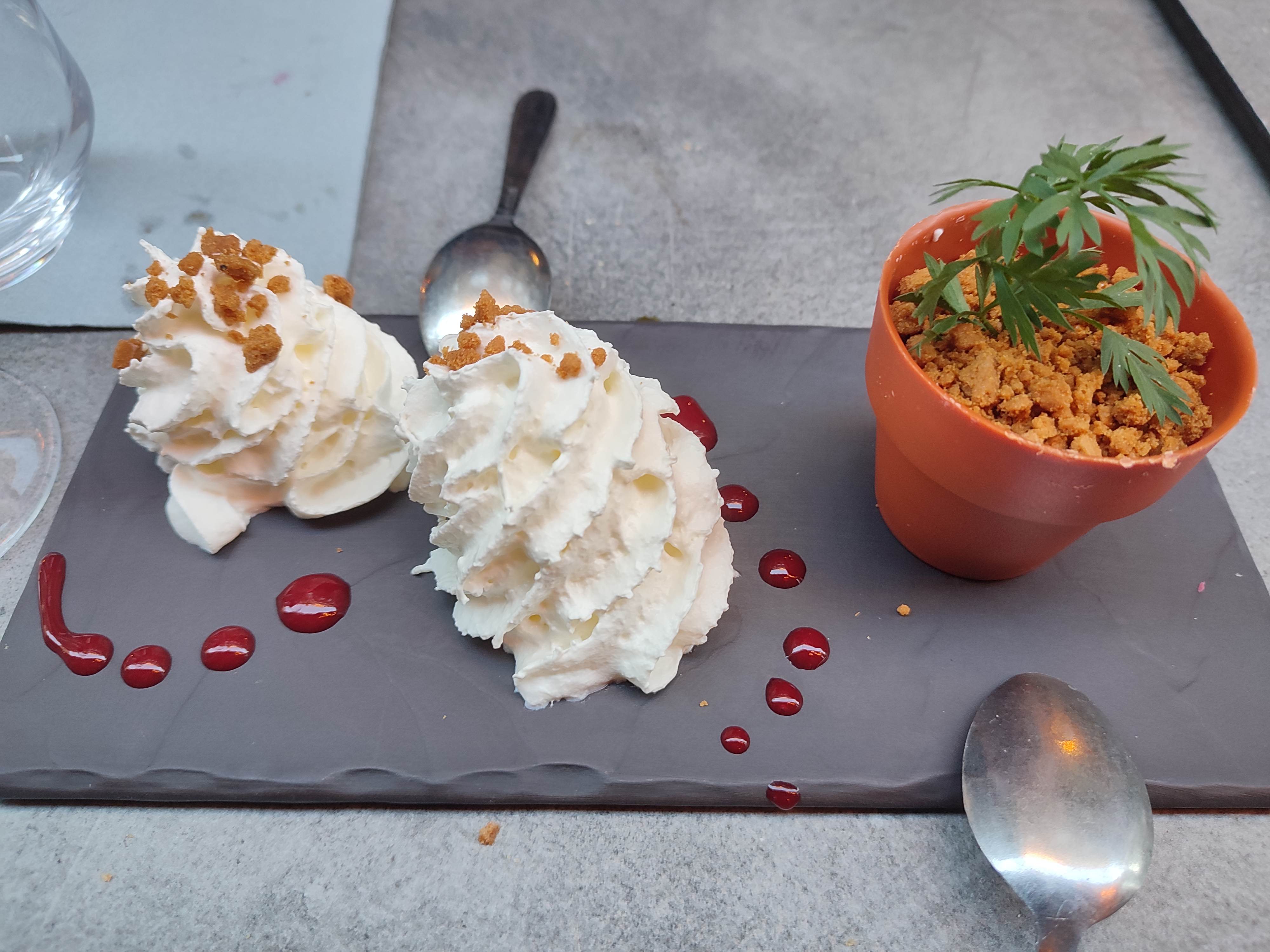 Plats recherchés et fait maison, en revanche dommage que le dessert ne soit pas à la hauteur du plat voir pas fait maison surtout la chantilly. Service sympathique mais manque de professionnalisme sur la nature des relations du personnel... un peu gênant ! Bonne table mais service un peu oppressant comme une note amené sur table sans notre demande... Quel dommage car étant déjà venue une première fois et servit par deux hommes accueillant et sympathique ! Deuxième expérience mitigé !
