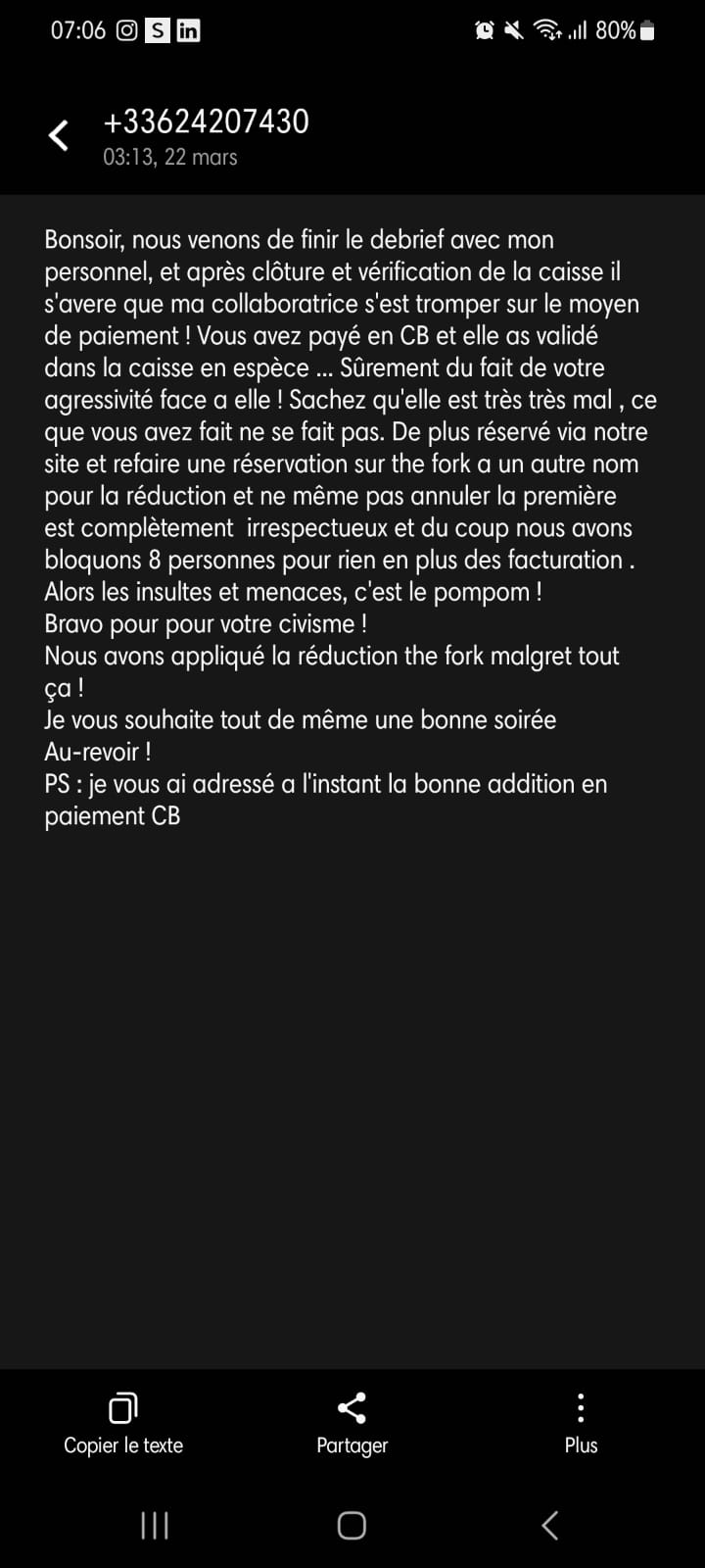 ATTENTION ARNAQUE ! réservation effectuée en double par inadvertance. Arriver au restaurant, je leur precise que j'ai réservé 2 fois la serveuse me dis pas de problème j'ai qu'une réservation (j'aurai bien annulé, mais ayant reçu la confirmation par sms a 21h, soit l'heure d'arrivée au resto, compliqué..). A la fin du repas, le patron appel pour nous dire qu'il faut payer 8€ par personne parcequ'on a reserver au double, et nous menace d'appeler la POLICE (il n'y avait PERSONNE dans le resto). Pratique illégale, nous avons la facture. Le personnel n'y est pour rien alors ne faite pas porter sur eux le poids de vos problèmes d'argent ALEX.