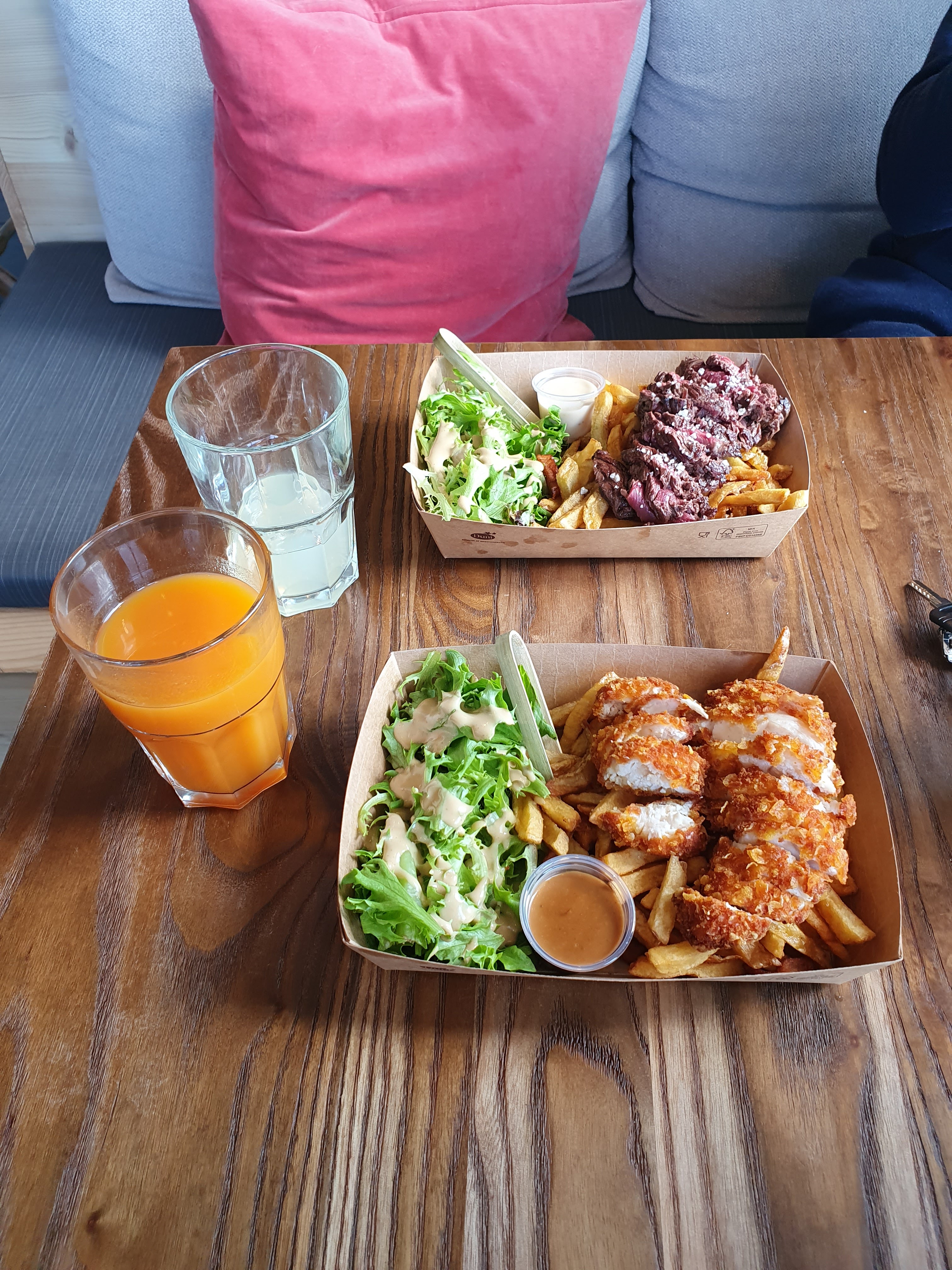 Avons déjeuné sur la terrasse ensoleillée le 05 novembre, c'était bien agréable, avons pris une chère cocotte, une salade, un cornet de frites, des gaufres et des bières blanches la Ginette. Tout était parfait, les frites maison excellentes, le poulet pané, ..... service un peu long mais il y avait vraiment beaucoup de monde donc ceci explique cela. Le concept est que les plats sont servis dans des barquettes en carton, couverts en bois ou bambou. Tout est je pense recyclable, je ne sais pas si c'est du recyclé, et m'interroge tout de même si entre laver la vaisselle ou prendre du tout jetable qu'elle est la meilleure solution ? Il faut faire une étude et voir quelle est la filière de recyclage, le patron a dû certainement le faire avant d'opter pour ce concept.