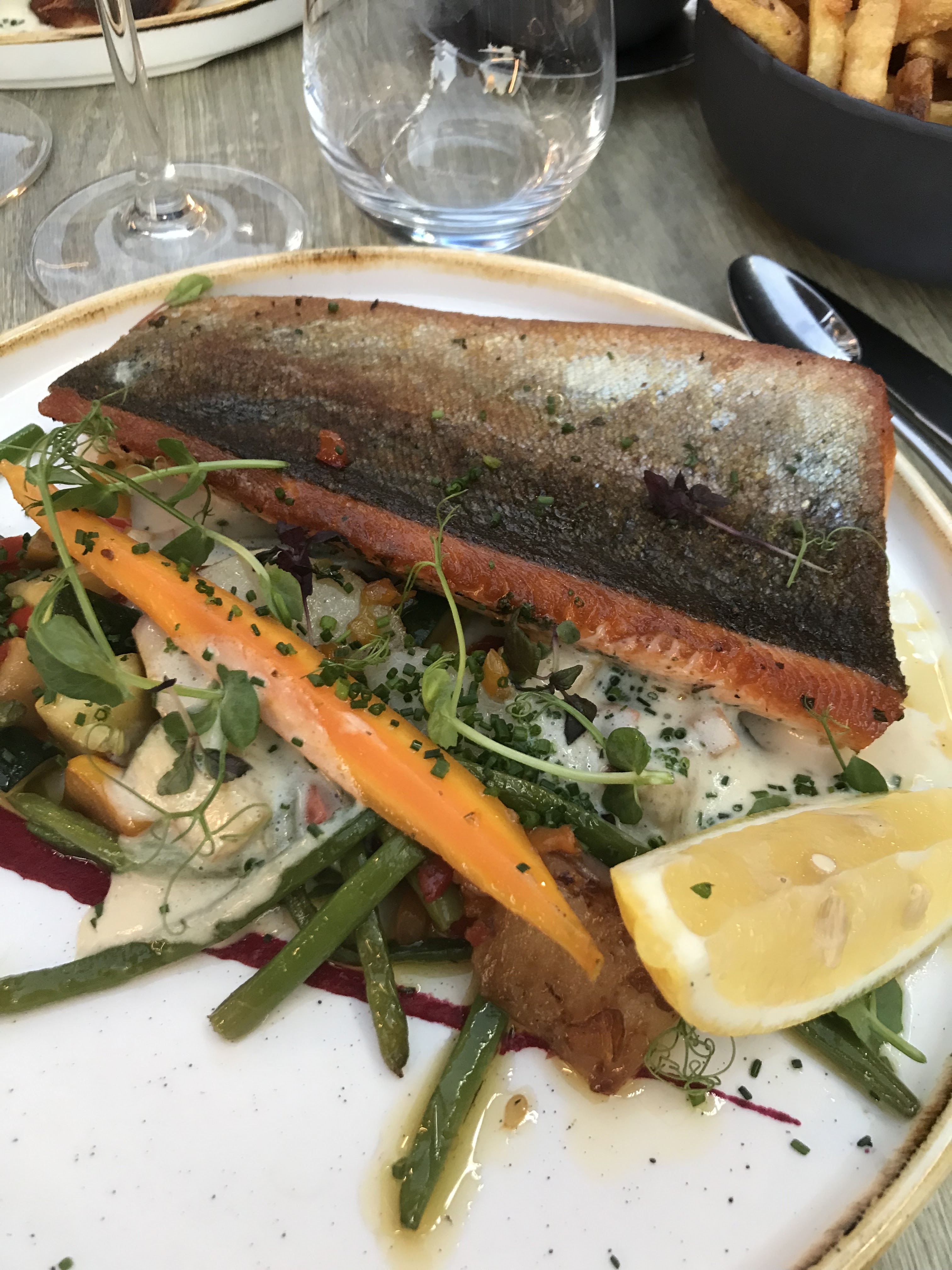 Très bon restaurant avec de bons produits frais Je me suis laissée tenter par la truite meunière avec ses petits légumes..un vrai régal pour les papilles. Une très belle découverte. Le hamburger de Monsieur était trop bon aussi😁