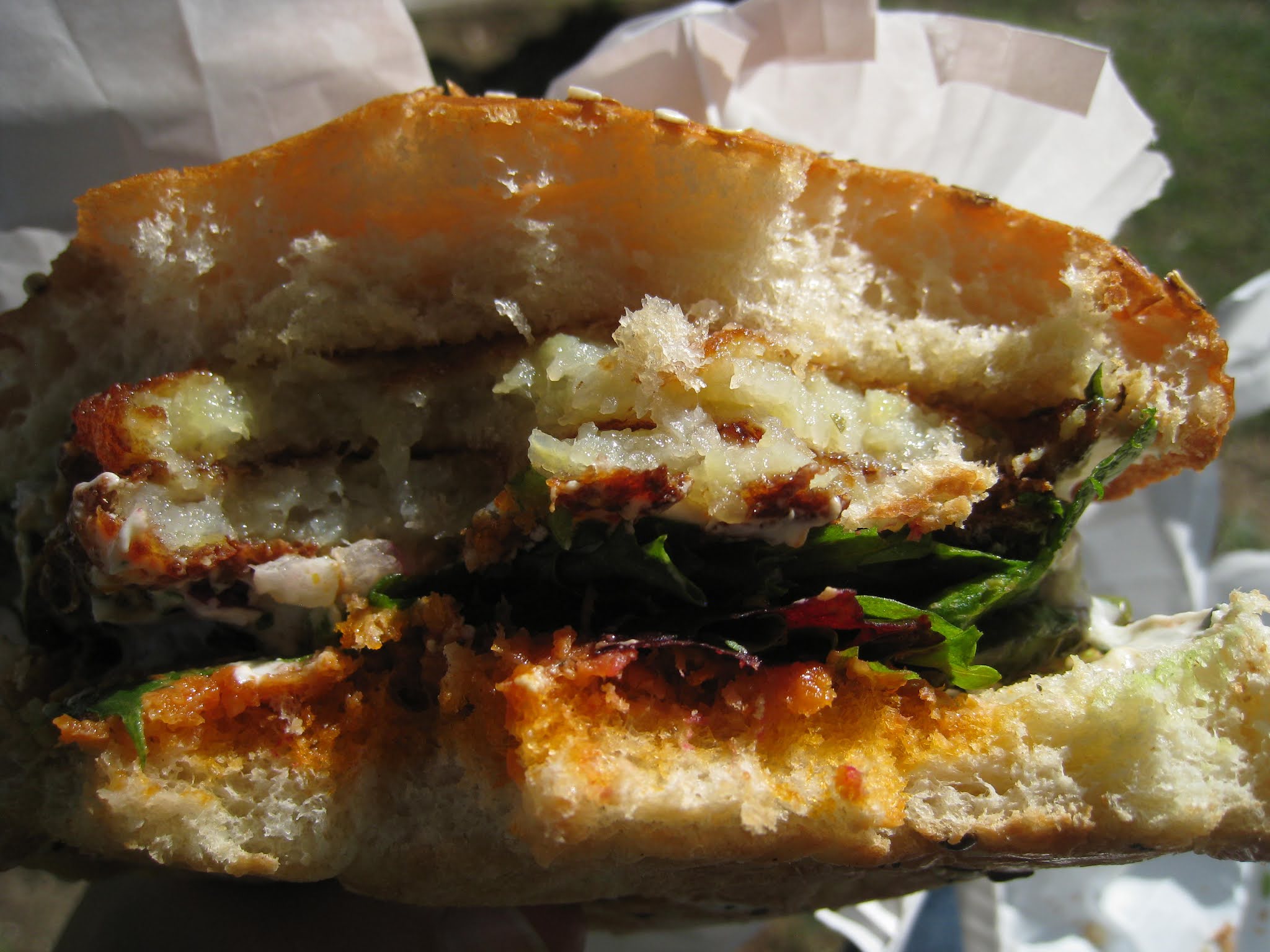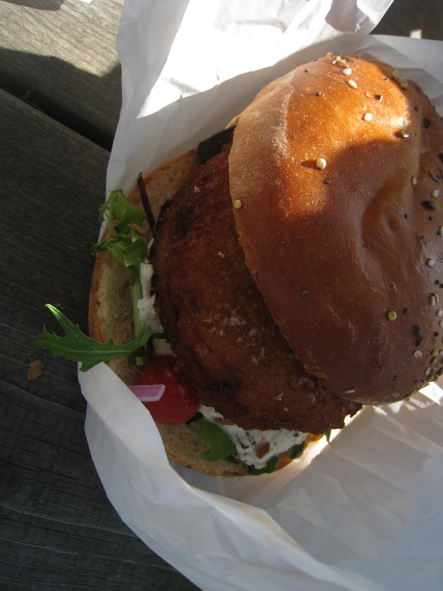 Un snack qui ne paie pas de mine mais qui réserve de délicieuses surprises. Commande de deux burgers végétariens + frites. La serveuse nous indique 20 minutes d'attente et nous tend un biper. Nous attendons donc sous le soleil dominical. C'est l'été indien en ce dimanche d'octobre. Au signal, nous récupérons notre déjeuner. Deux splendides burgers aux galettes de pommes de terre et des frites maison savoureuses. Extra !