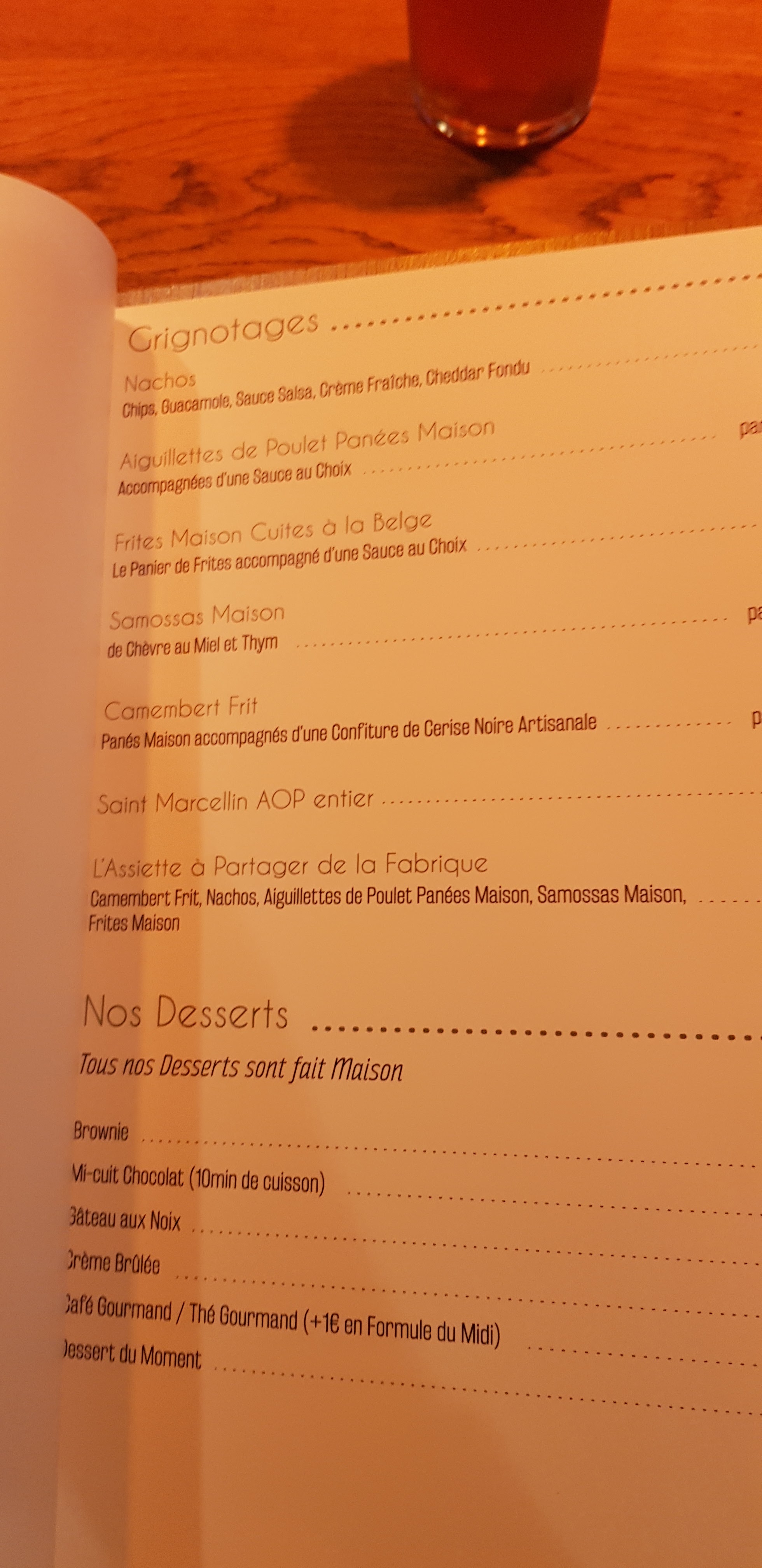 A l'origine je suis rentré dans ce bar pour la bière, le seul endroit de France ou j'ai trouvé de la queue de charrue , bière connu uniquement par ceux qui viennent comme moi du village en question, en Belgique. Et puis c'est devenu ma cantine, car pour un prix raisonnable vous avez tous les jours un plat du jour original cuisiné simplement mais avec amour. Je n'ai pas testé la carte, si ce n'est que le burger du jour, qui est correct. Très bonne crème brulée . Rapport qualité prix très chouette. L'équipe en plus est sympa , ce qui ne gâche rien. Un endroit intime ou l'on est bien. Merci a tous ceux de la fabrique.