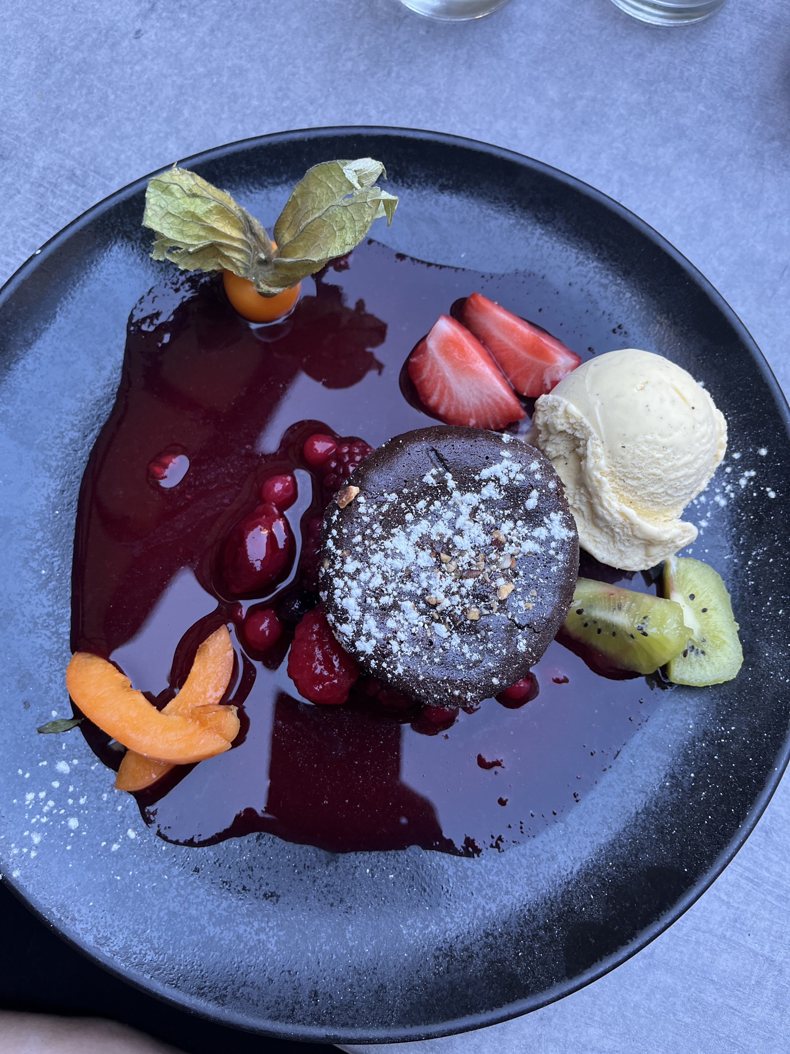 Tout était DÉLICIEUX ! J'ai eu le poisson du jour, accompagné d'un tas de légumes et d'une sorte de pâtes noires. C'était magnifique. Ensuite, j'ai eu le chocolat Coulant en dessert, tout simplement exquis. Tout était A+.