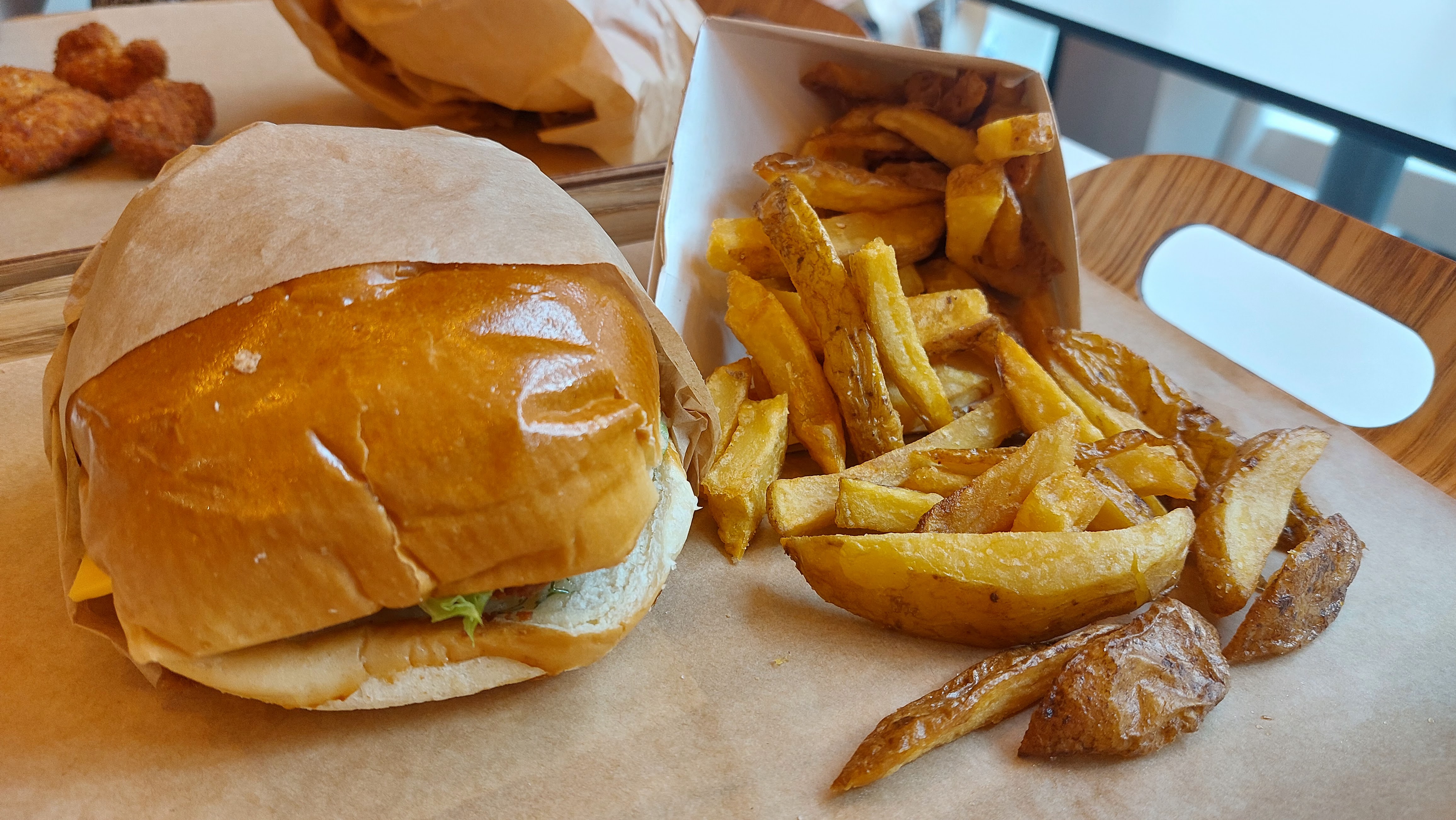 Très bon burger au niveau du goût. Buns moelleux légèrement sucré. Bonne cuisson de la viande de boeuf et bonne portion. Pour le burger au poulet pané, le poulet était un peu dur et sec, il y avait deux tranches assez fines et cela manquait de moelleux. Bonne épaisseur des frites, on sent bien le goût de la pomme de terre. Pour l'accompagnement de nuggets, ils étaient bien croustillants mais manquaient d'épices, dommage qu'il y en ai que 4.