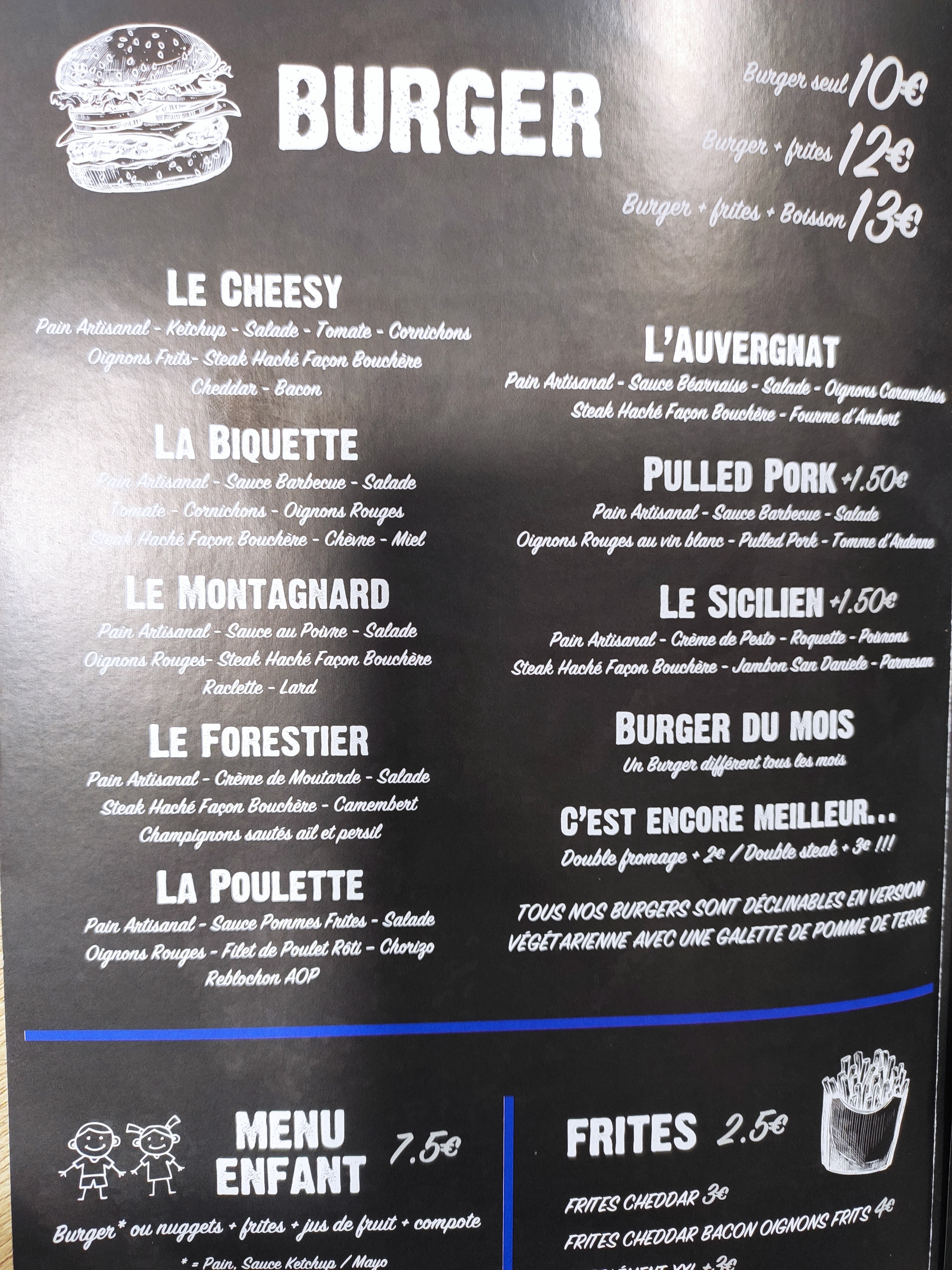 Excellent Burger maison avec un vrai steak façon boucher et au juste prix!!! Je recommande chaudement !!!