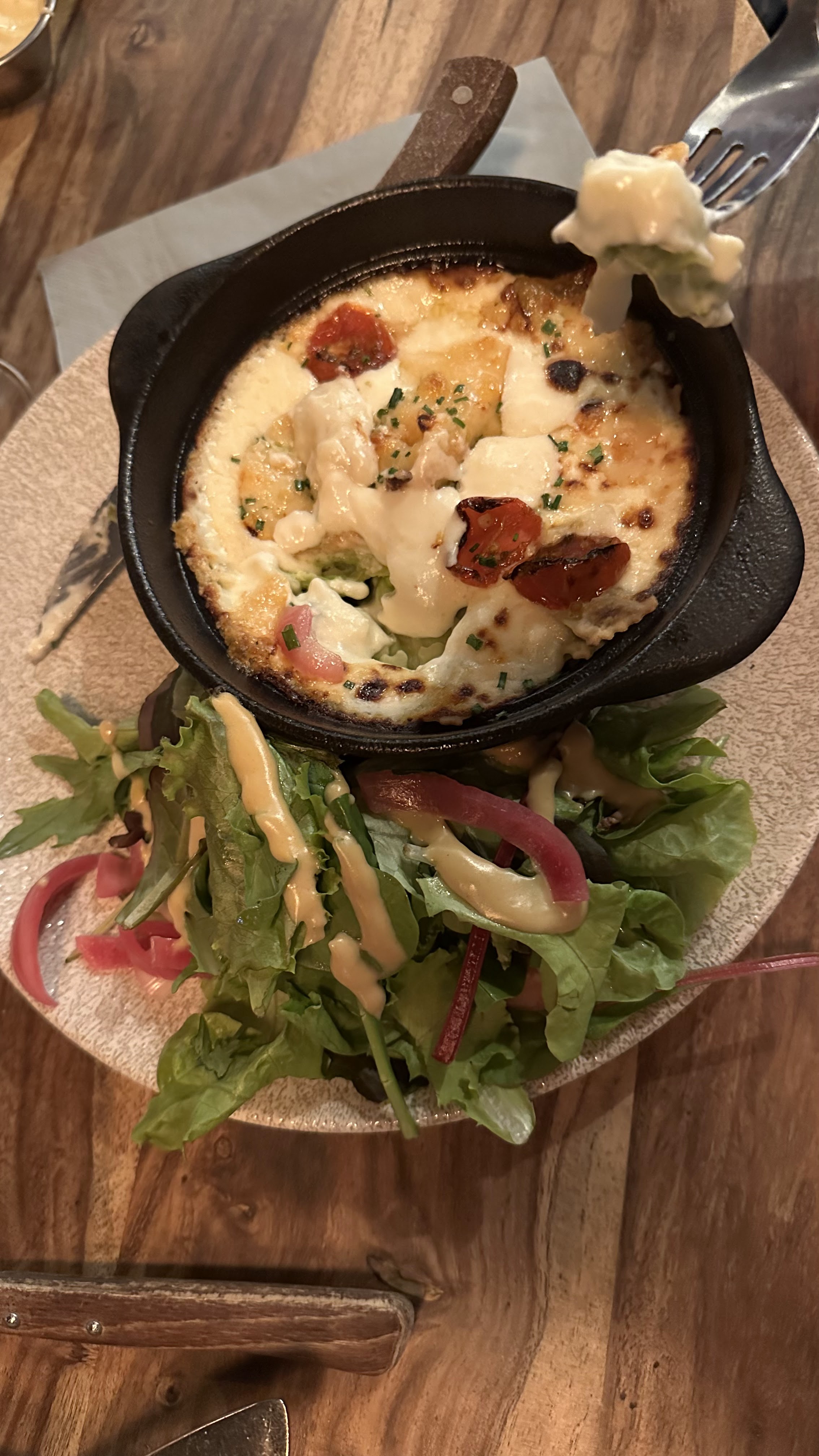 Belle découverte avec les pâtes préparées dans une meule de fromage ; elles étaient délicieuses ! Par contre nous avons été vraiment déçus par le service : pas agréable ni souriant pour un sou et limite méprisant malgré toutes nos tentatives pour égayer l'atmosphère. Nous n'avons pas dû venir le bon soir... Bien dommage !