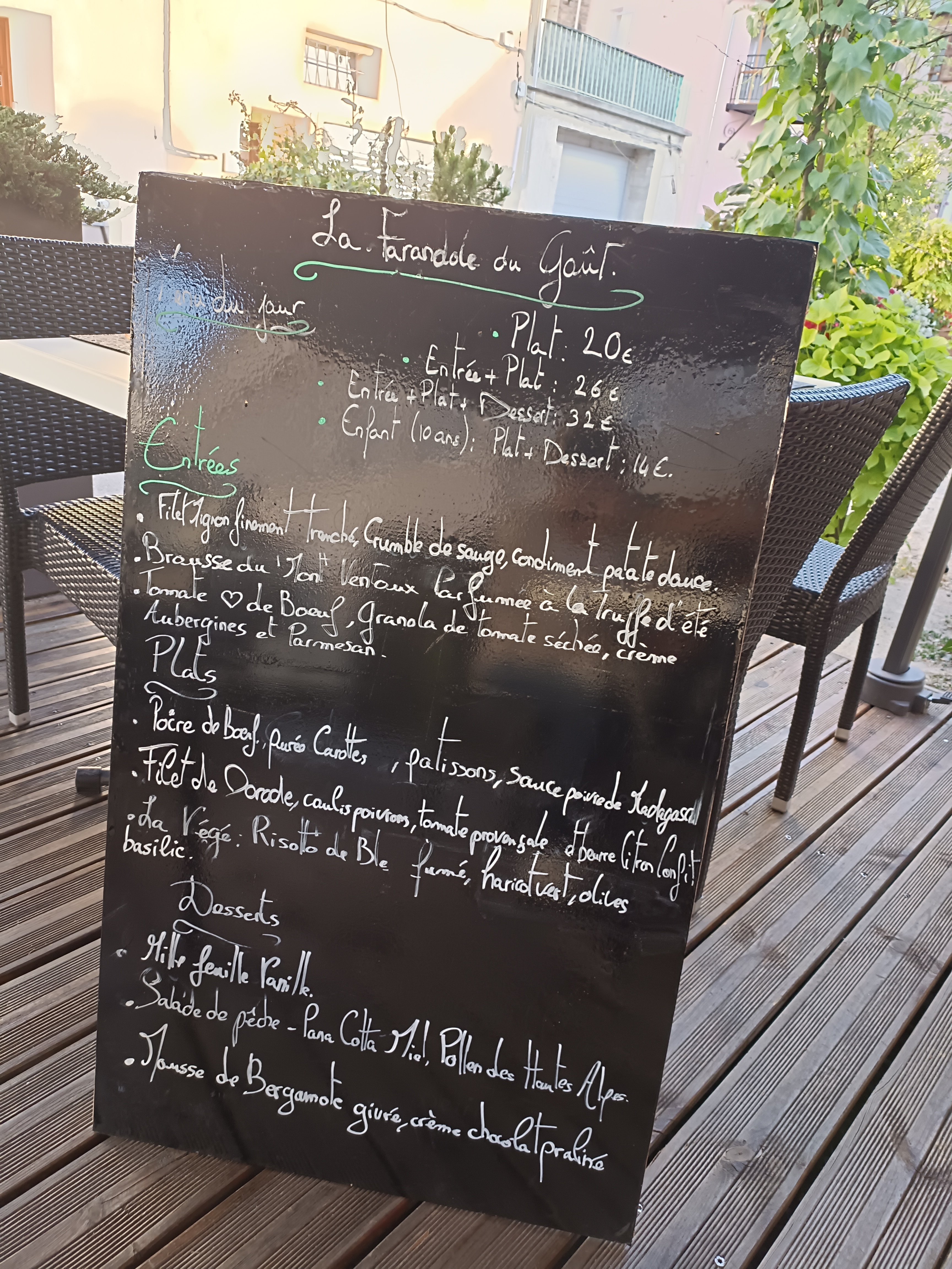 Très bon restaurant je vous le conseille fortement un délice tout Les jours je n' ai jamais été déçu tant par Les menus qui changent tout les jours accueilli par Thérèse Une femme adorable qui a toujours le sourire vous accueille comme Une maman .des cuisiniers que ce soit repas chauds ou desserts vous repartirez heureux et le ventre pleins. A Embrun a la Farandole du goût on vous accueille comme la famille merci a toi Thérèse a très bientôt Bises