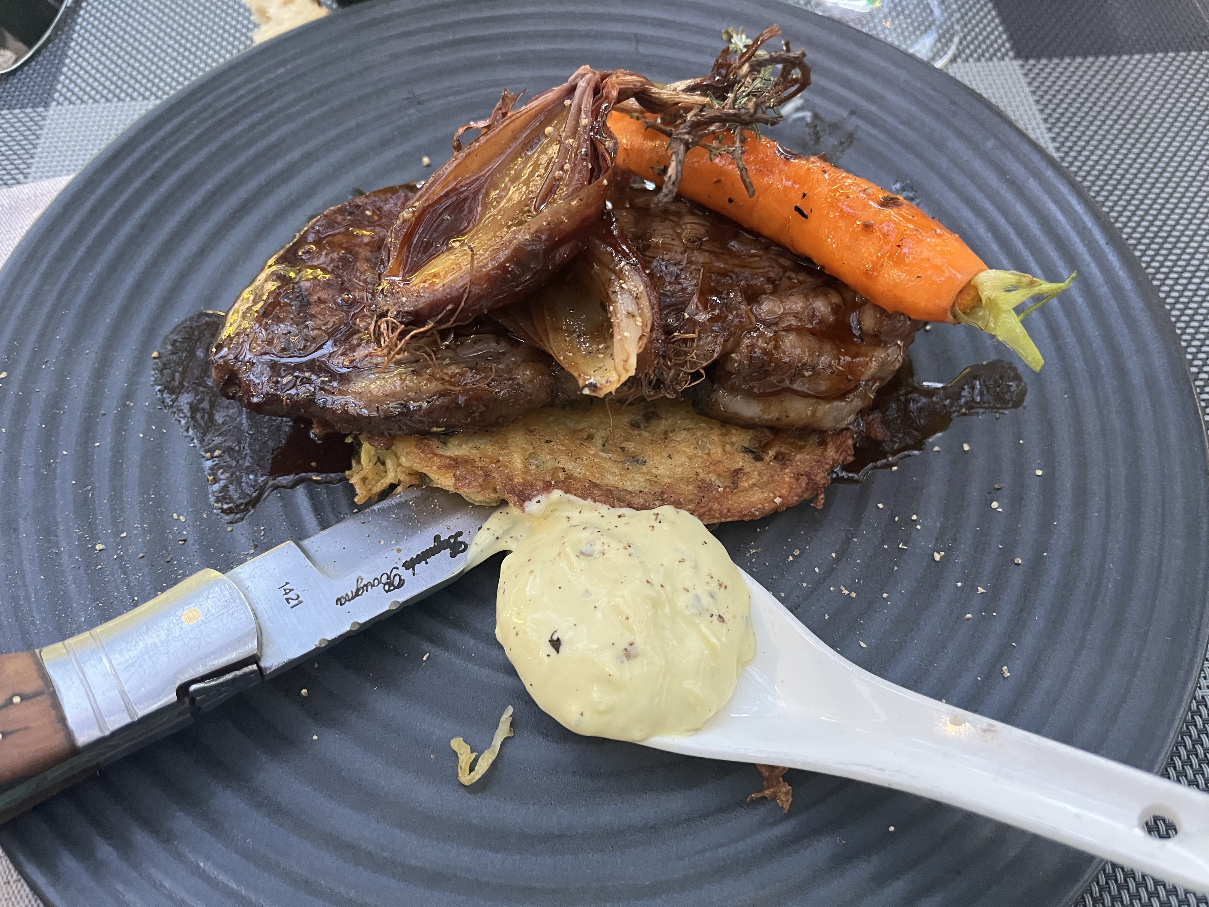 Nous avons dîné à 2 reprises au mois d'août 2020 à la Farigoule. La terrasse est ombragée, un peu cachée, à proximité de l'église. Les plats sont goûteux, bien cuisinés et assez gourmands ! Le menu du jour proposé en entré+plat ou plat+dessert ( à 26€) ou encore entrée+plat+dessert (à 30€) est d'un bon rapport qualité/prix. Les viandes comme la côte de taureau et autres grillades sont cuites à la cheminée. Le service est agréable et bien rôdé. Seul bémol peut être : le coût des boissons. Mais globalement l'adresse est bonne. Nous y retournerons sans hésiter.