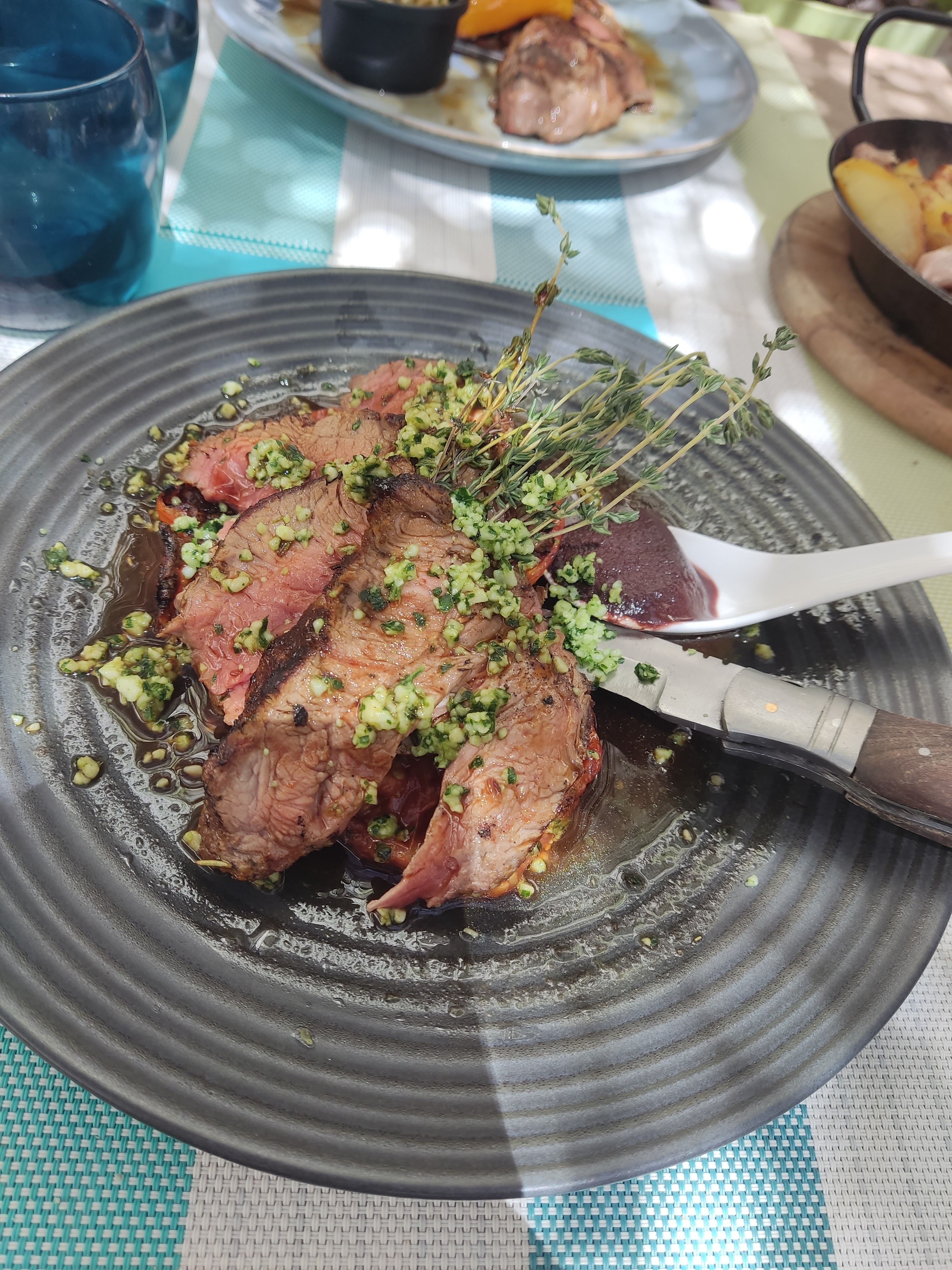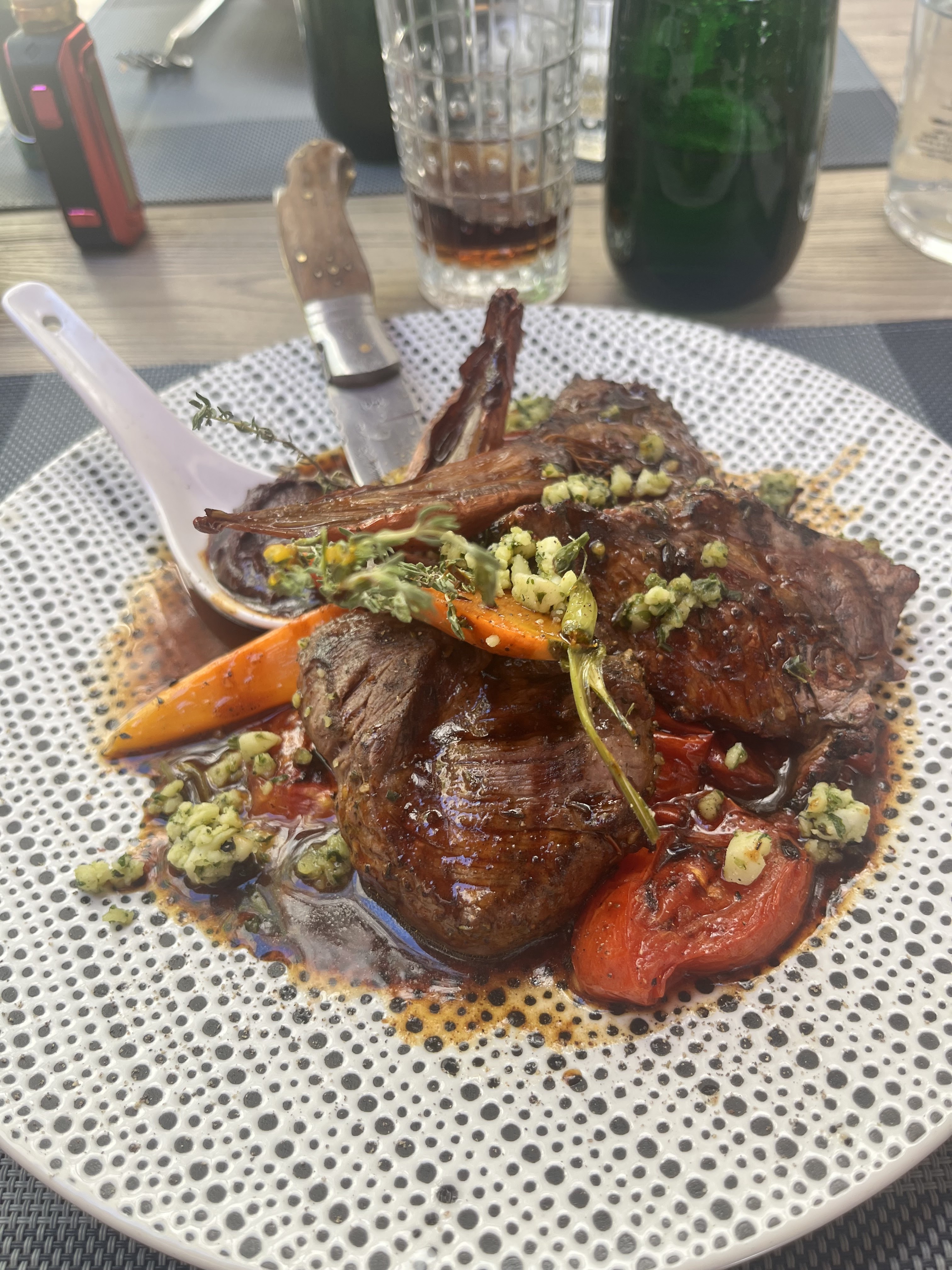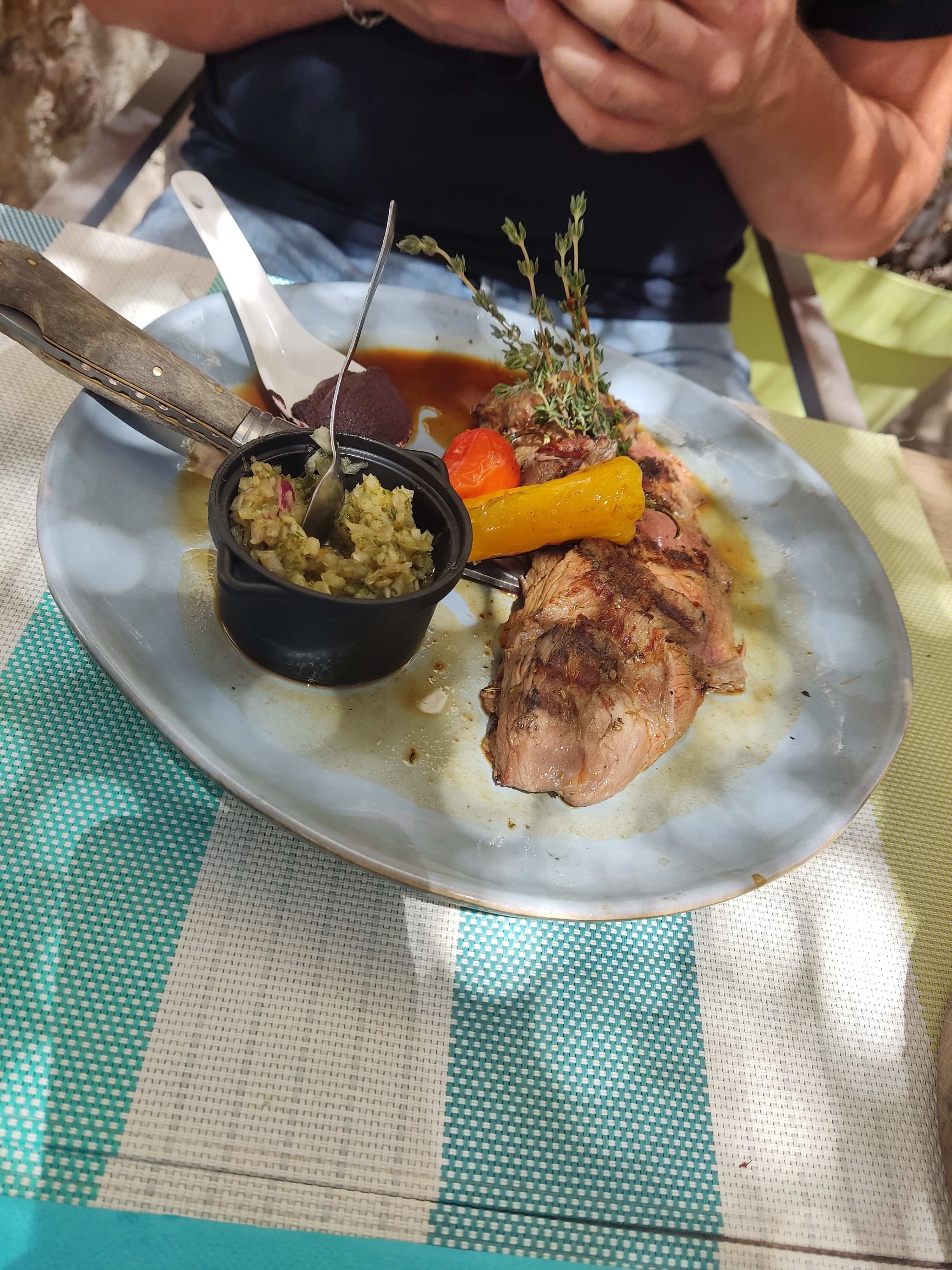 Un restaurant, c'est un peu comme un film. Au plus on en attend, au plus on court le risque d'être déçu... J'avais repéré ce restaurant dans un de mes villages favoris de longue date : pergolas arborée des plus agréables, jolies tables, carte alléchante...J'avais donc réservé pour 4 pour la fête des pères bien en avance. Un menu unique (pas de choix entrée/plat ou dessert) qui pousse un peu à la carte (fournie mais pourquoi a tendance italienne ?), mais bon. 3 plats indisponibles dès notre arrivée (nous étions parmi les premiers, admettons. Après l'apéritif, nous attendons un moment avant d'être servis. Jolis plat sans doute faits minute, gros soucis sur les accompagnements : la côte de taureau de ma fille est servie avec un quart de pomme de terre et 3 asperges, l'osso-bucco de ma femme avec une petite purée et un tas de salade sans aucun assaisonnement et posé dans l'assiette sur une serviette en papier (?). Quant aux lasagnes de ma fille (€13 tout de même), rien d'autre dans l'assiette, pas même la petite salade qui va bien dans ce genre de cas...J'ai demandé de la vinaigrette pour la salade de ma femme une fois à chaque serveur, elle n'est jamais venue...Ils avaient certes du monde mais quand un client vous fait remarquer que la salade n'est même pas assaisonnée, ça se remarque et ça se corrige... Sinon à part ça, heureusement, les goûts étaient là. Viandes bien cuites et goûteuses, bien servies et chaudes. Mais bon, quand la note monte à presque €100 à 4 avec juste un apéro et un plat, on est en droit d'attendre mieux, même si le cadre est des plus plaisants.