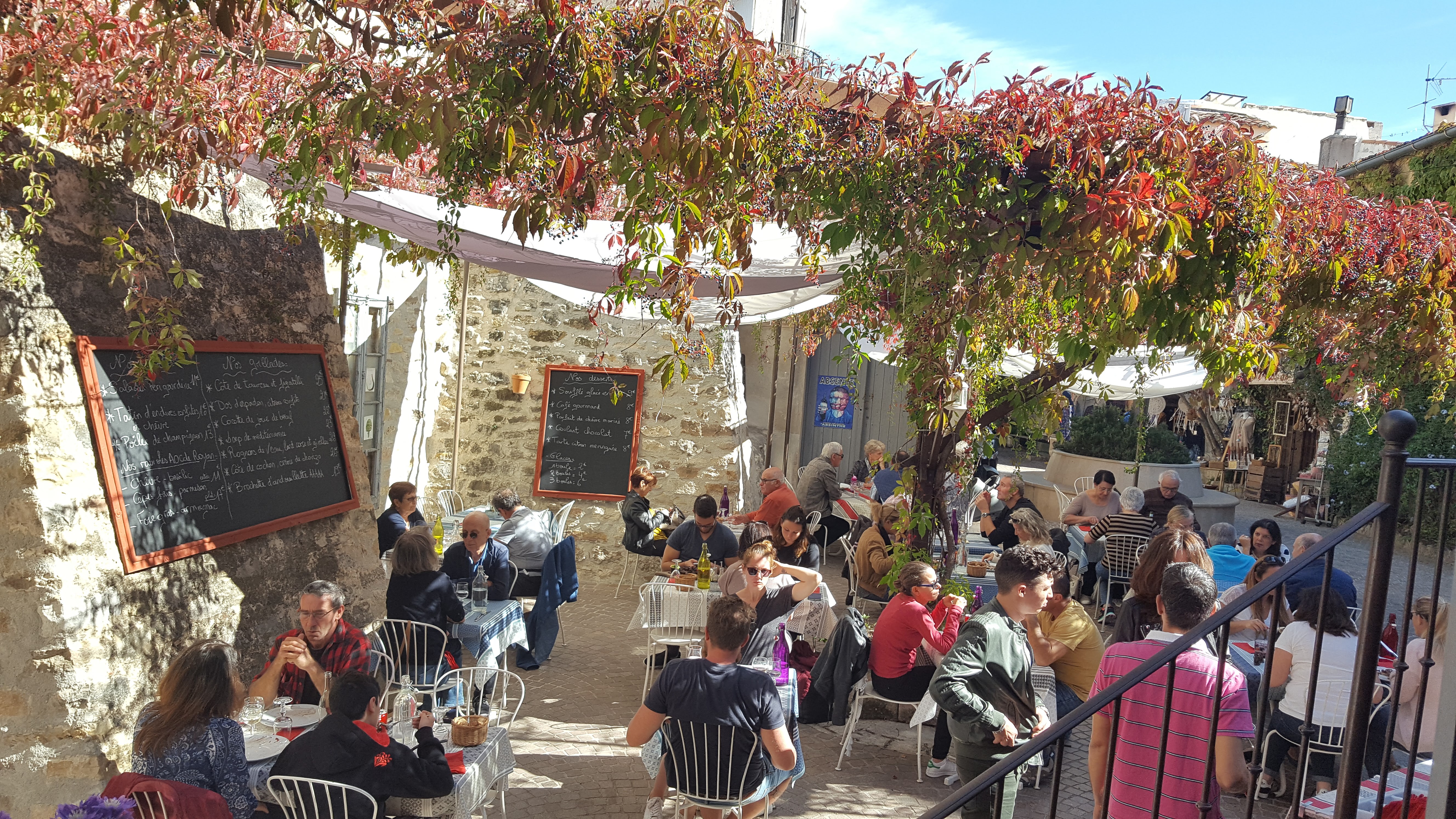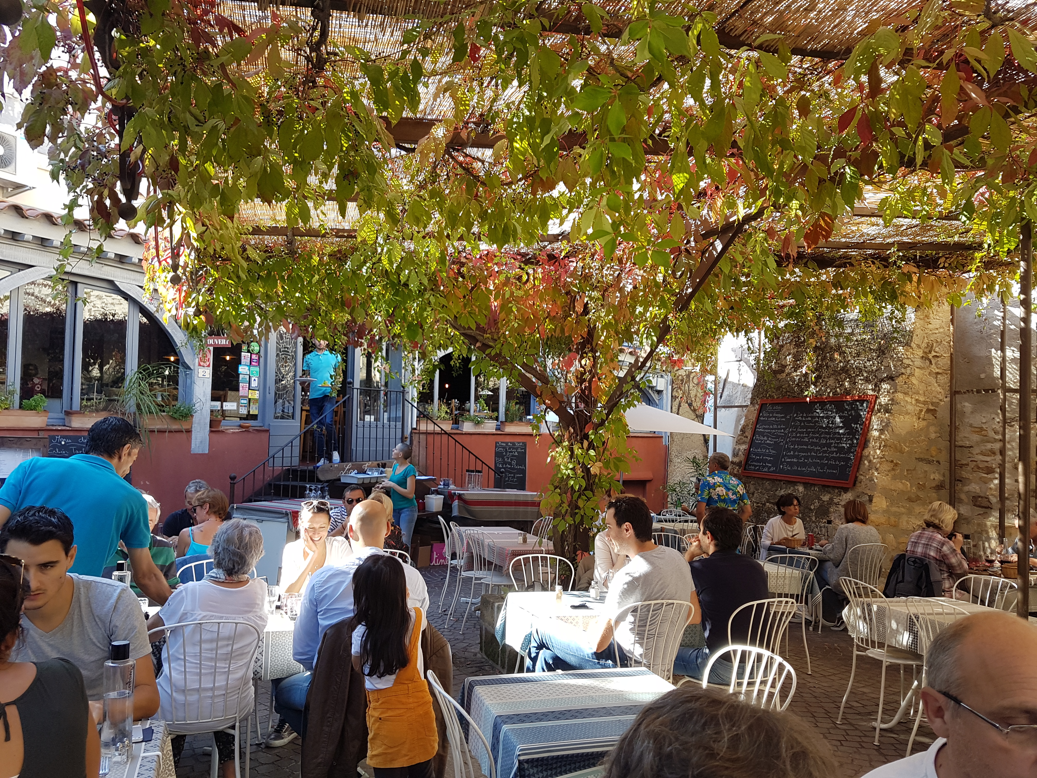 Terrasse ombragée sous une tonnelle de vignes et de rabanes sur une belle place du village du Castelet. Le service est agréable et les menus proposés du terroir avec des produits locaux frais très original et bon.