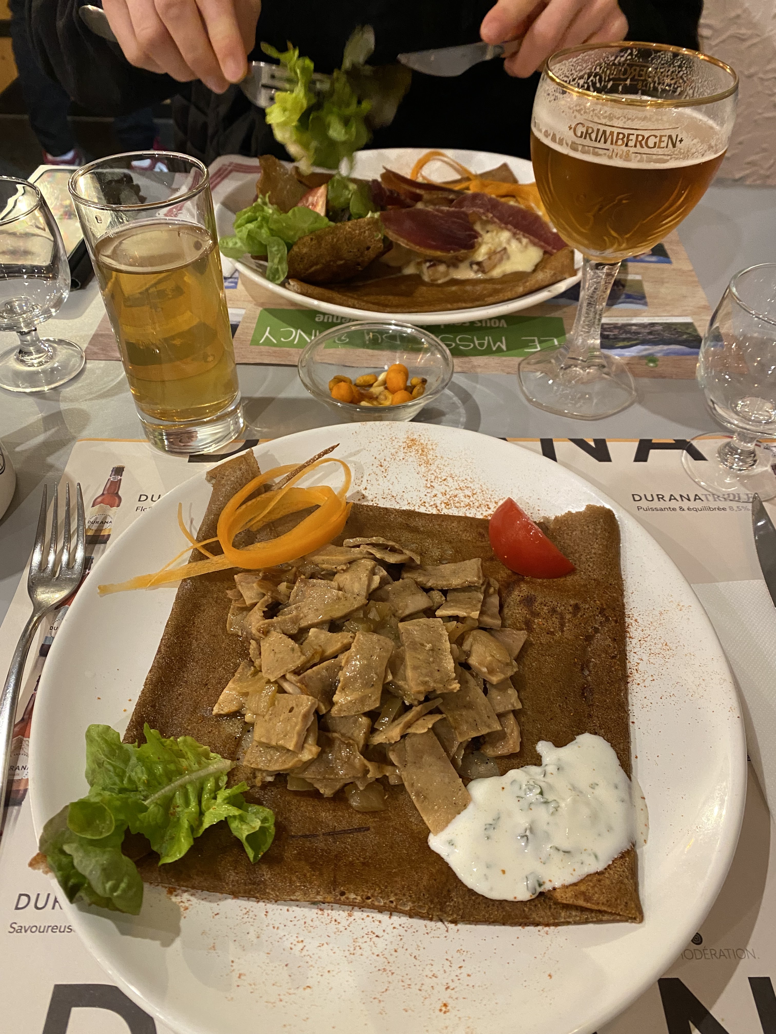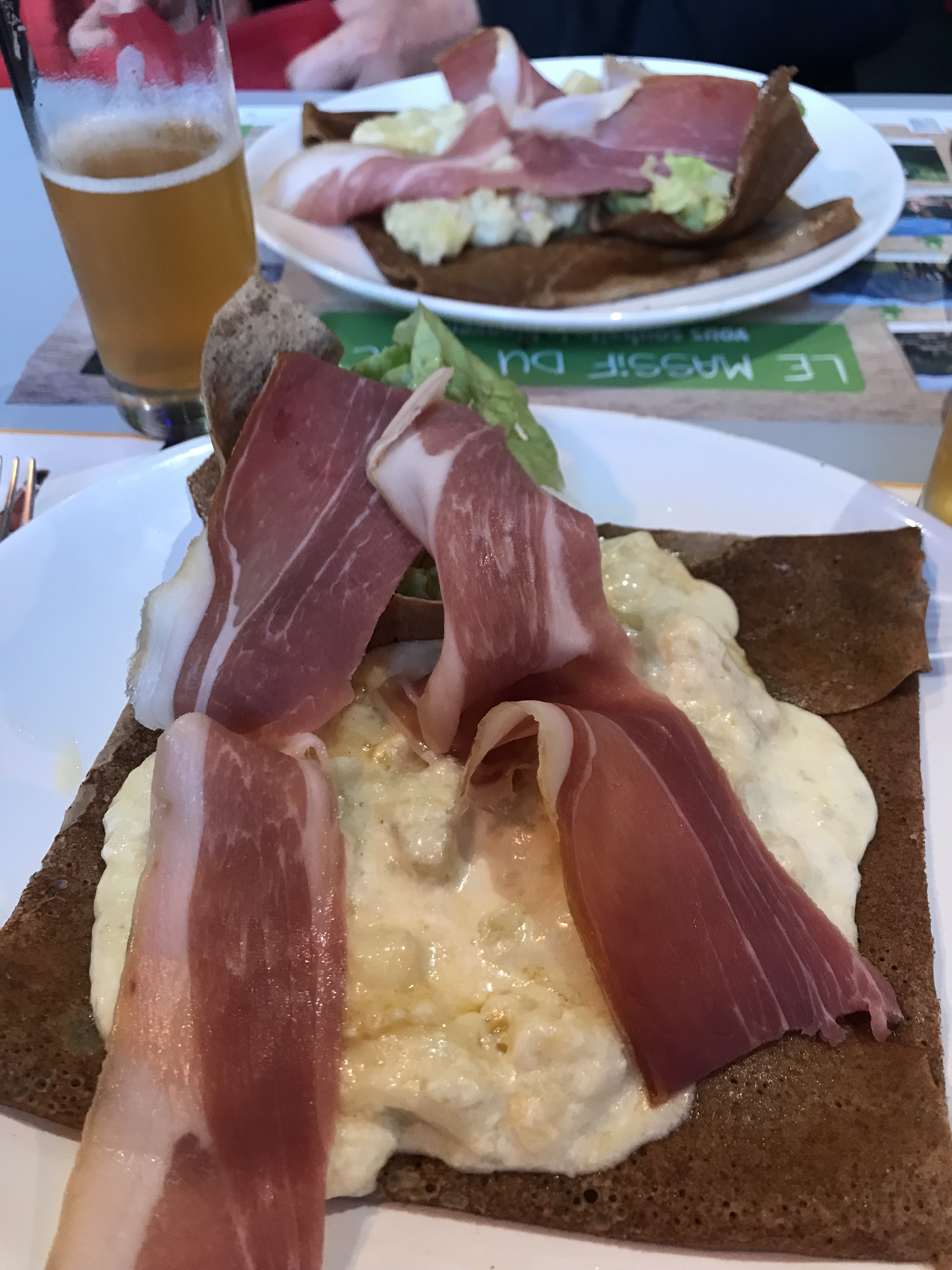 Parmi les premiers clients du soir (tous les autres restaurants du Mont Dore étaient complets), je n'ai pu choisir une des crêpes proposées à la carte (crêpe à la saucisse au chou), la crêperie n'ayant plus de saucisse. Je me suis rabattu sur une crêpe à l'aligot : crêpe trop cuite, avec comme accompagnement quelques feuilles de salade sans possibilité d'assaisonnement. Le jambon de pays n'en avait que le nom. Un couple attablé près de nous a voulu également commander des crêpes à l'aligot. Réponse du patron : je n'ai plus de jambon de pays, je n'arrive pas à en avoir, je peux vous proposer de le remplacer par du jambon blanc. Ce qu'il a fait en sortant des tranches d'une barquette plastique. Franchement, c'est se moquer ouvertement de la clientèle : du vrai jambon, ça ne manque pas dans les environs, à commencer par le marché de Mont-Dore ! Le dessert a été pris ailleurs.