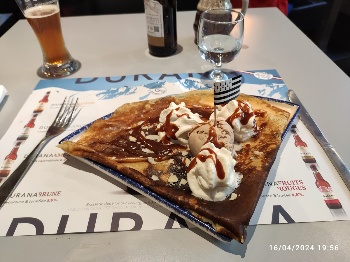 Un cidre à la pression excellent, des crêpes bretonnes en spécialités auvergnates à découvrir absolument et des crêpes dessert aux pommes et caramel, une tuerie ! Un service au top et le soleil en plus, bravo.