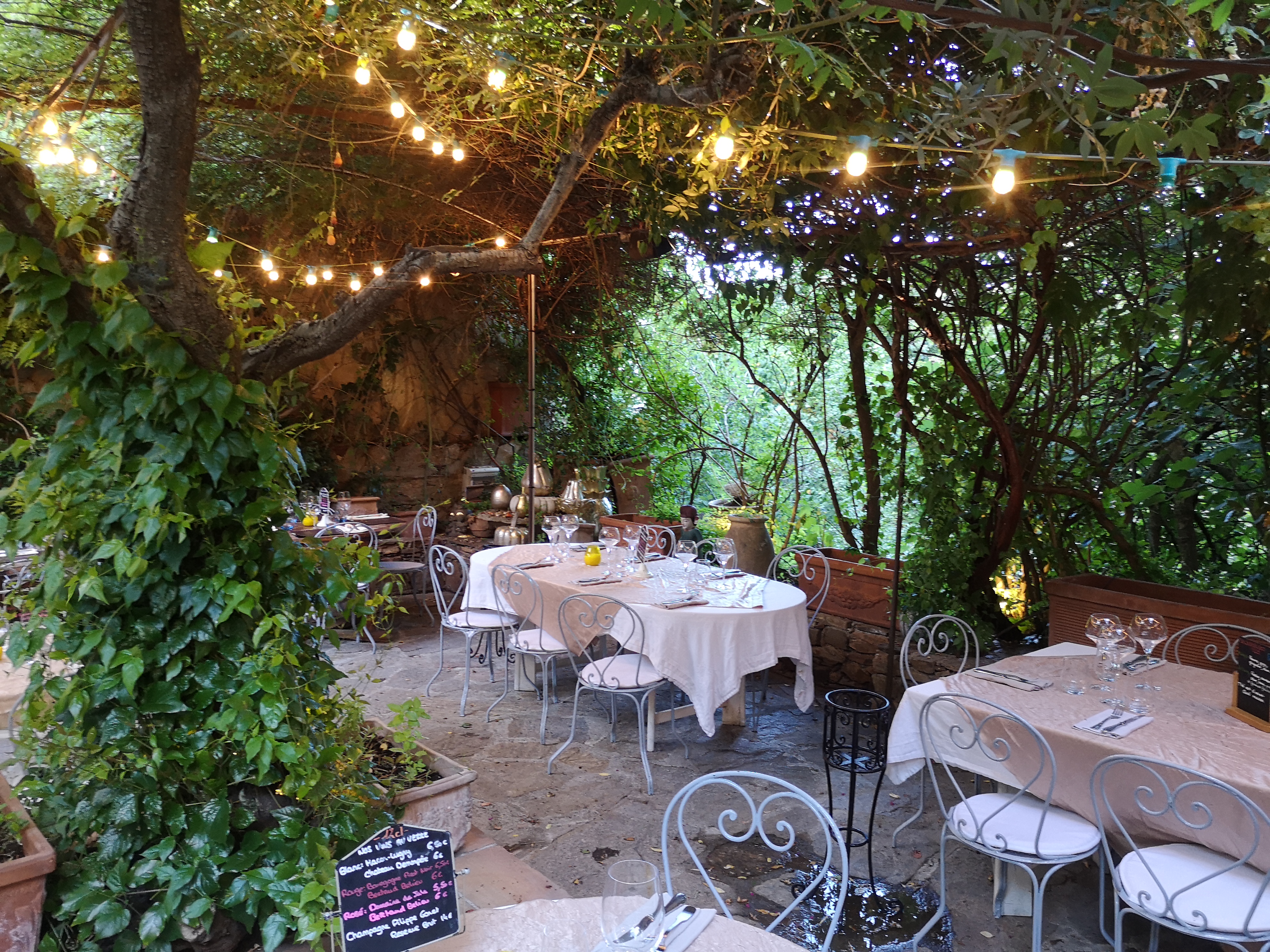 Terrasse ombragée sous les glycines très agréable repas au niveau du prix je recommande