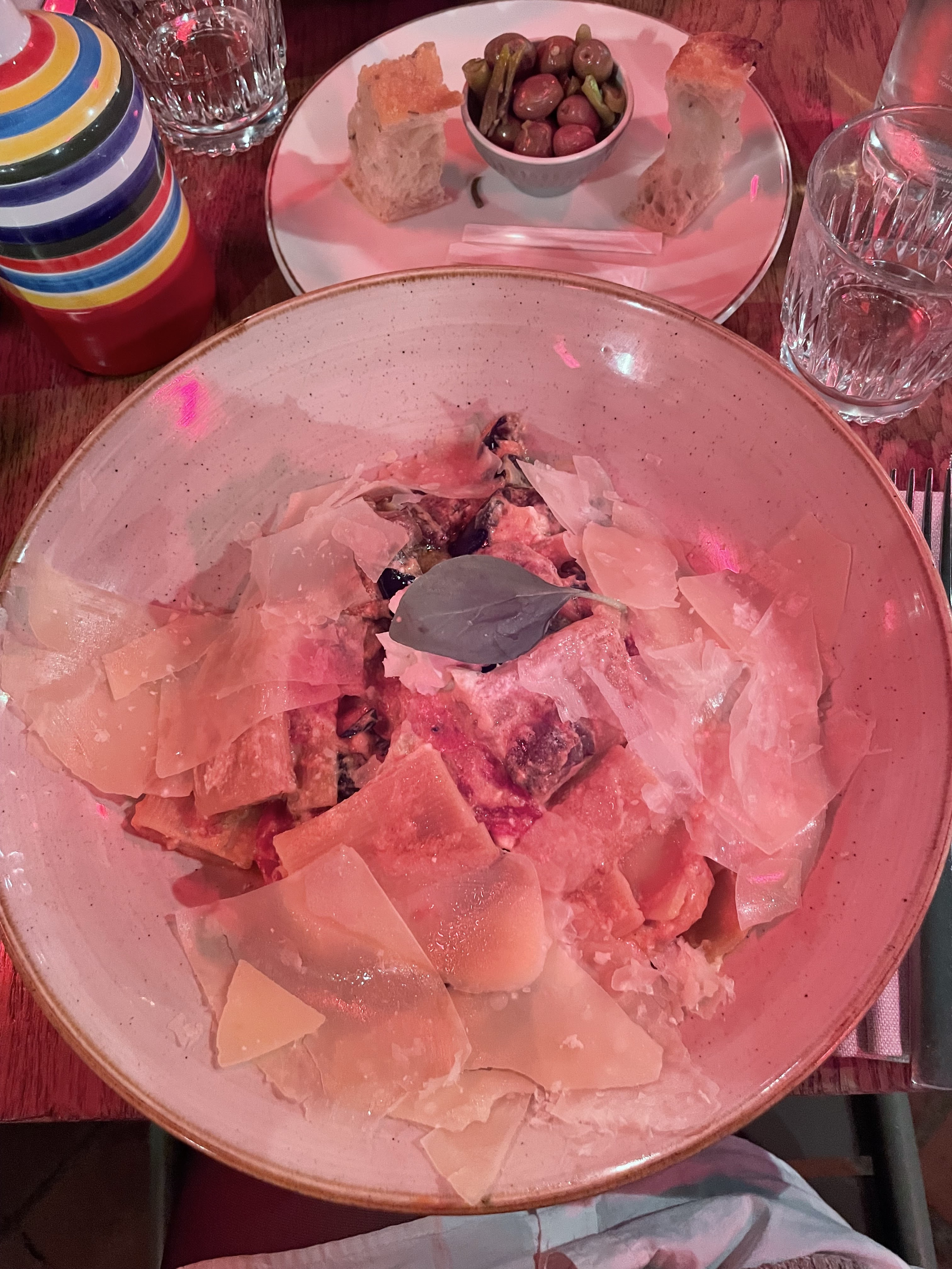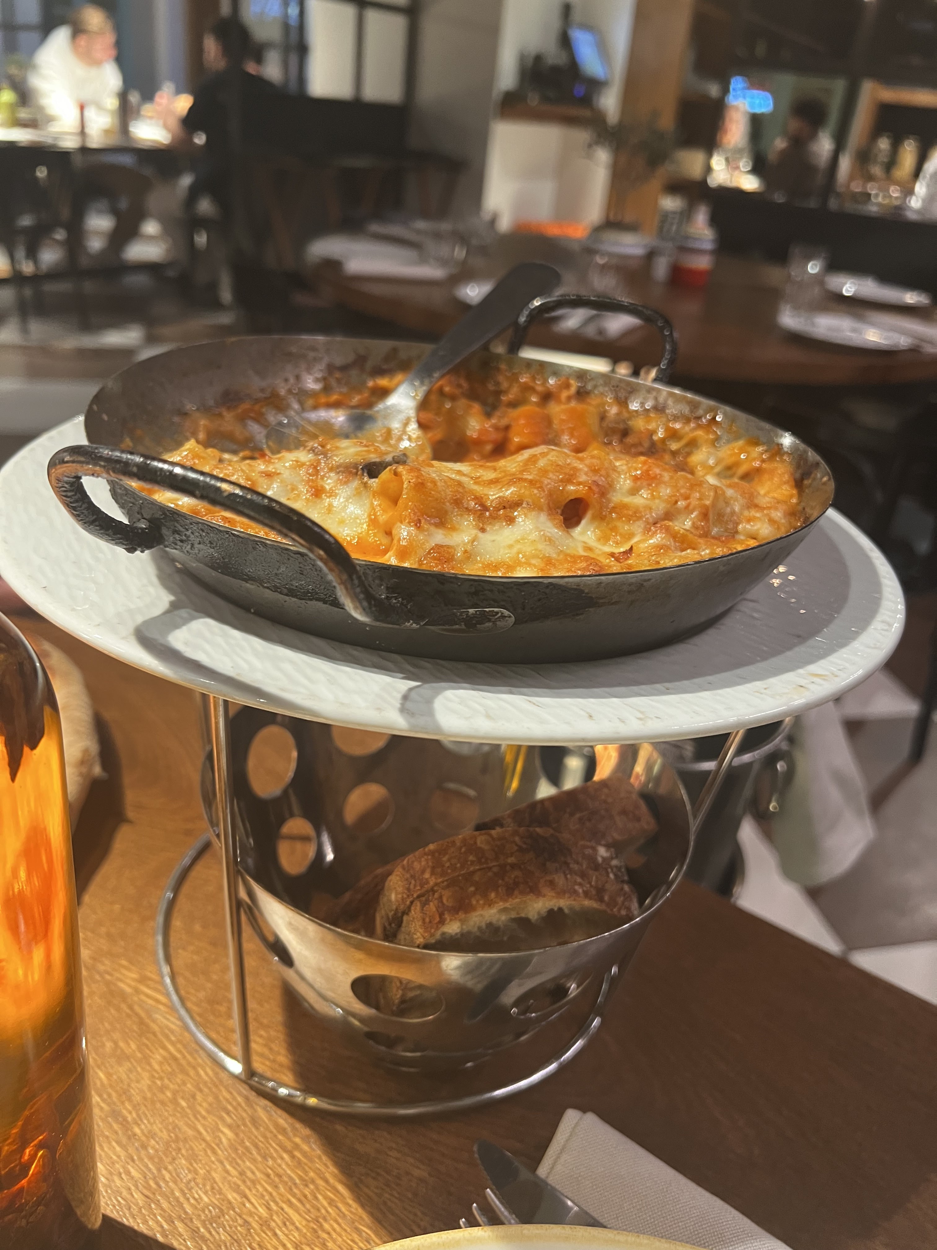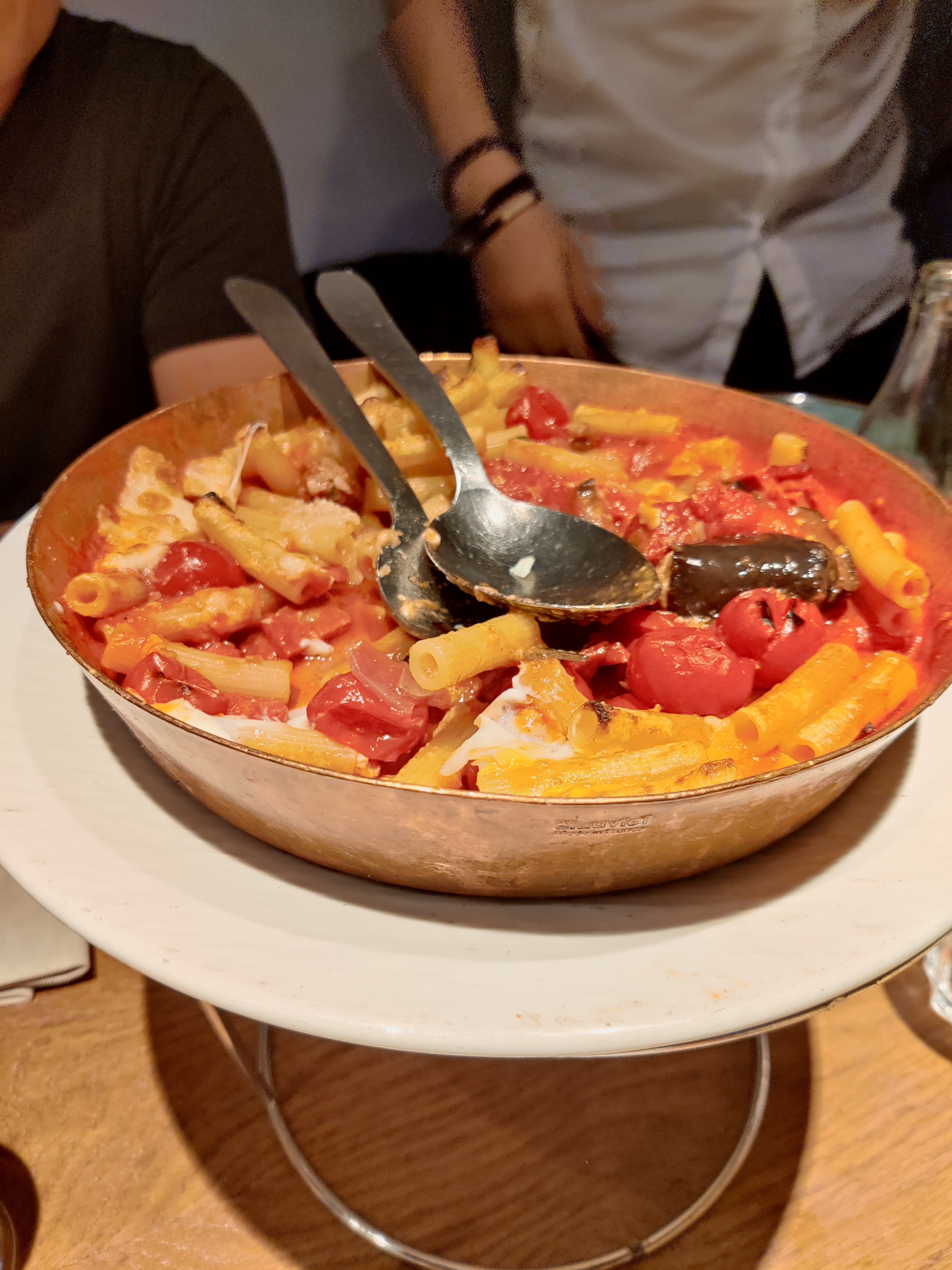 Je mets 5 étoiles car j'ai vraiment beaucoup apprécié mon plat. Mes Rigatoni à la sauce tomate étaient délicieuses. Néanmoins, je mettrais quelques bémols : - le service. Les serveurs ont en effet une attitude un peu cowboy. Le serveur m'a directement servi sans me demander. Je comprend que c'est pour le style/show mais j'aurais bien aimé qu'on me demande mon accord avant. Je souhaitais avoir une photo de mon plat en entier. -Une de mes amis avait demandé le plat du jour, une mini côte de bœuf, elle la voulait bien cuite. Le serveur nous avait prévenu que le cuisiner ne faisait pas ce genre de cuisson. Et en effet, aucun effort n'a été fait. La viande était bien saignante. Je trouve cela dommage, surtout pour un restaurant qui doit aussi attirer beaucoup de touristes. Il faut respecter le client. -Les quantités pour les plats de pâtes. Même si cela est possible d'emporter les restes en doggy bag (ce que font la majorité des gens d'ailleurs), je ne trouve pas cela très sain car cela insiste les gens à manger beaucoup plus que ce qui serait raisonnable/recommendable. Niveau rapport qualité/prix, avec cette possibilité de doggy bag, cela reste très intéressant (16€ le plat). Cependant, je ne cherche pas à avoir un doggy back quand je vais dans ce genre de restaurant.