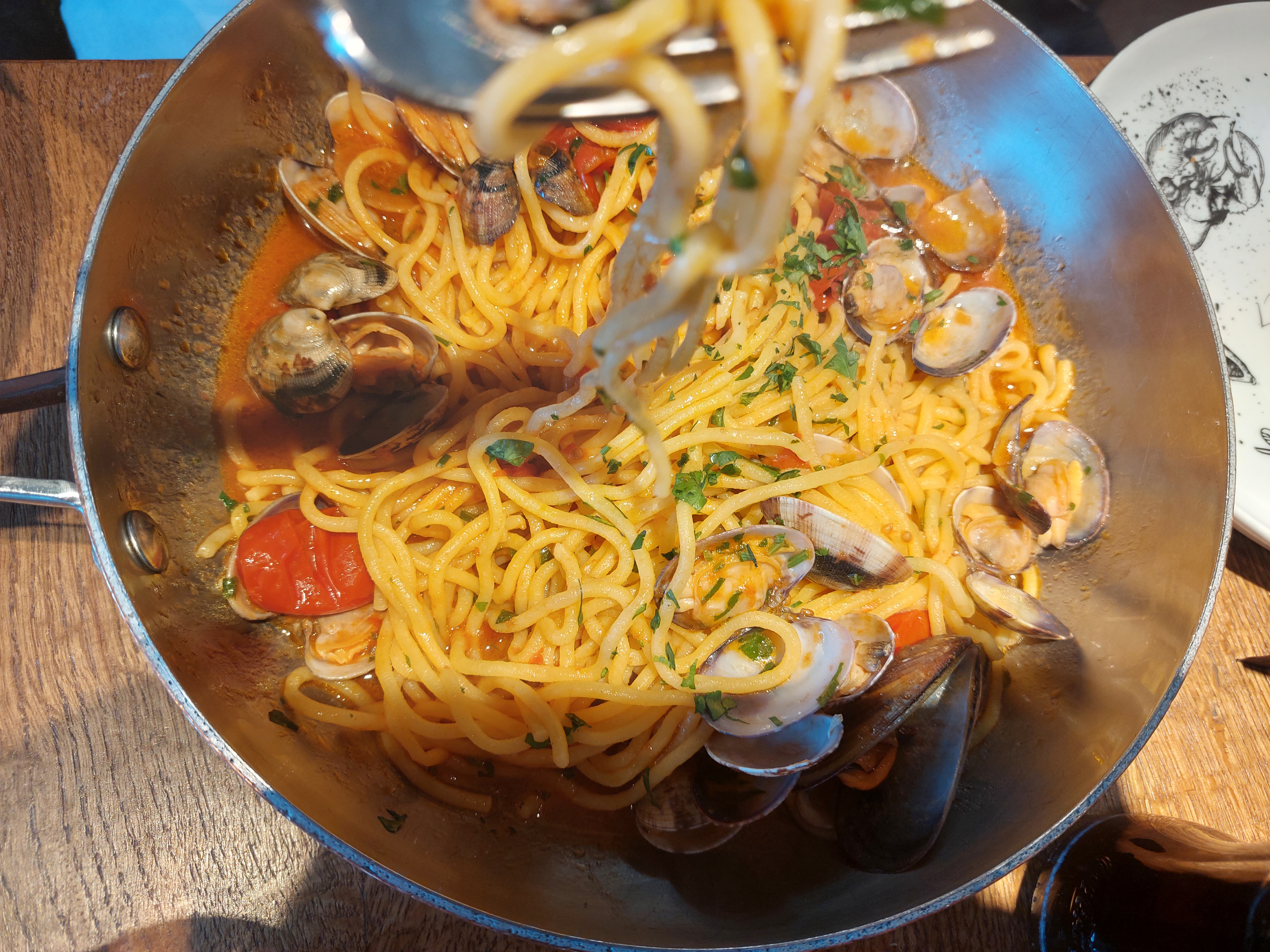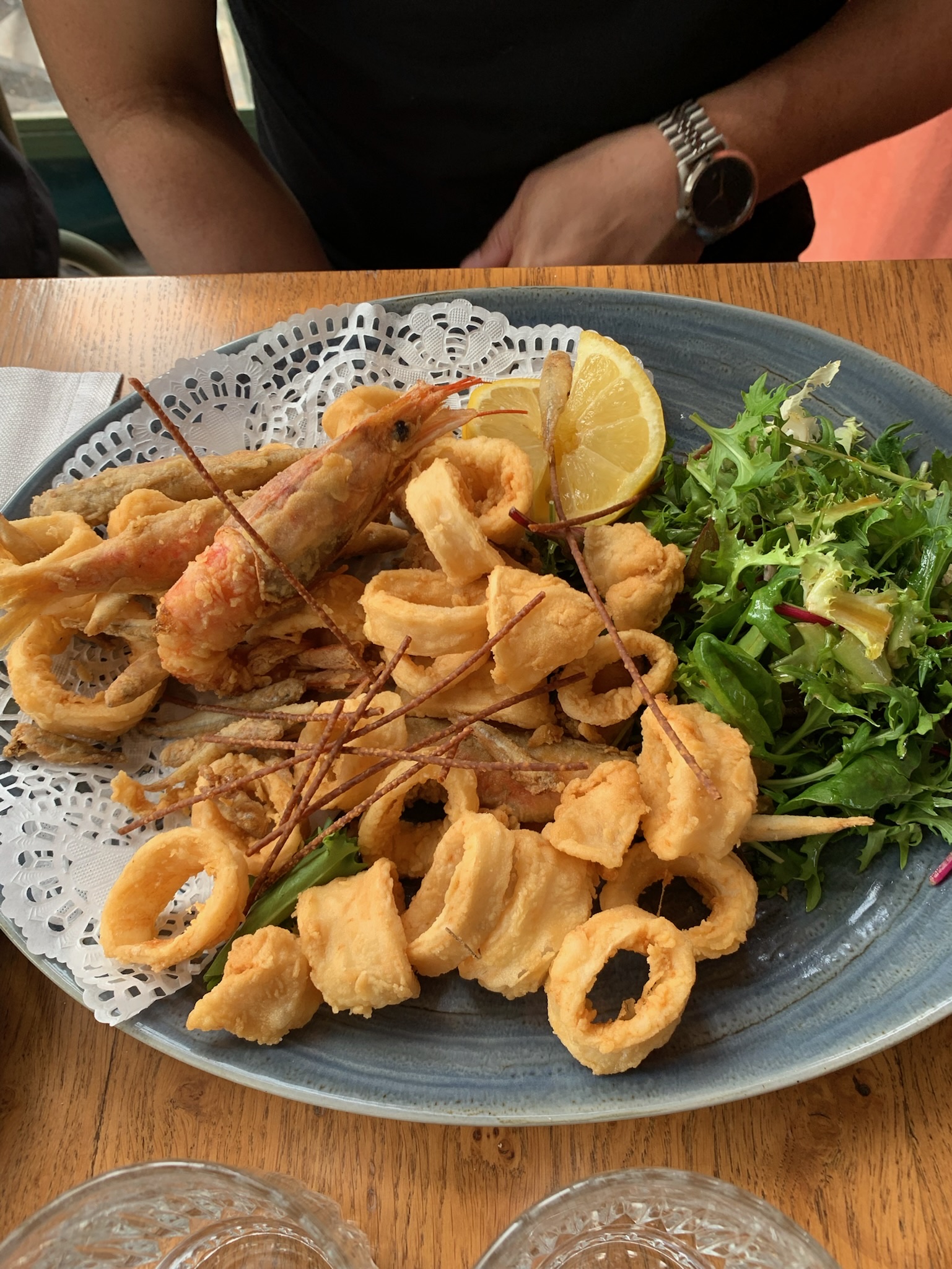 Équipe de service est agréable et efficace, malgré beaucoup de clients (on est arrivé vers 19h et a fait la queue pendant 15min pour avoir une place), le service des plats est très rapide. Les portions sont très très très généreuses, voire un peu trop, car c'est un peu difficile à finir pour une personne. Le fritto mixto très bon, par contre la salade un peu trop salée et huilée. Les spaghetti aux fruits de mer sont également corrects, les pâtes ont une bonne texture et les fruits de mer plutôt frais, un peu moins de sauce tomate et plus de persil et je pense que ce sera encore meilleure. En conclusion, belle terasse, super service, bonne nourriture, portion un peu trop grande.