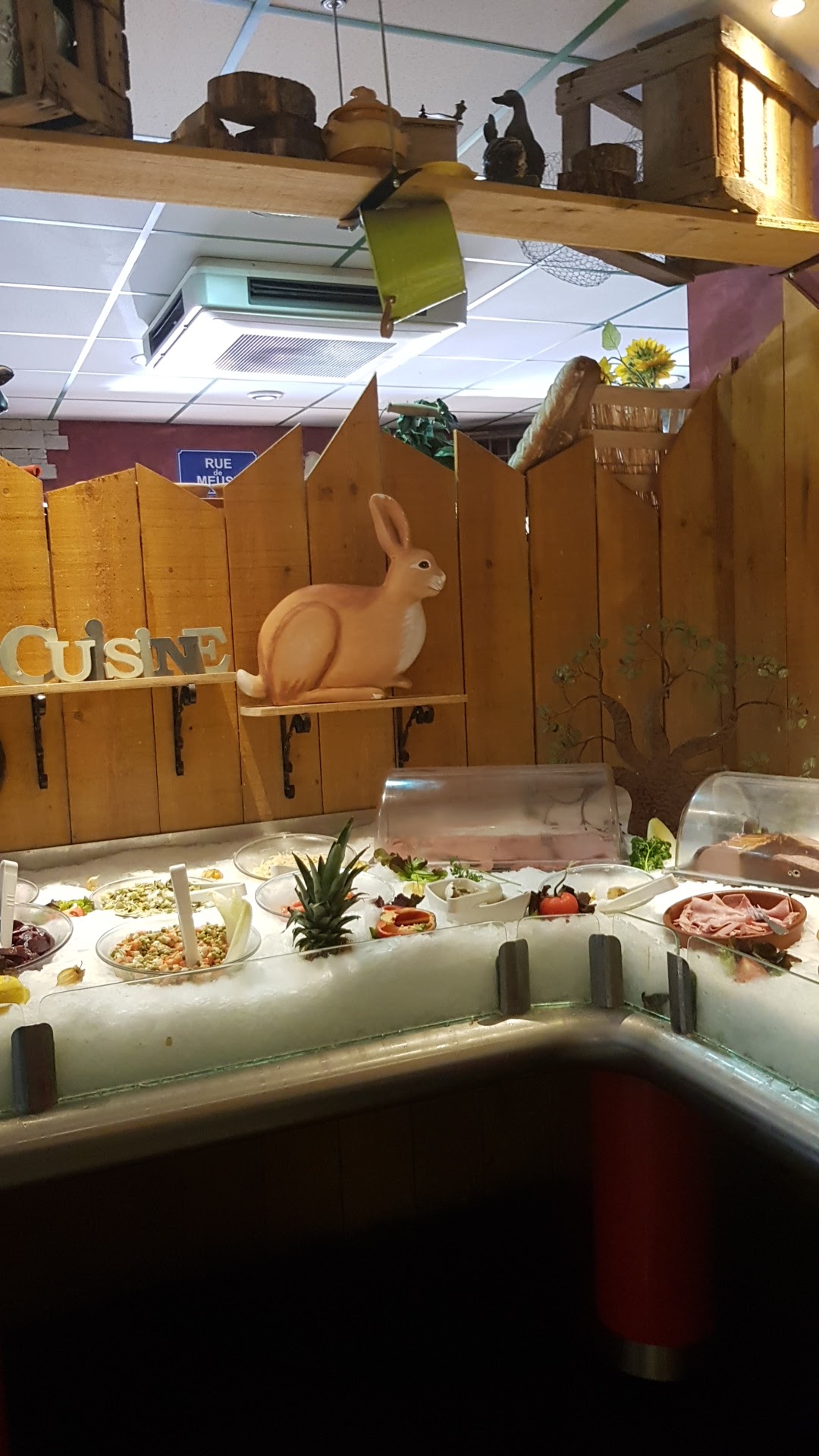 Superbe buffet entrées, fromages, desserts et plats très savoureux. Eaux gazeuse et plate fraîche gratuite. Accueil très sympathique.