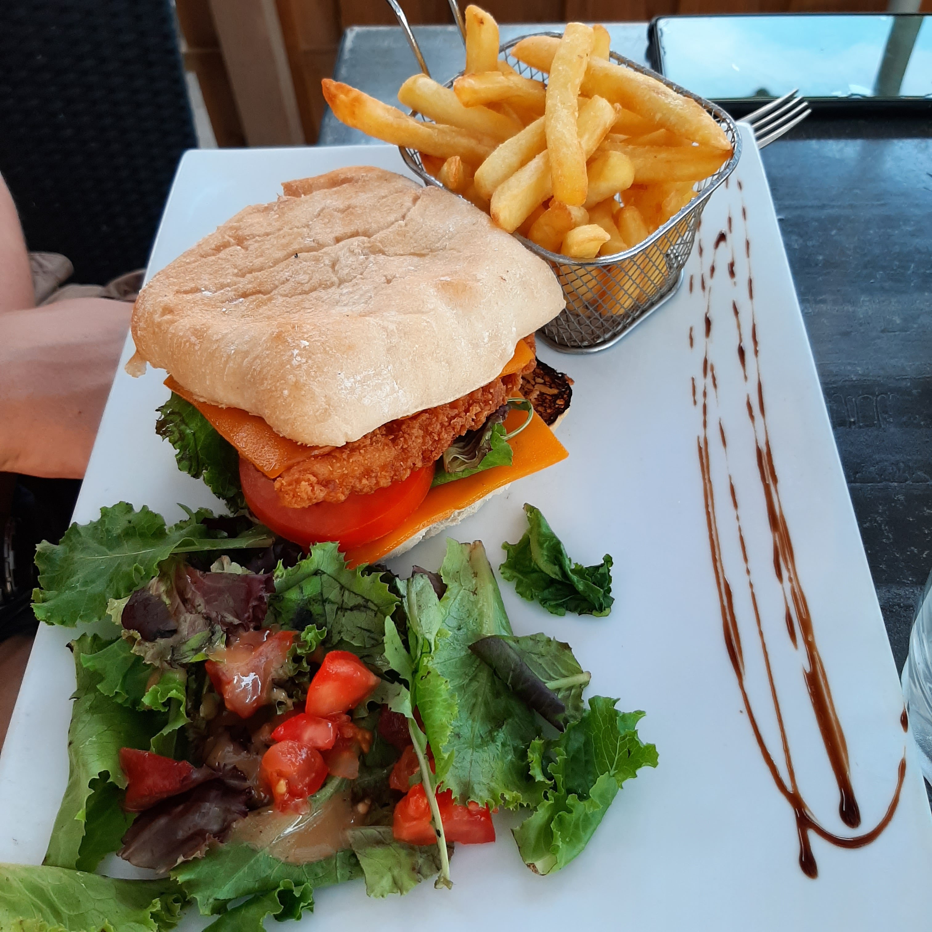 tout c'est bien passé jusqu'aux plats...sur la carte il y a notre super krispy chicken burger''' a 18€...le pain burger sorti du paquet...une bousine de sauce, une rondelle de tomate...un peu de salade et du poulet pané 1er prix jeté ds la friteuse...bref pas d'oignons....pas de fromage..pas de pain toasté....rien d'un burger je l'ai fait remarqué mon assiette est repartie en cuisine....j'ai eu le droits aux regards noirs des cuistos! un désolé aussi ...j'aurai honte de servir ça....bravo pour votre marge bien grasse moi je sors avec ce qui m'a été servi un cout de reviens a 4 ou 5 euros...pour 18 e vendu...bref belle arnaque...le sentiment de se faire prendre pour des vaches a lait...la satisfaction des clients et la gestion de mes remarques n'ont pas été entendus...bande de voleurs. pour boire un verre surement pour y manger surtout pas. au faite a 10 balles le mojito vous pourriez piler votre glace et mettre un petit truc a grignoter...je vous conseil chers restaurateurs de revoir la definitions et composition de BURGER et MOJITO mais surtout de prendre en compte les remarques de vos clients même de passage et surtout apporter la reponse appropriée....un desole ne suffit pas qd la note pour 2 aperos 2 sodas 3 assiettes et 1 menu enfant pour 91euros