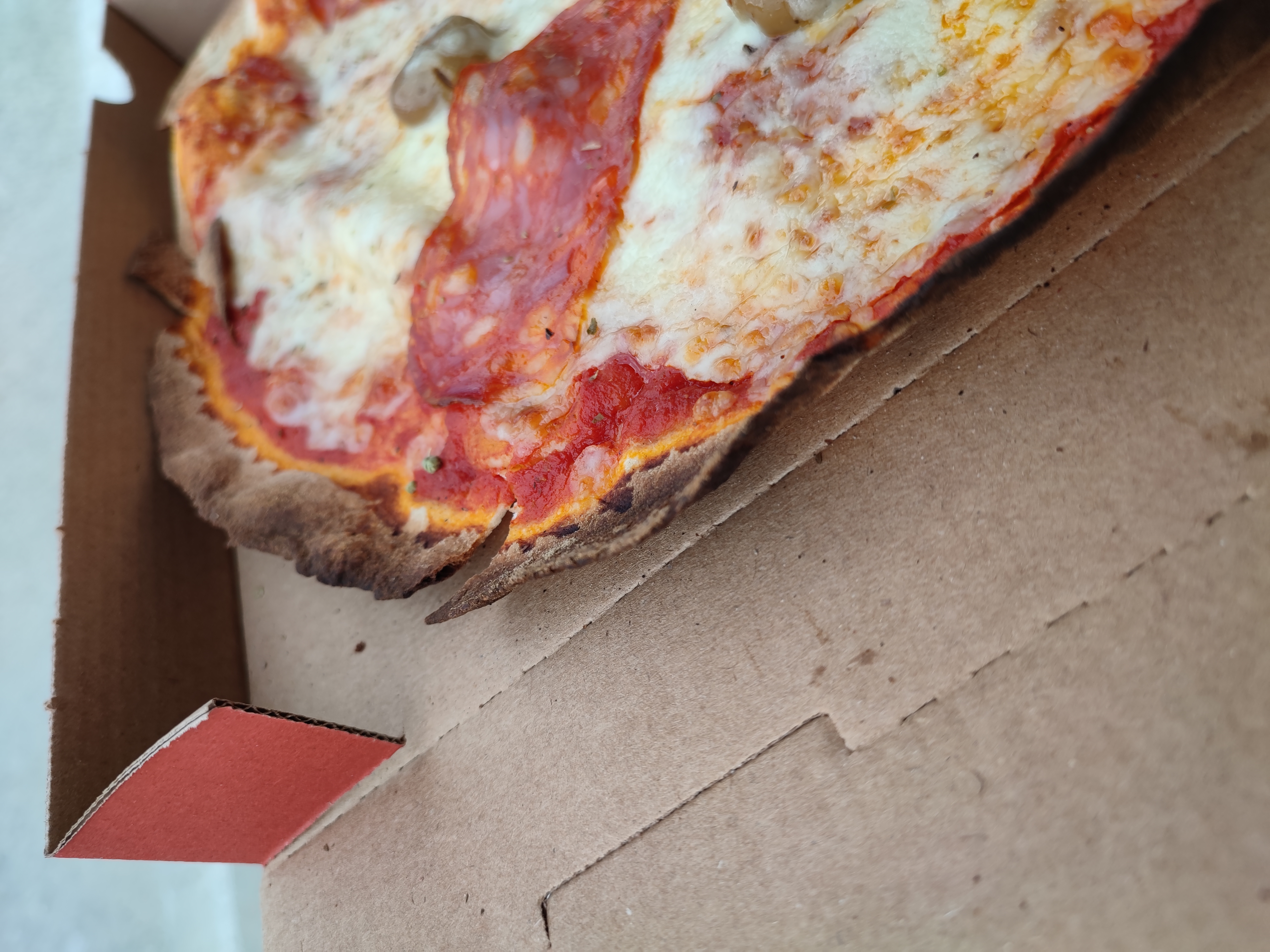 Pizza au contour complètement carbonisé déposée dans sa boîte en toute discrétion c’est à dire sans informer le client du triste état de son produit. Le salami est déposé n’importe comment (comme les olives) sur la pizza la rendant très difficile à partager. Si le goût était satisfaisant, la présentation lamentable de la pizza et l’absence d’excuses pour le contour carbonisé expliquent ma note.