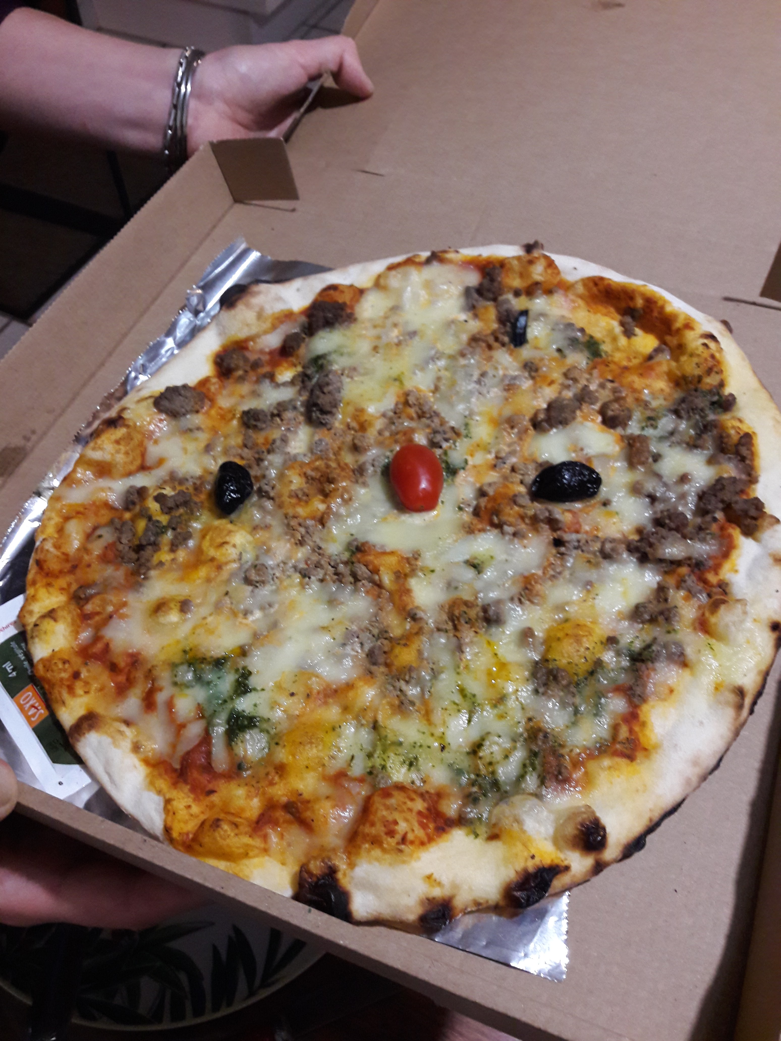 La pizza à emporter était très bonne. La viande de bœuf est fraîche et tendre. La pâte est fine et moelleuse.