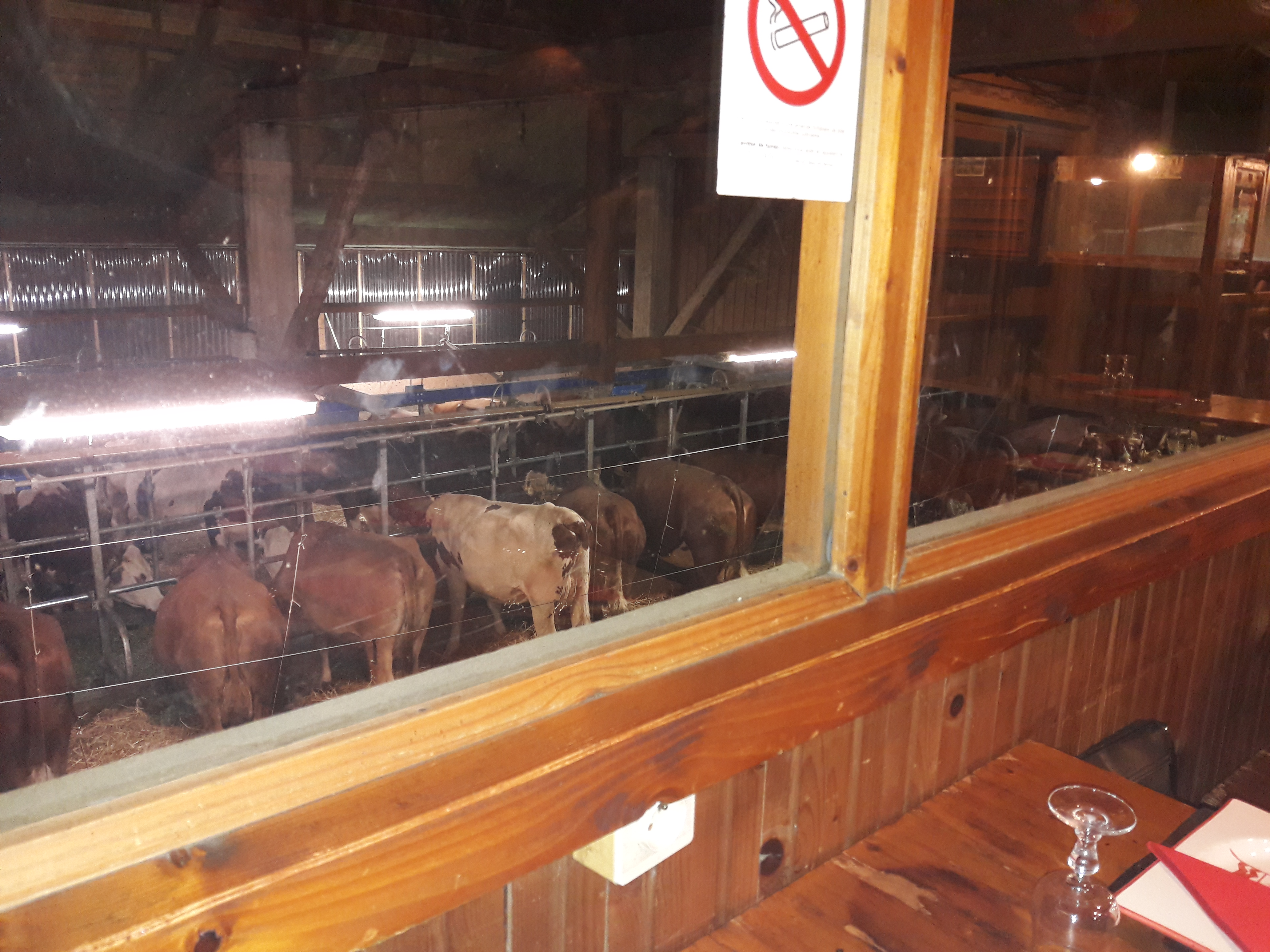 J'ai connu ce restaurant savoyard suite à un repas familial. Je n'ai pas été déçue par la nourriture, mais plutôt par l'ambiance et le service. En effet, la personne qui s'occupait de nous était trop autoritaire et ne savait pas s'organiser. Quant à l'environnement, il tient sa promesse, manger au-dessus des vaches... mais faudrait-il qu'on puisse voir correctement à travers les vitres tachées de projections de gras... les bouches d'aération étaient recouvertes de graisses et mal entretenues. Nous avons passé un repas dans la fumée qui se dégageait de tous ces appareils contenant du bois en train de brûler... les yeux nous brûlaient et ma belle-mère a même dû sortir prendre l'air tellement elle se sentait mal à cause de cette fumée ! La chaleur était également à la limite du supportable en novembre... Je mets 2 étoiles uniquement pour la qualité des aliments. Je n'y retournerai pas et ne conseillerait pas cet endroit à une famille avec enfants en bas-âge, les appareils présents sur la table étant très dangereux (risques de brûlures). Je ne conseille pas non plus aux personnes âgées sauf si elles sont encore souples. On est assis sur un banc qu'il faut enjamber pour prendre place et sans possibilités d'appuyer son dos. Je suis déçue car j'avais entendu beaucoup de positif au sujet de cet endroit.