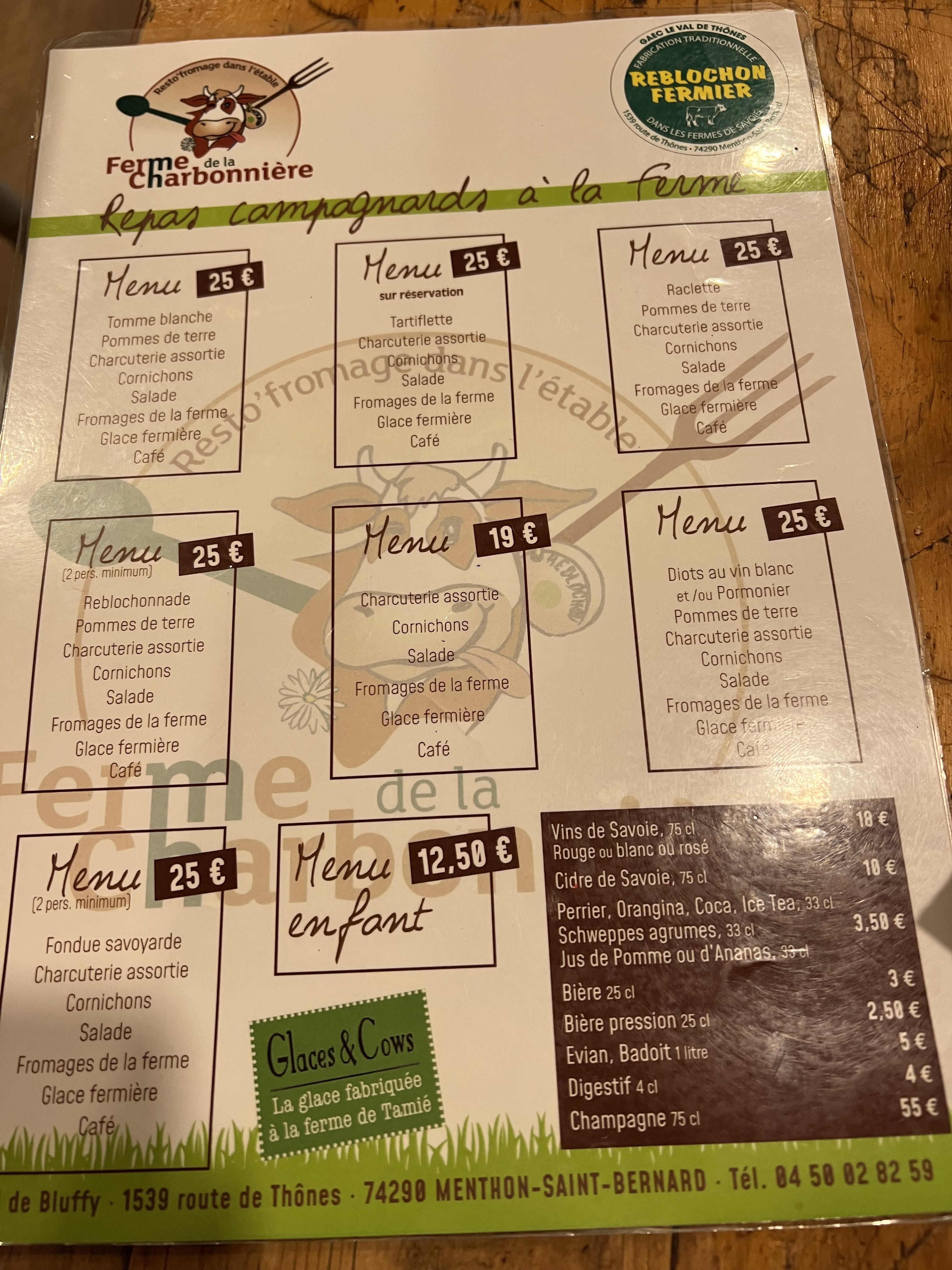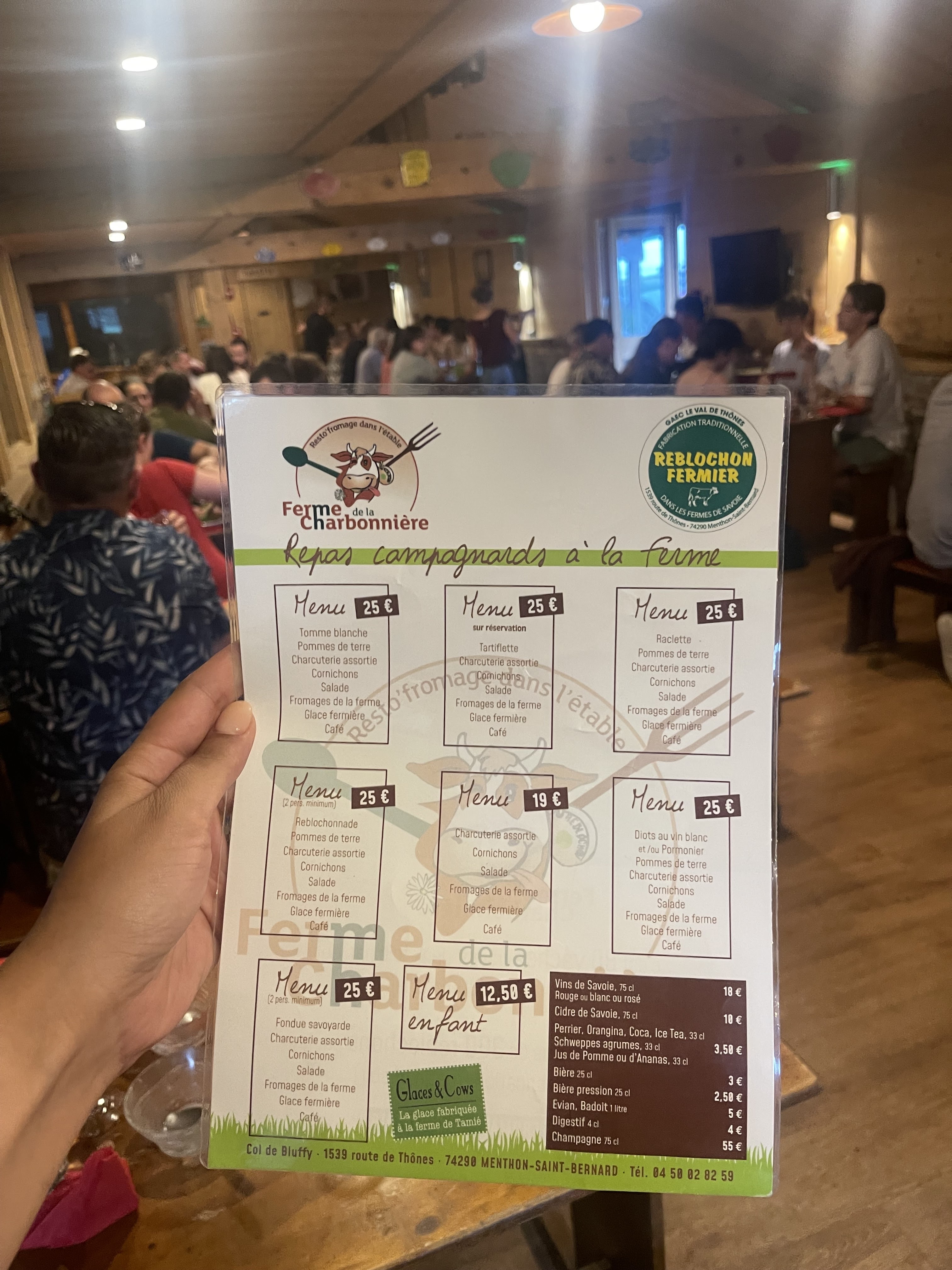 Ambiance savoyarde avec vue sur les vaches (la salle est en faite au-dessus de la grange!), reblochonnade excellente avec le fromage de la ferme (la raclette n'est pas de la ferme par contre). Menus à 25€ tout compris (fromage, charcuterie, salade, plateau de fromage à la fin). Très voir trop copieux, nous n'avons pas pris le plateau de fromage après le plat principal. Service rapide et serveurs efficaces, merci pour ce très bon moment !