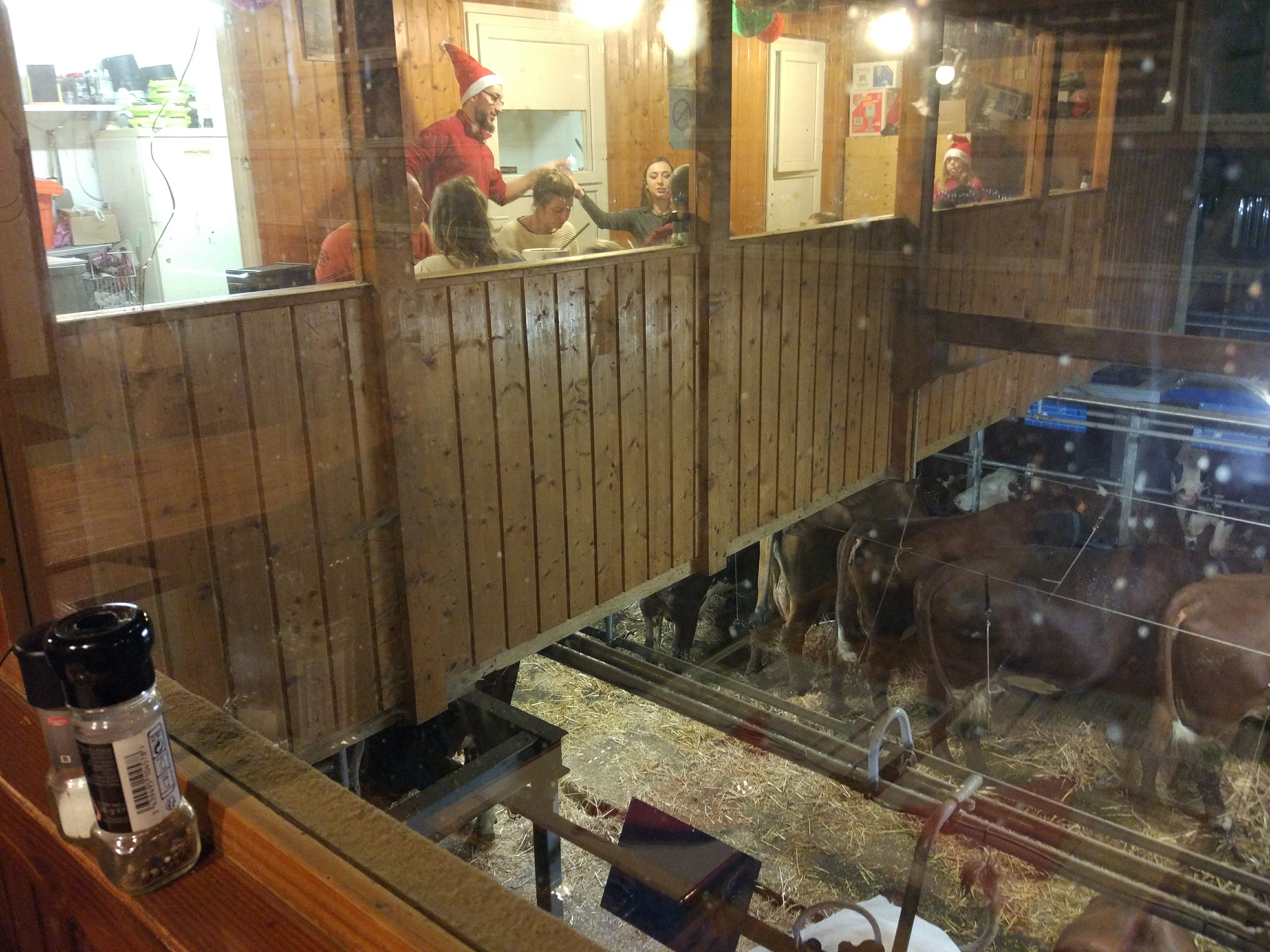 Un endroit insolite à la bonne franquette ; on mange au dessus de l étable et on peut y voir tout ce qu il s y passe.