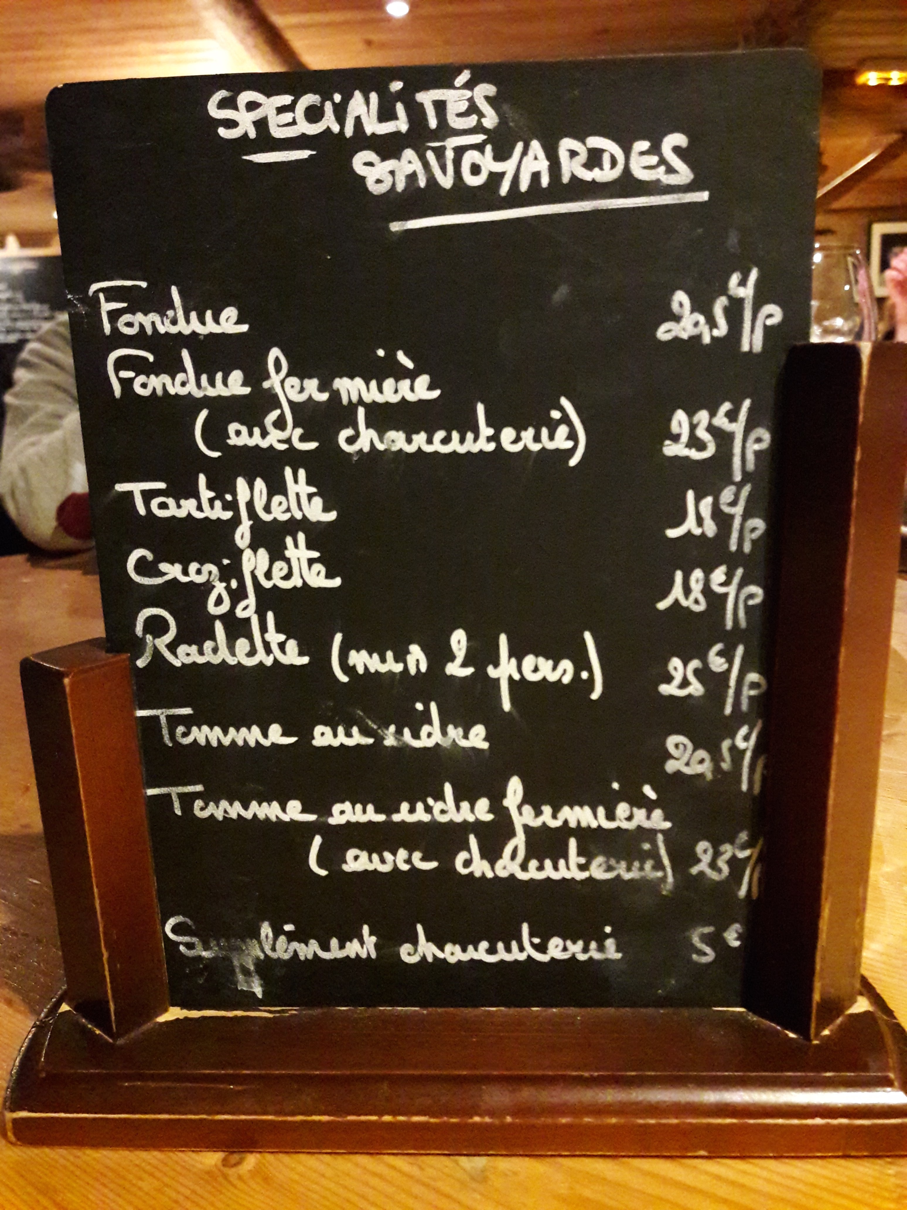 Nous avons pris une fondue a la tomme de cidre et une tartiflette. La fondue était très bonne et les quantités étaient bien pour une personne. Pour ce qui est de la tartiflette, il n'y avait pas assez pour une personne. Les prix sont convenable pour la qualité des produits.