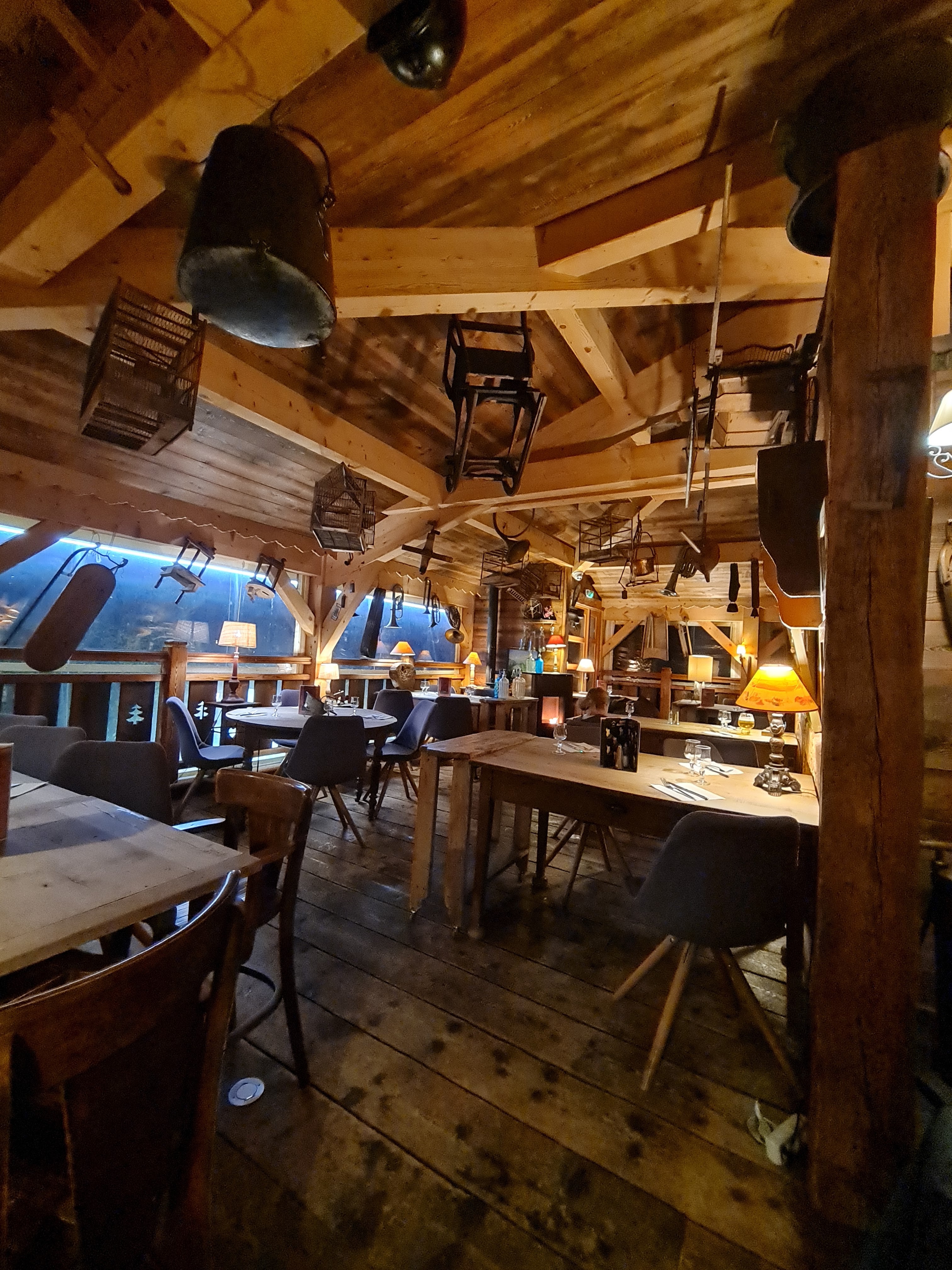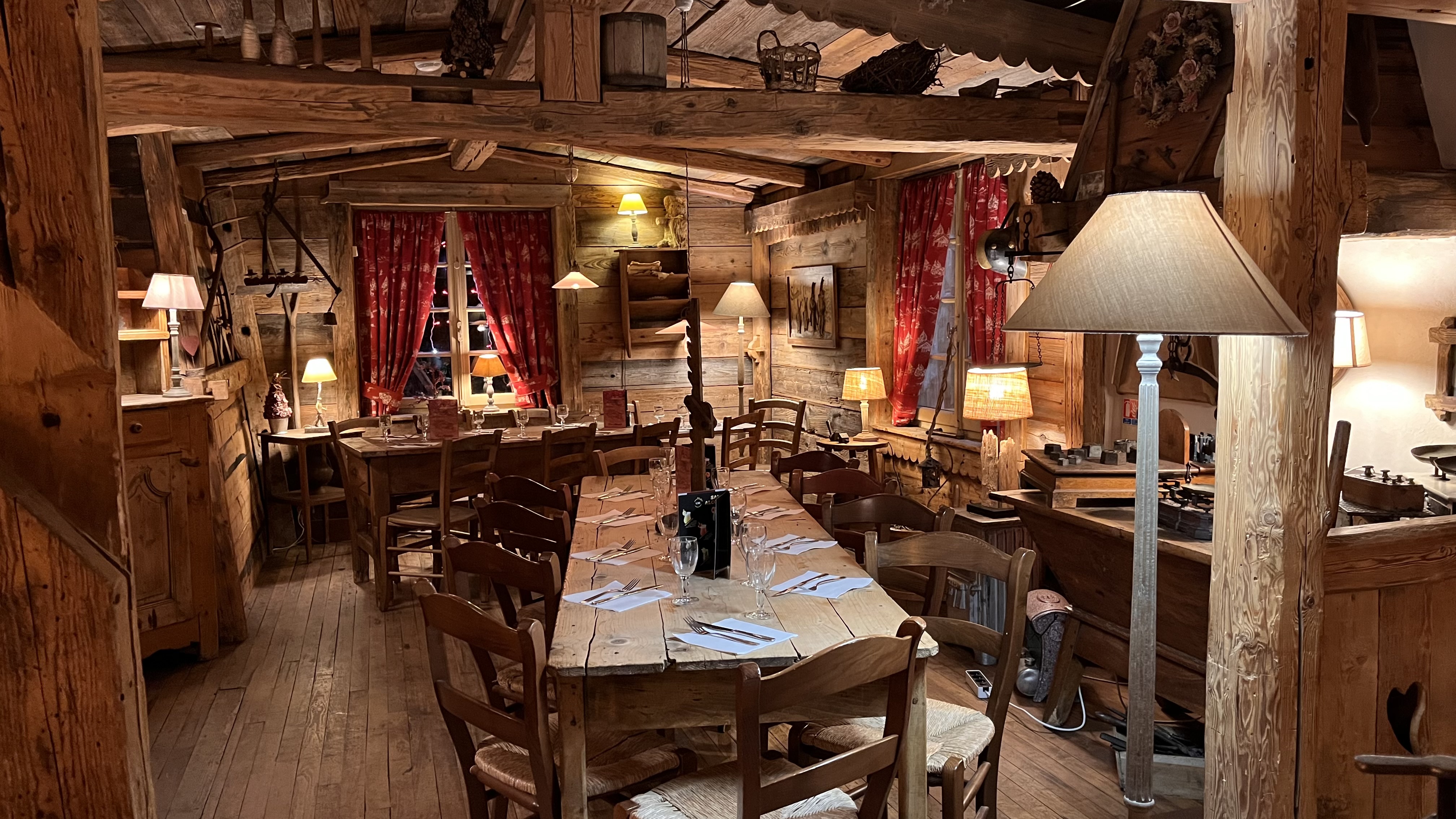 Ambiance chaleureuse dans un restaurant savoyard authentique.