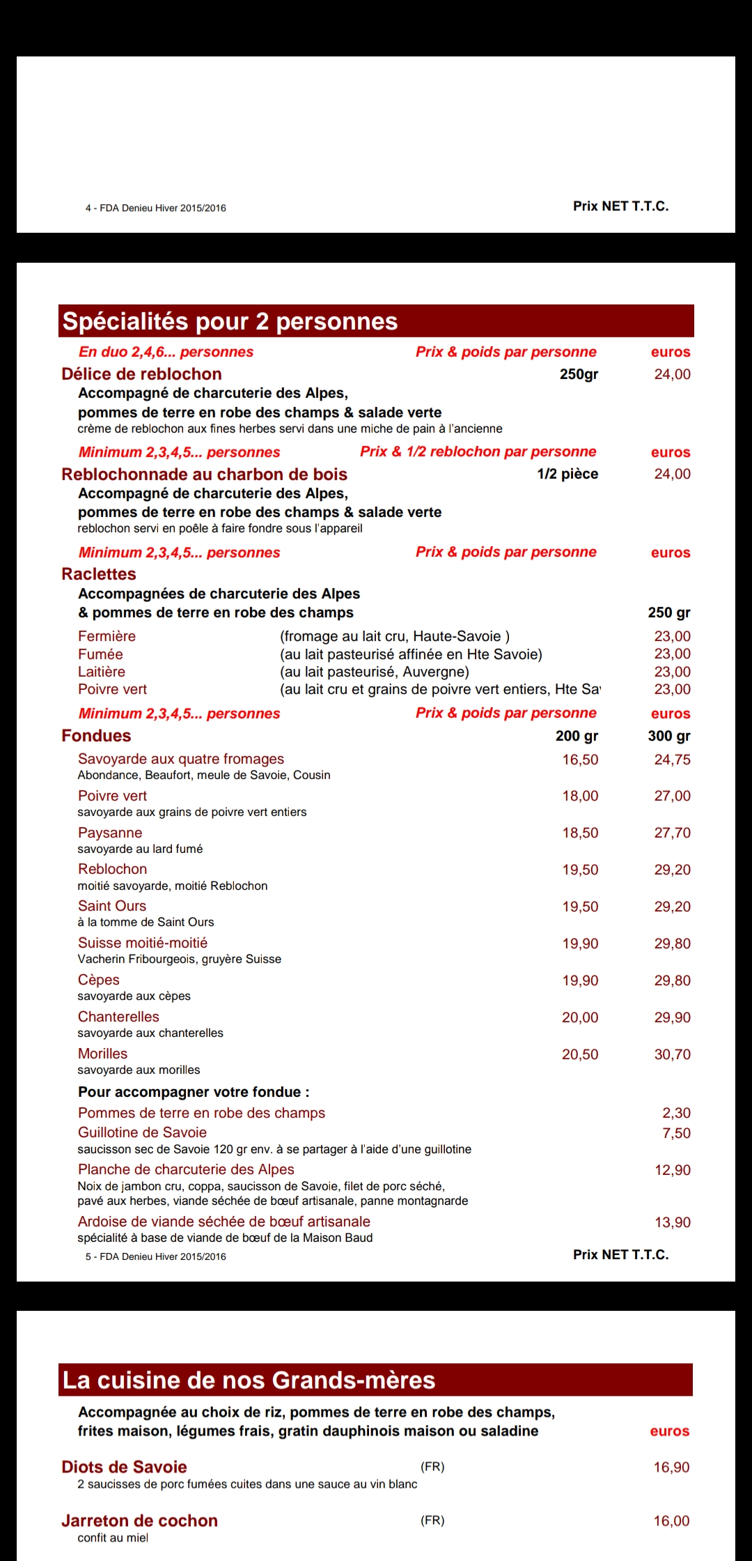 Ambiance froide !!!! Accueil froid les serveurs et le patron pas de sourire repas médiocre !!!!! filet de perches qui baigne dans de l huile et non du beurre !!! , la présentation de l assiette laisse à désirer les filets de perches trempaient dans l huile !!!! frites pas faites maison !!! du congelées !!!je ne recommande pas !!! Cher pour la qualité et la quantité. Pas de parking Par contre décoration du restaurant très jolie bien dans le thème Savoyarde