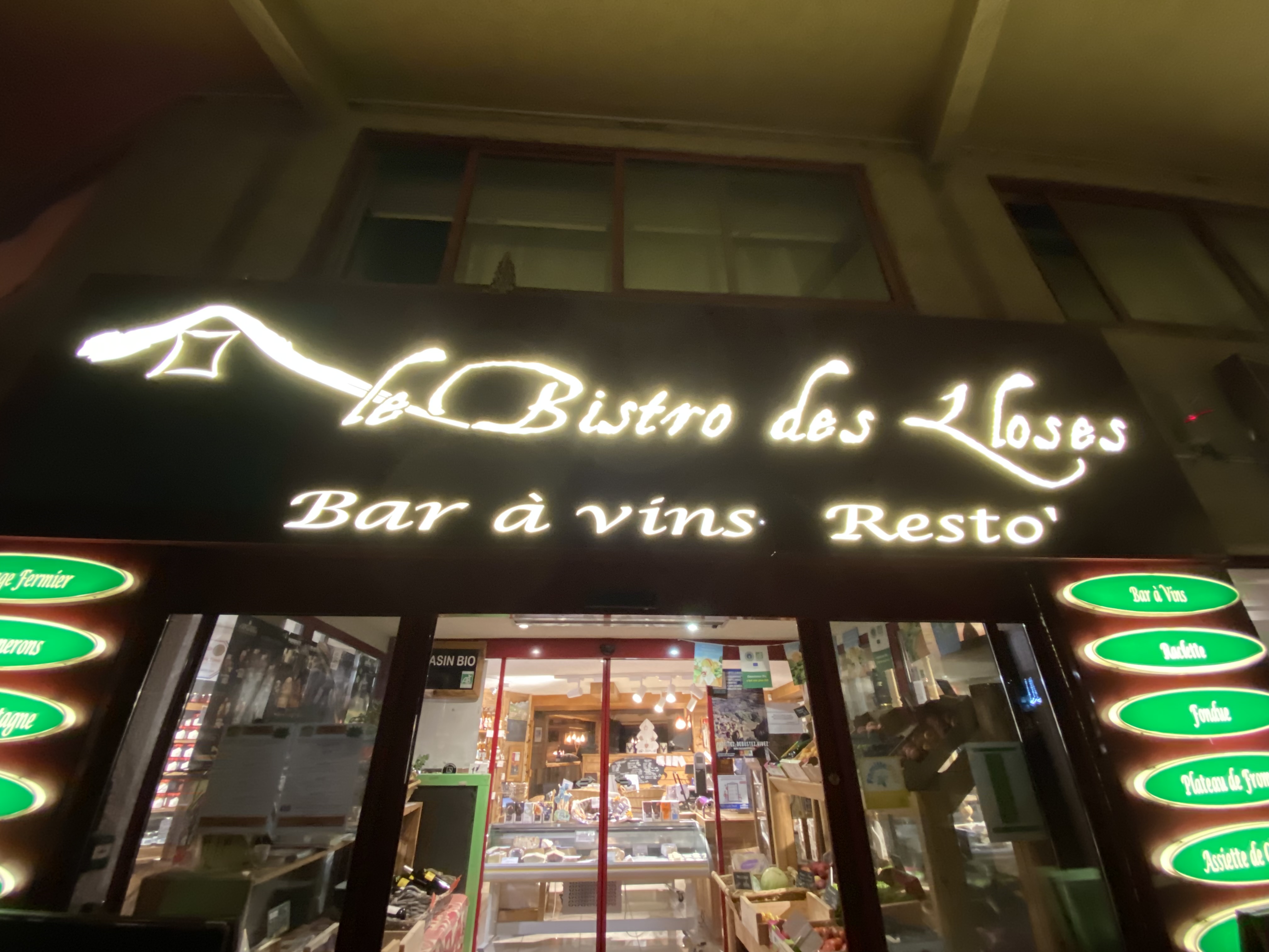 L'endroit est polyfonctionnel : il y a un coin épicerie où l'on peut acheter des produits bio et du terroir, un espace avec des tables hautes et une belle cave, et enfin un restaurant. On peut déguster de fondues, des spécialités régionales beaucoup à base de fromages et de charcuterie locale. Excellent !