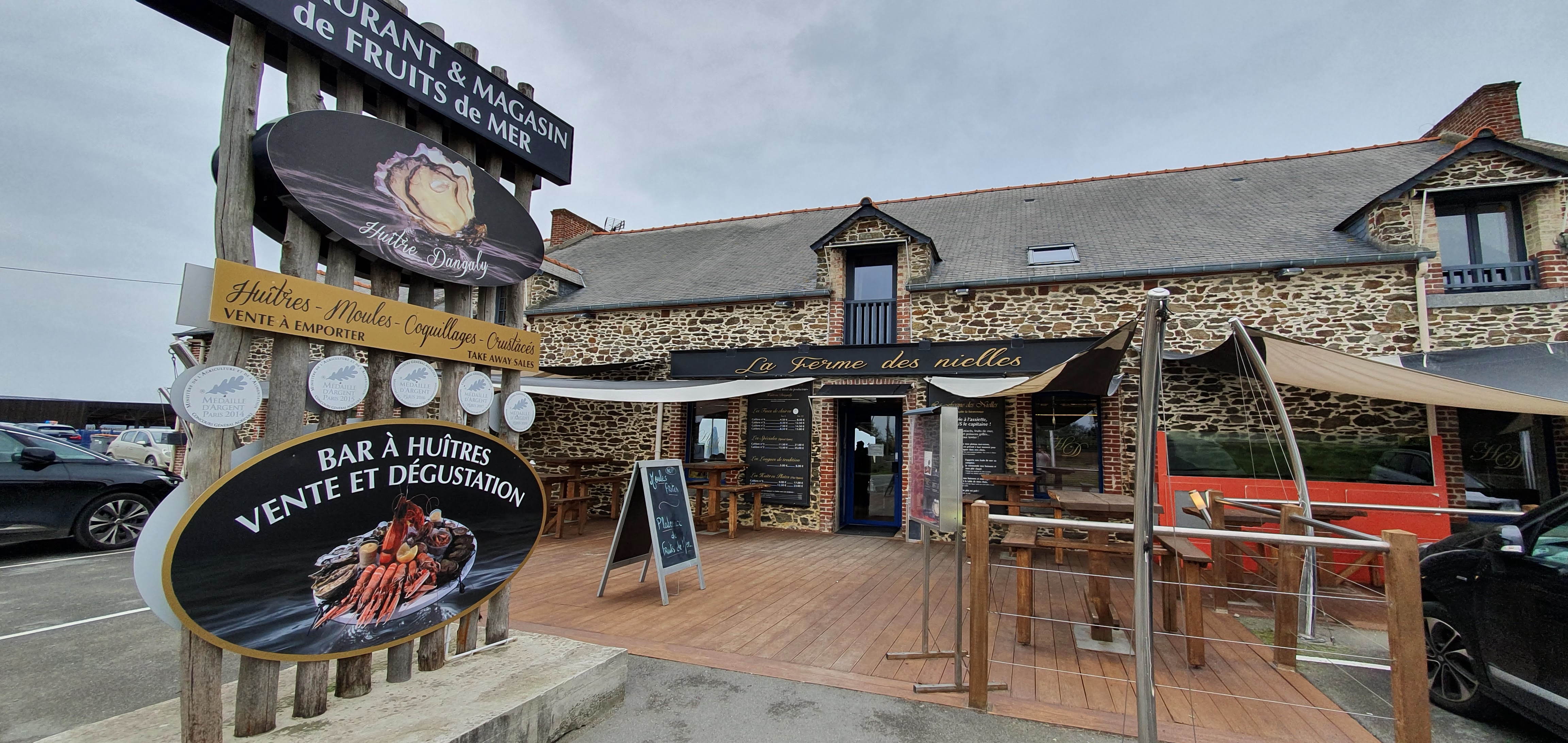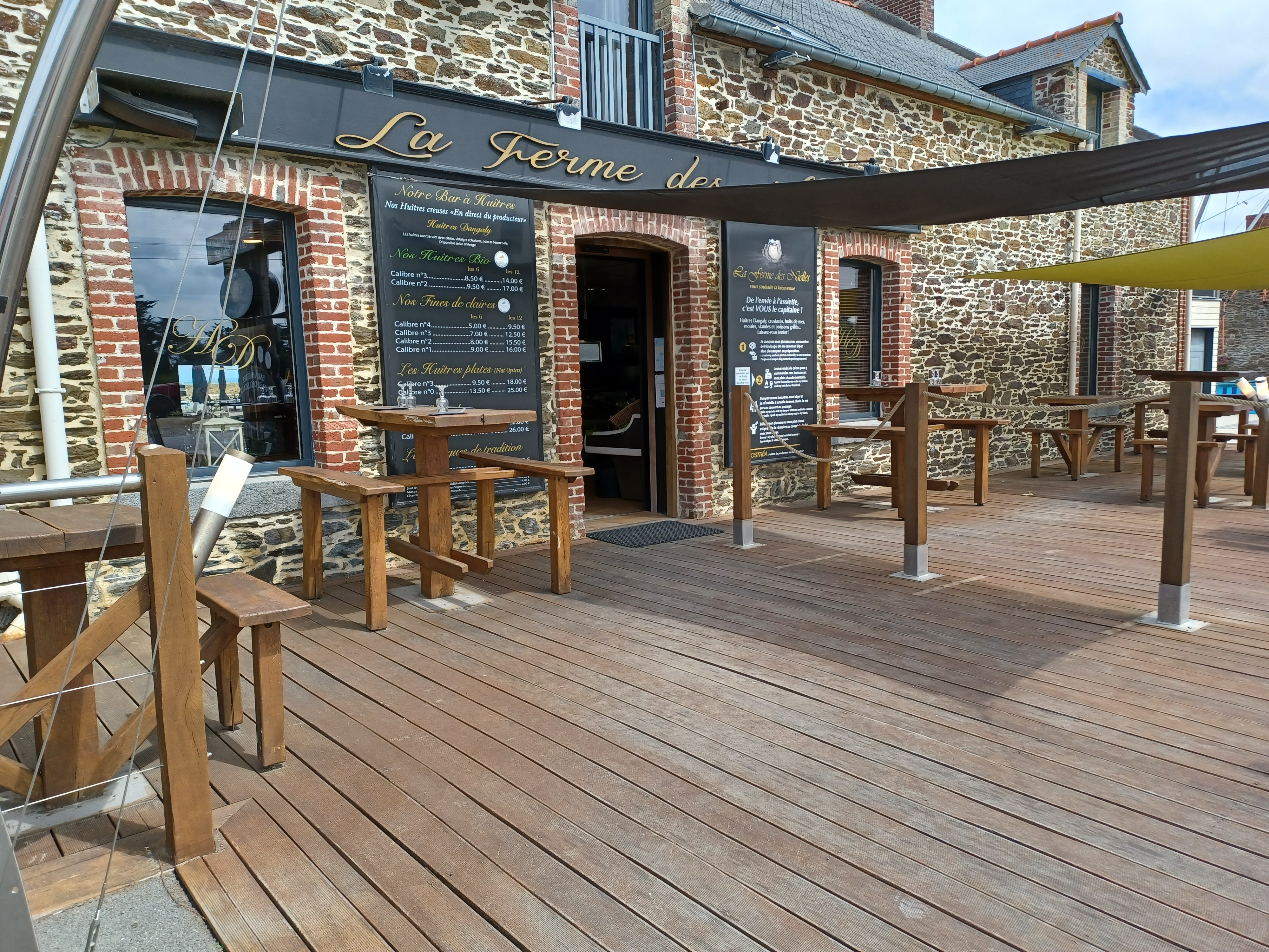 La ferme des nielles,saint meloir des ondes .. Coquillages un peu excessif, pour l endroit où on ce trouve ,on arrive on choisi les fruits de mer , on paye et ensuite un biper nous averti que c est près , les couvert au clients de mettre sa table , en résumé vous payer avant, vous installer assiette et couvert sur votre table , est prix excessif , nous pensons être tomber dans un pièges à touristes. seul point positif coquillage excellent