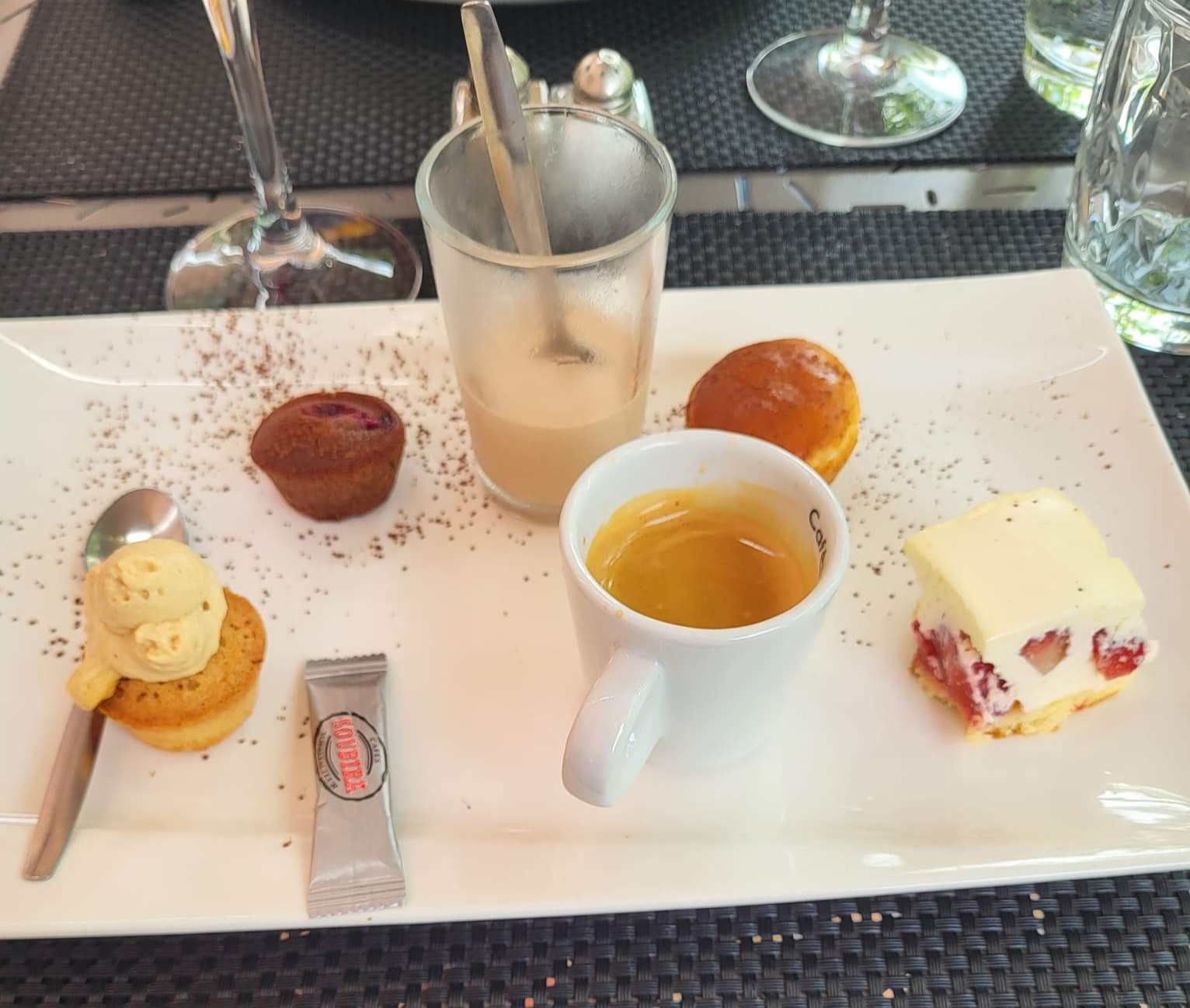 Cadre extérieur très agréable. Service agréable avec un personnel sympathique. En plat j'ai pris le filet de bar grillé, pâtes aux pousses d'épinard. Le filet était grillé côté chaire et très peu côté peau donc elle était molle. Les pâtes étaient trop cuites et baignaient dans l'eau au fond de l'assiette. Je ne recommande ps ce plat. En revanche mon entrée (tartelette au saumon) et mon dessert (chocolat en différentes textures) étaient très bien !