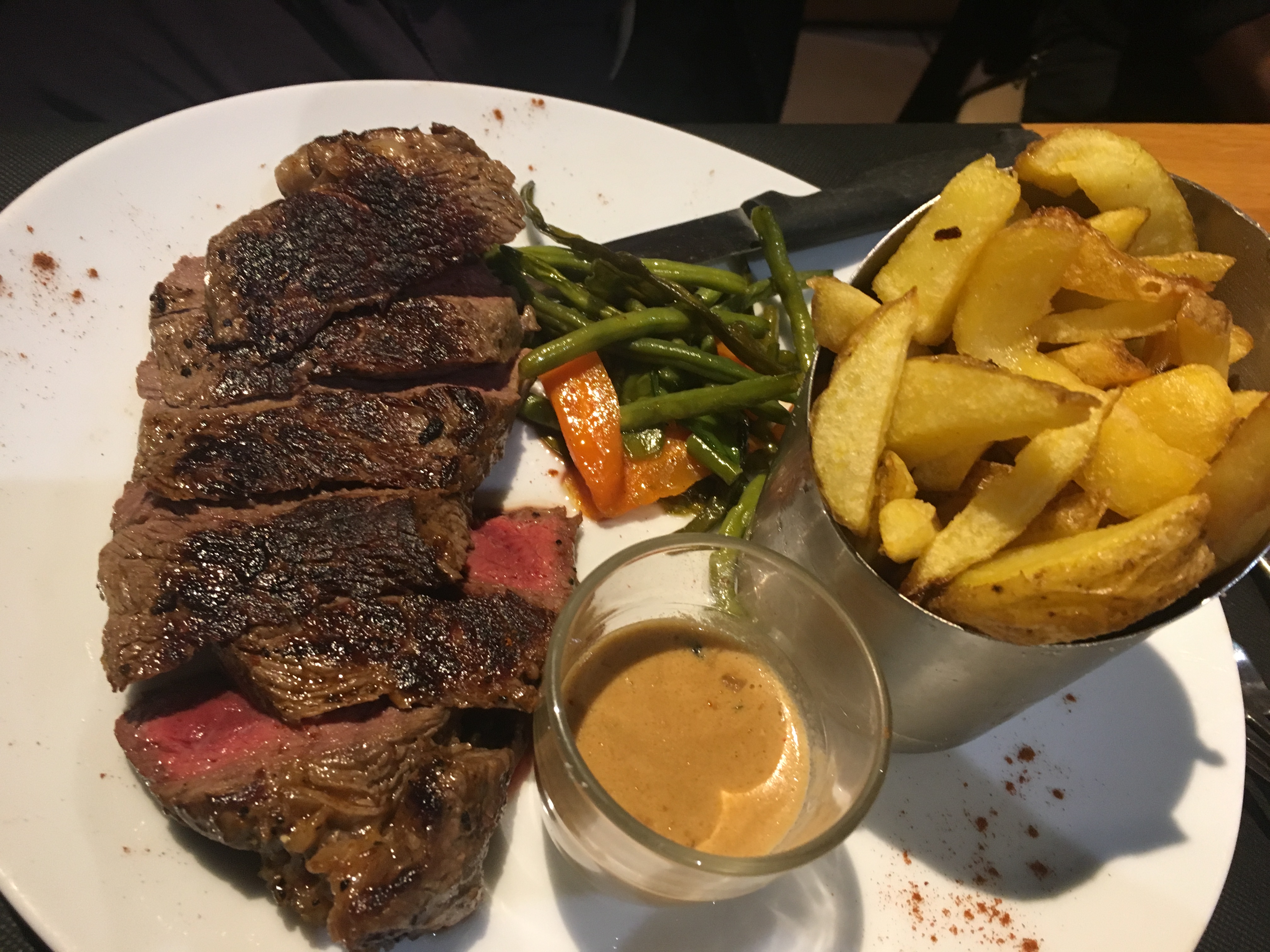 Produit frais, bonne cuisson. Dressage des assiettes convenable. Ils oublient de vous donner un couteau à viande si vous ne prenez pas d'entrée (ce n'est qu'un détail). Serveur qui fait la gueule. Contrairement aux serveuses qui sont aimables et souriante.