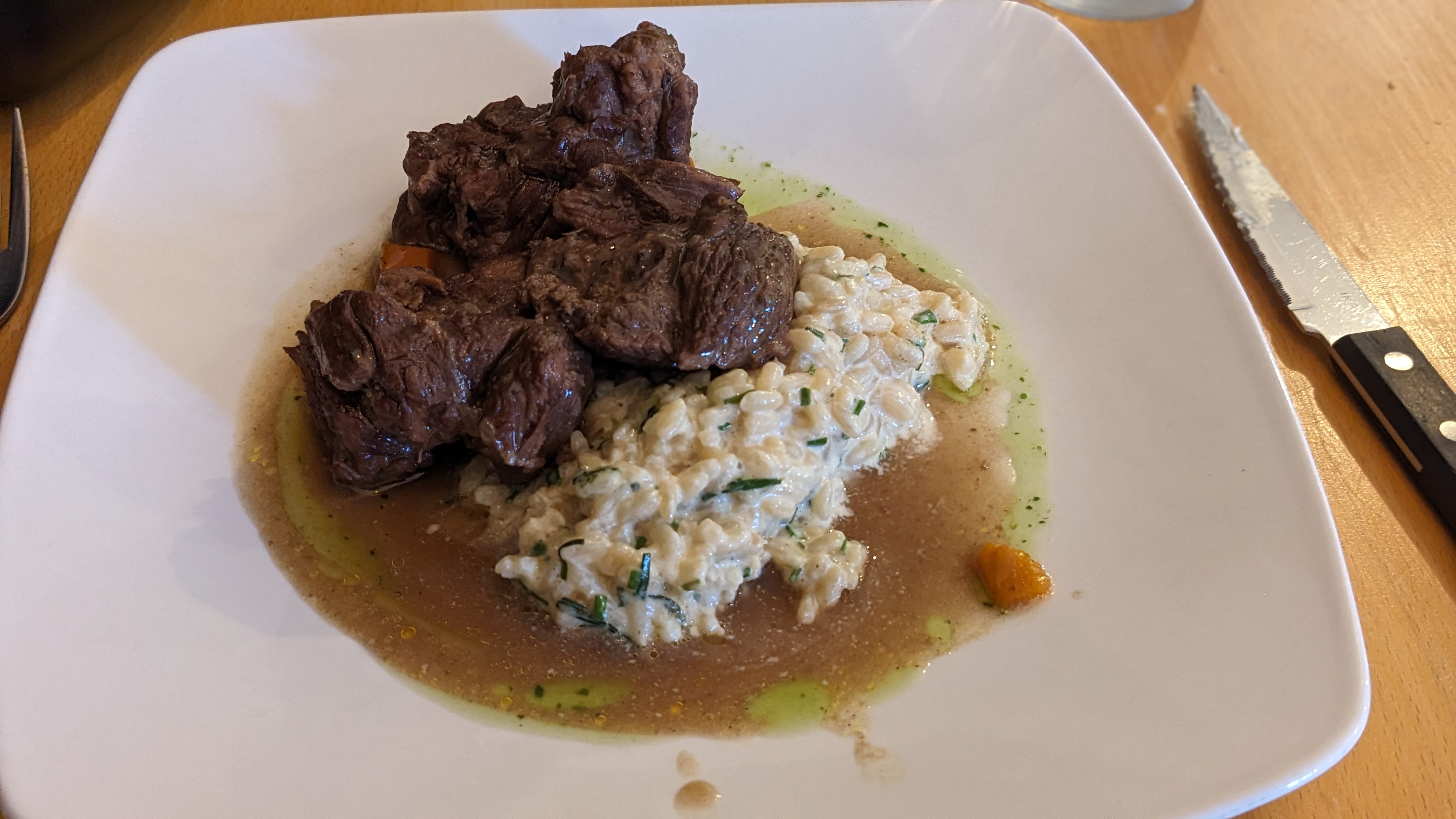 Excellent accueil. Le paleron de boeuf 12 h était délicieux. Dessert mousse 3 chocolats ganache , copieux, super léger et bien sûr très bon!!! Le tout servi dans un cadre fort agréable. Ce restaurant vaut le détour, je dirais même un très grand détour.!!!!
