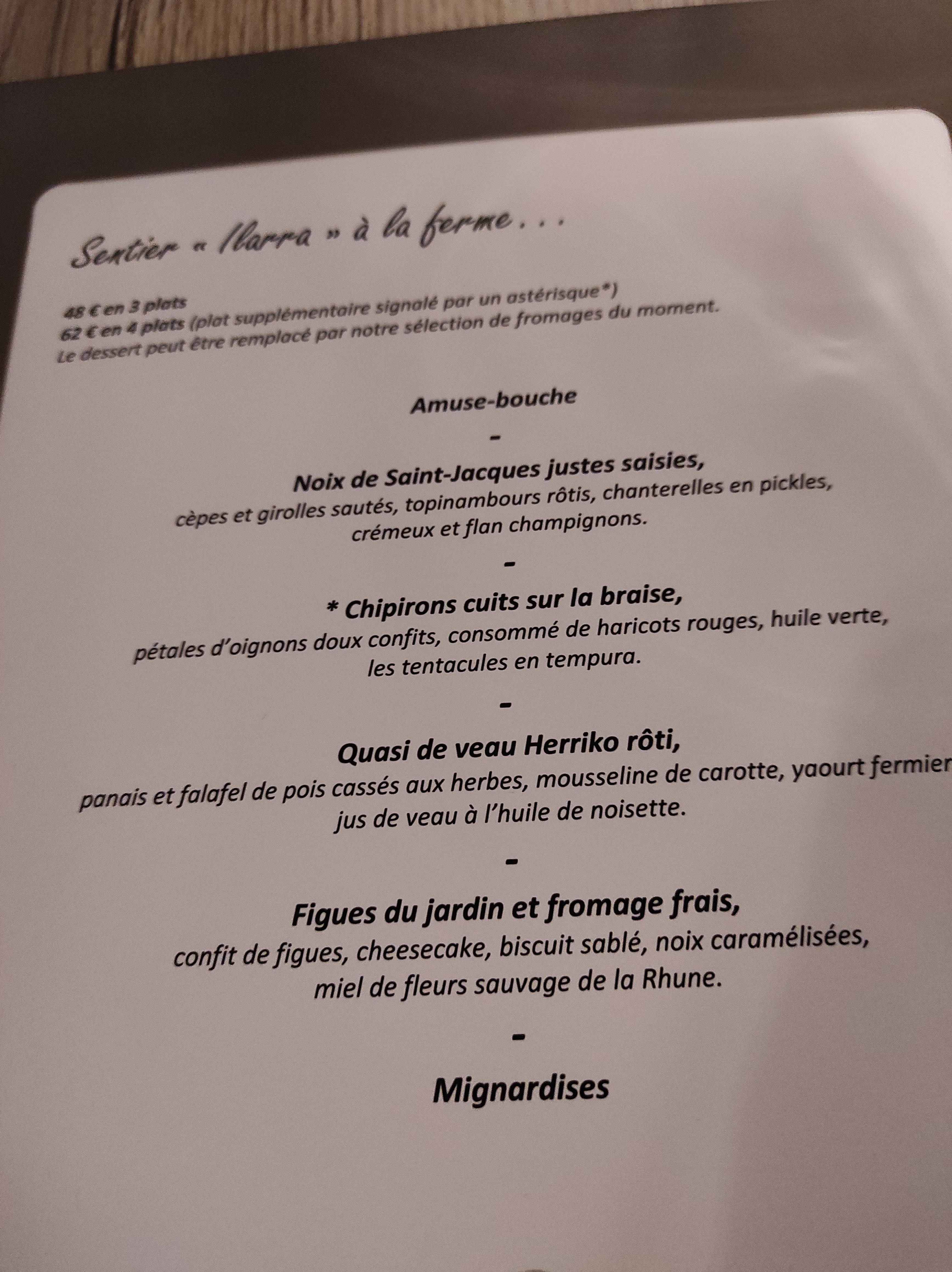 Super dîner dans un cadre traditionnel basque. Un réel repas gastronomique défiant toute concurrence au niveau du prix. Je recommande vivement