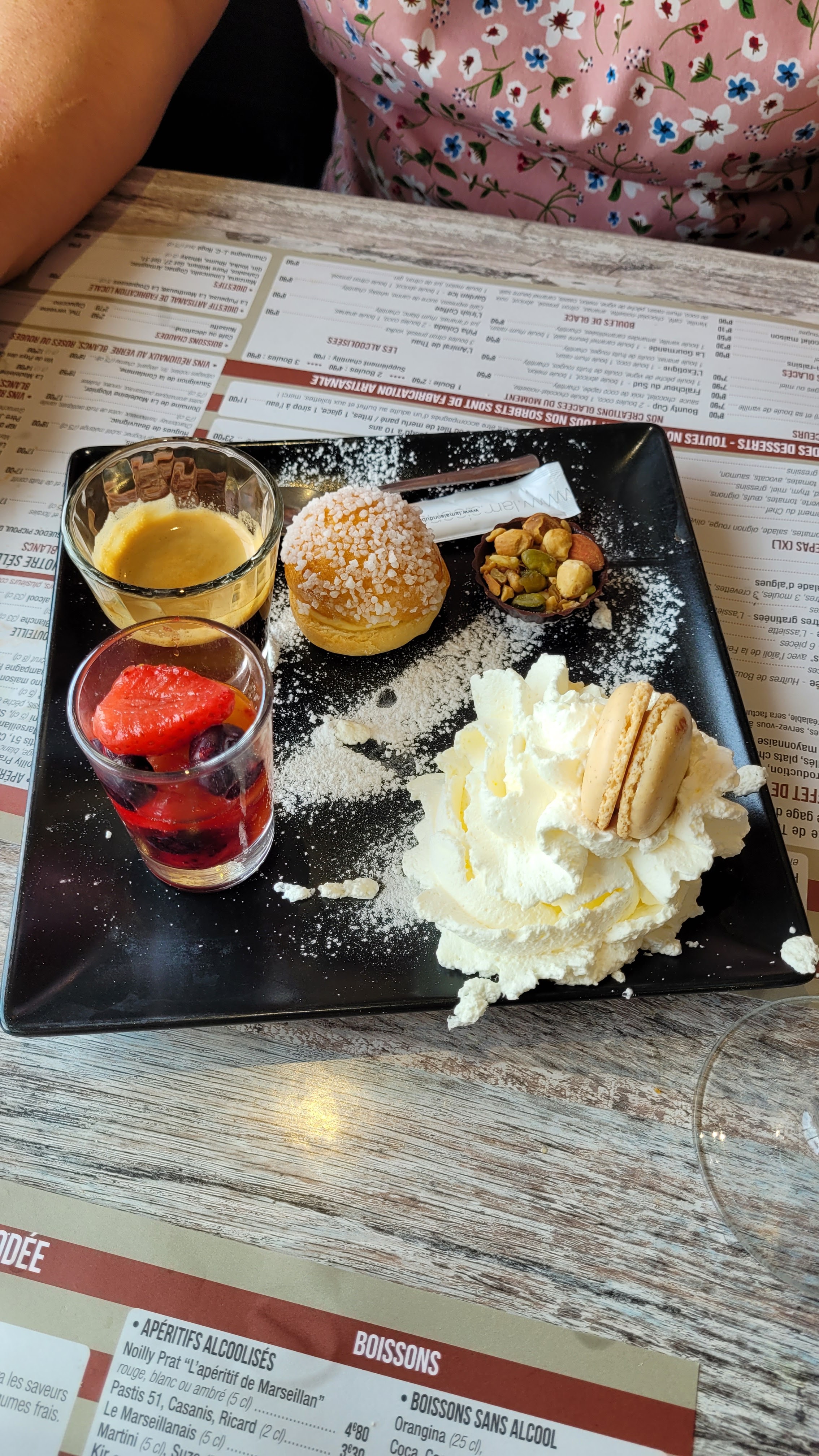 C'est un lieu à découvrir pour déguster les produits de la mer à volonté. Ceux qui aiment les buffets à volonté seront ravis. Des plats sont également proposés à la carte si vous préférez le poisson ou la viande. Mon choix s'est porté sur la planche Tapas et la Sole, 4 petites soles joliment présentées, poisson du jour extra frais!!! Honnêtement je me suis régalée. Image du dessert choisi par la personne qui m'accompagnait qui est les profiteroles. Niveau salle du restaurant, ça fait cantine, mais ça passe. N'hésitez pas si vous voulez vous faire plaisir à petit prix.