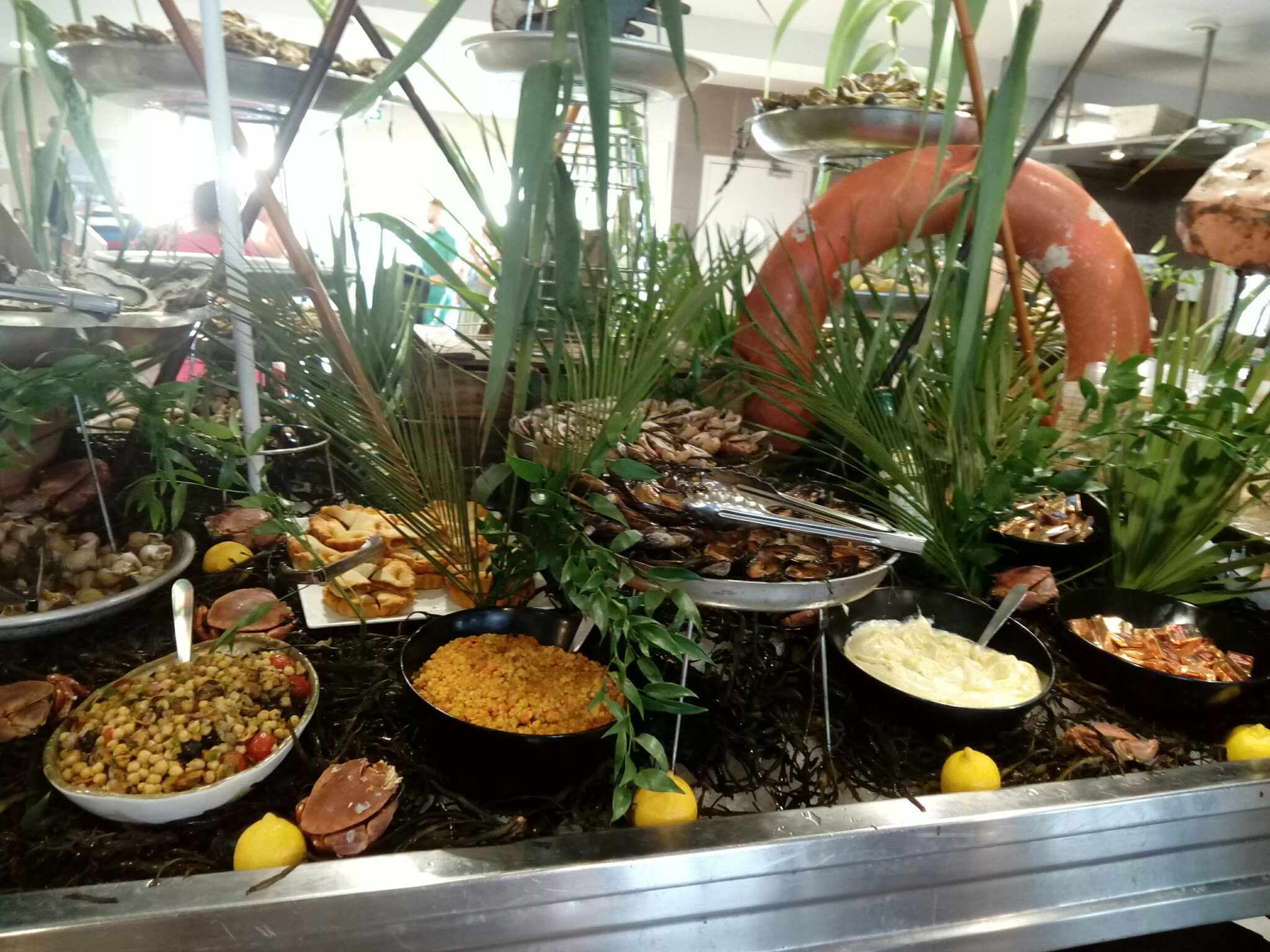 Buffet bien garni. Huîtres excellentes mais les boulots mal cuits, les écrevisses sans intérêt et les 2 plats chauds brandade de poissons et pâtes aux coques. Pâtes et riz aussi en entrée Les huîtres chaudes étaient bonnes Les desserts étaient très bons