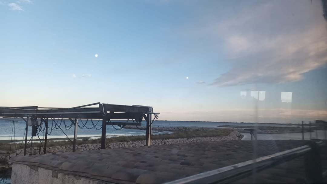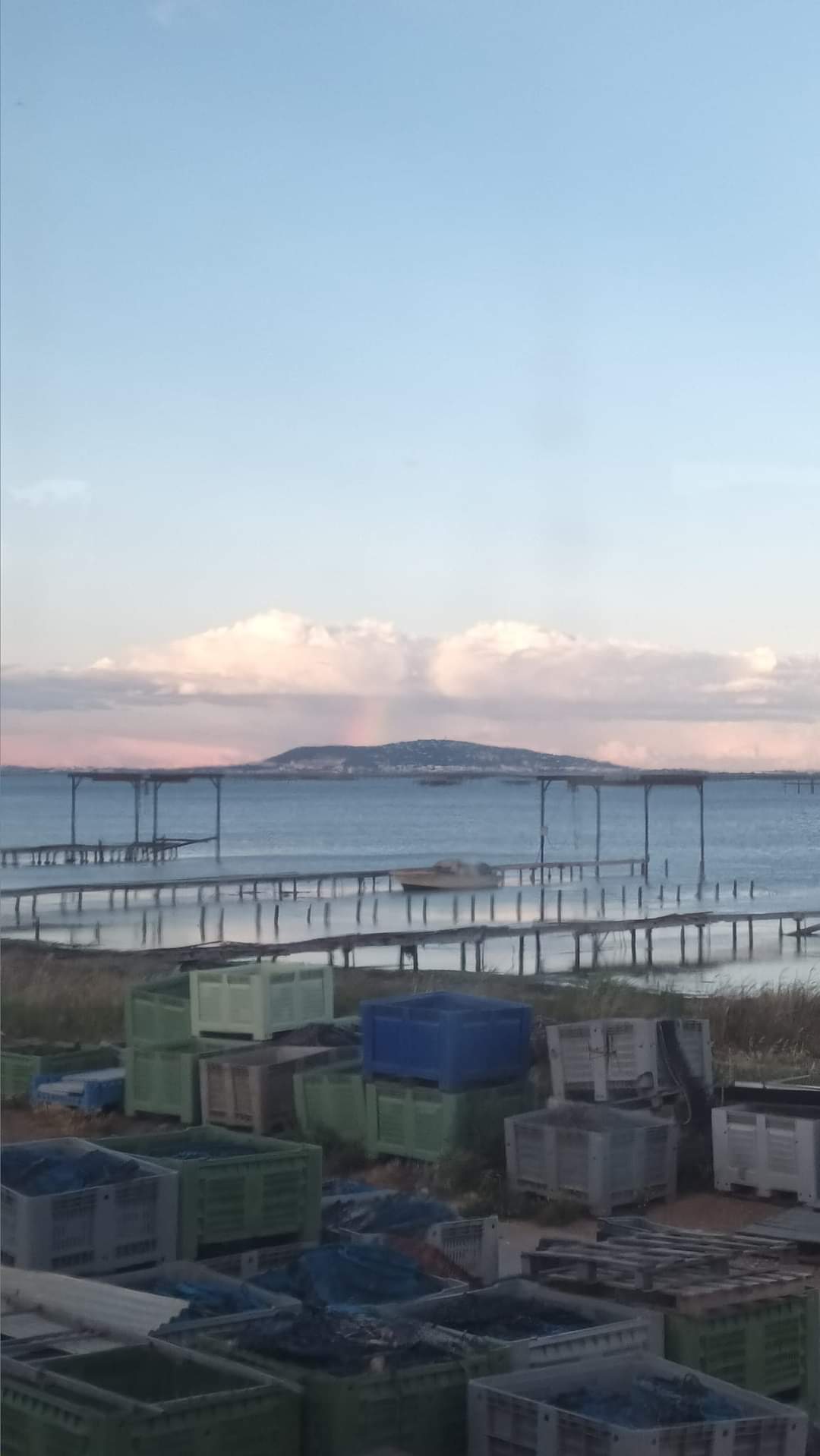 Vue sur l'étang de Thau et les parcs à Huîtres. Face à Sète !!!! Une adresse à noter absolument pour tous les amoureux de coquillages et de repas gargantuesques. Un buffet à volonté de coquillages qui fait saliver. Pensez à réserver car c'est très fréquenté. Et dernier petit conseil, arrivez à midi, car après c'est la foule.....