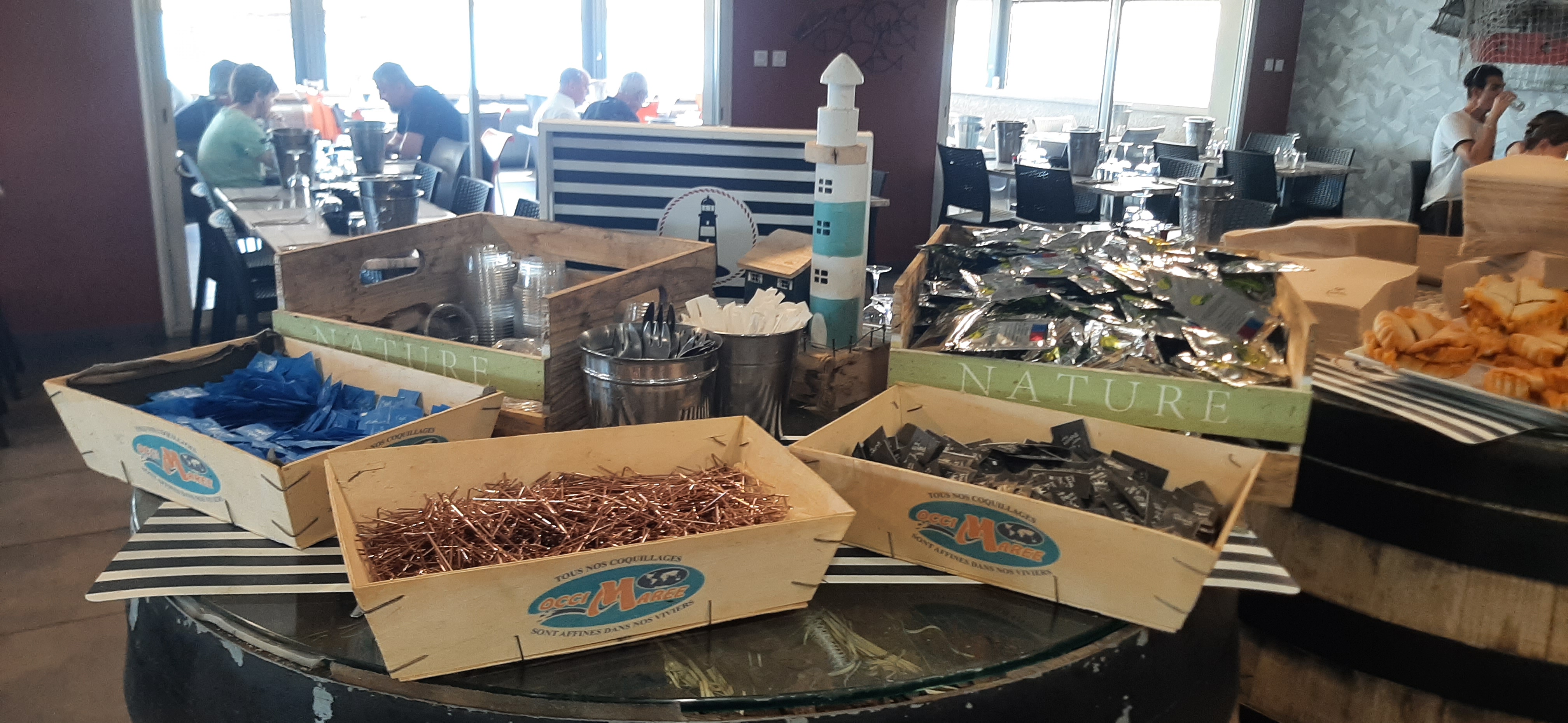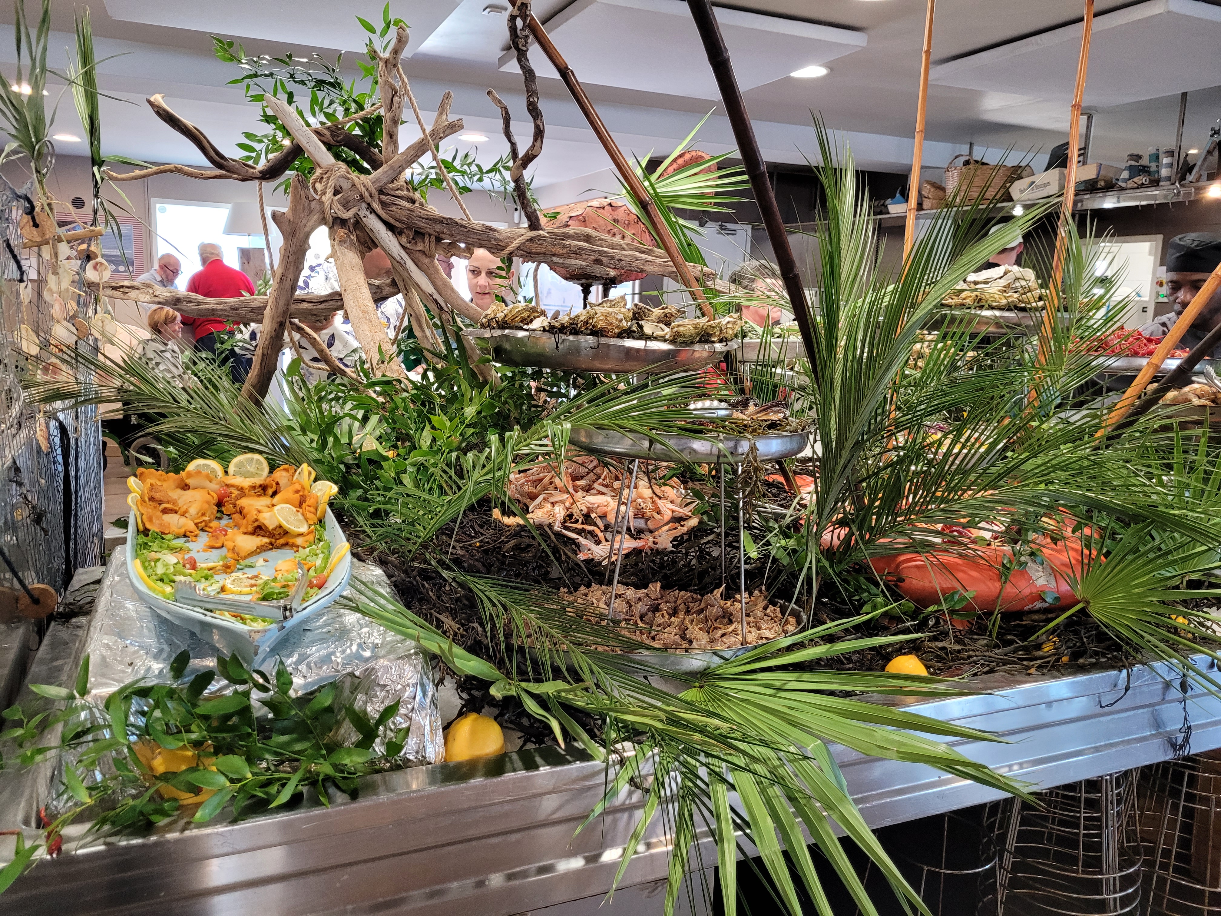 Buffet bien garni avec toutes sortes de fruits de mer, crus, cuits. Pour ceux qui ne sont pas poissons du tout, c'est entrecôte ou magret.