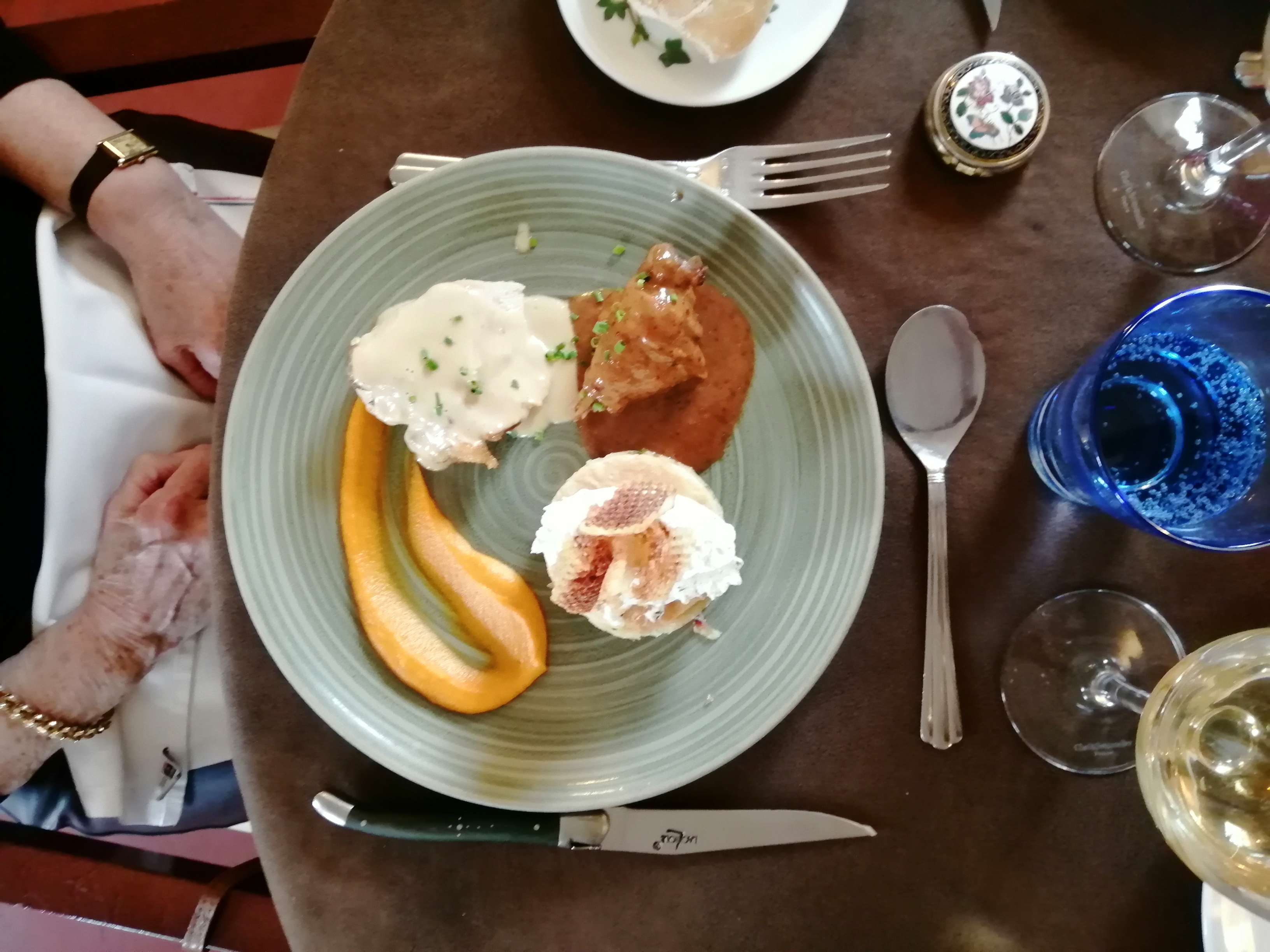Restaurant agréable avec une jolie vue sur la campagne. Cuisine parfaite : les quantités sont bien dosées, c’est très bon et c’est beau. Rien à redire de ce côté là. Nous nous sommes régalés. Par contre, nous sommes arrivés à 12:40 pour ne repartir que vers 15h. Ce fut long, trop long…