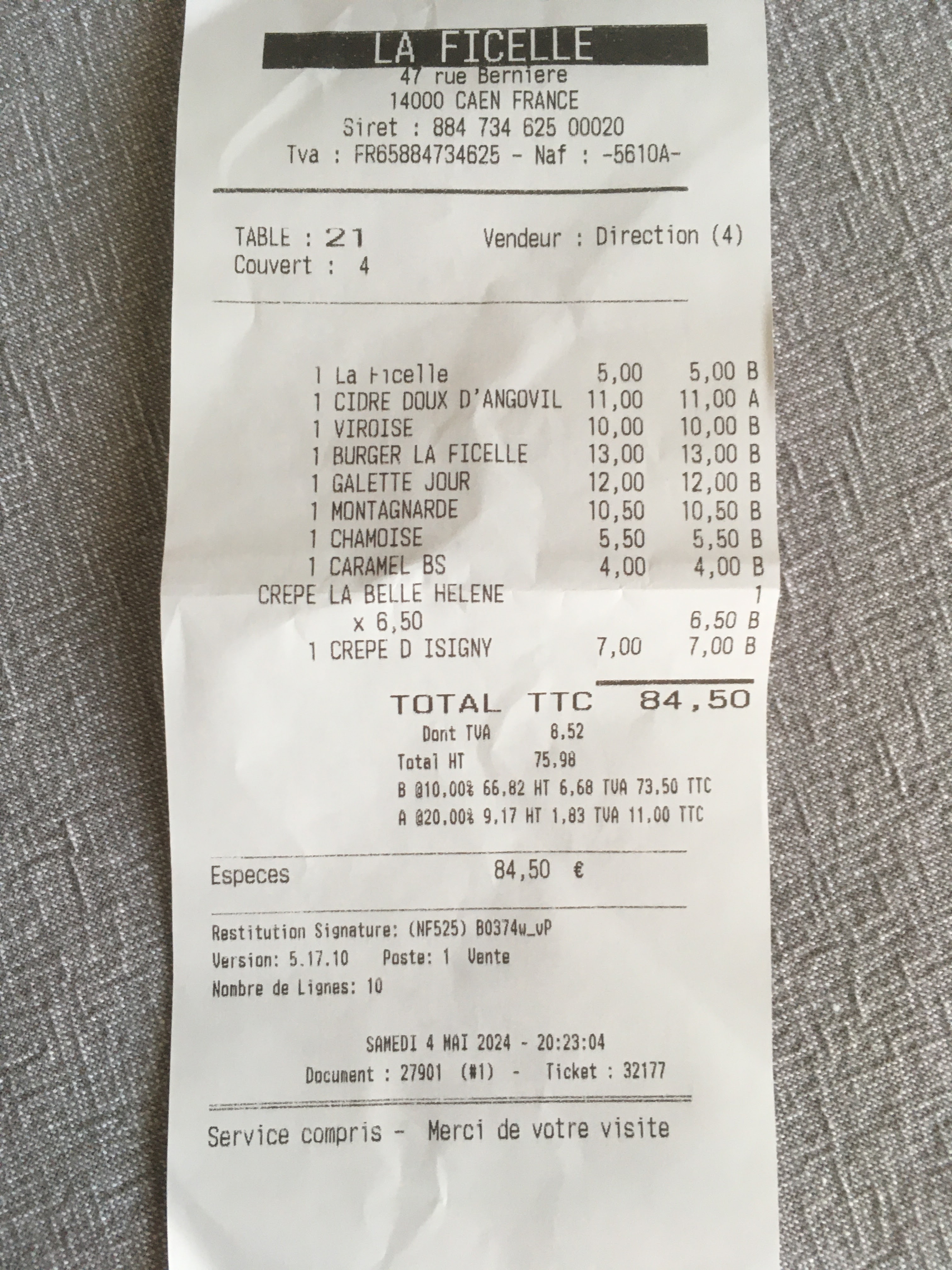 Nous y avons emmené notre grand fiston pour ses 22 ans. Mes deux hommes étant fan de galettes, ils ont adoré. Perso j'ai pris une salade la cocotte mais j'ai pas été séduite. Je m'explique : c'est une salade avec du poulet, des tomates, des pommes de terres sautées et un oeuf au plat. Le poulet était sec et les pommes de terre pas assez cuites. Après je laisse 5 étoiles car ce n'est pas leur spécialité et comme je le disais, les deux grands mangeurs de galettes étaient ravies. Je me suis rattrapée sur le dessert avec une crêpe au caramel au beurre salé. Alors là.... Un régal pour les papilles. J'aurais pu en demander une autre par simple gourmandise. En bref, vous avez une carte variée que ce soit sur le salé ou le sucré et ce n'est pas pour rien que La Ficelle fasse partie des 10 meilleures crêperies de Caen. Un grand bravo pour le rapport qualité prix et aussi un grand merci pour l'accueil chaleureux. Nous vous recommandons vivement 👍. Estelle, willy et Alexis