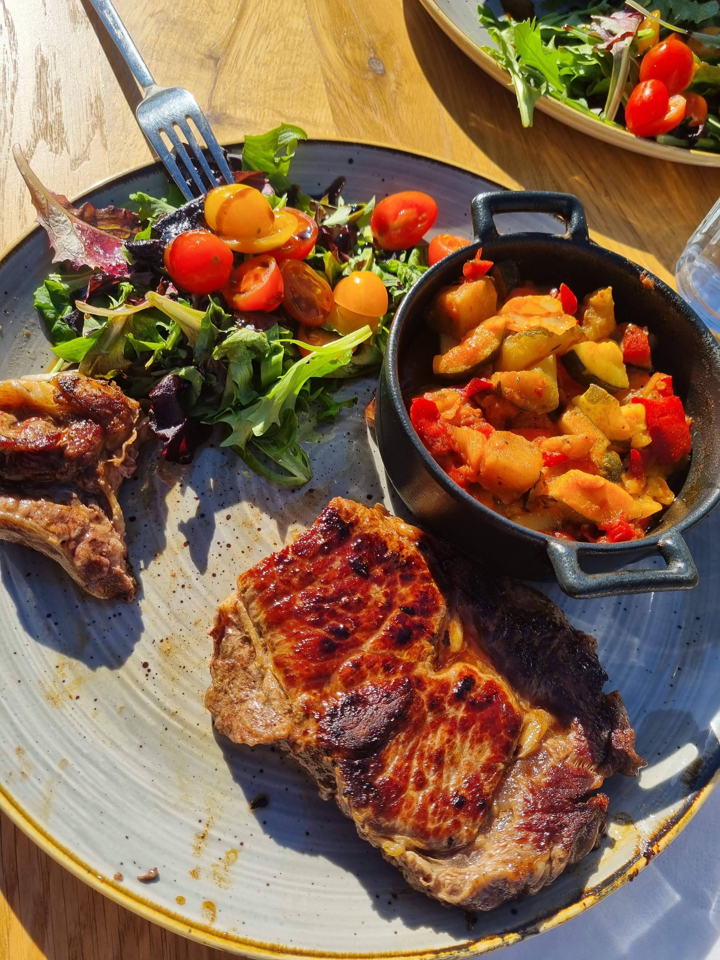 Une super côté de bœuf qualité prix avec petite pomme de terre aux oignons le plaisir de la bouche accueil service propreté ambiance de folie vive les vacances