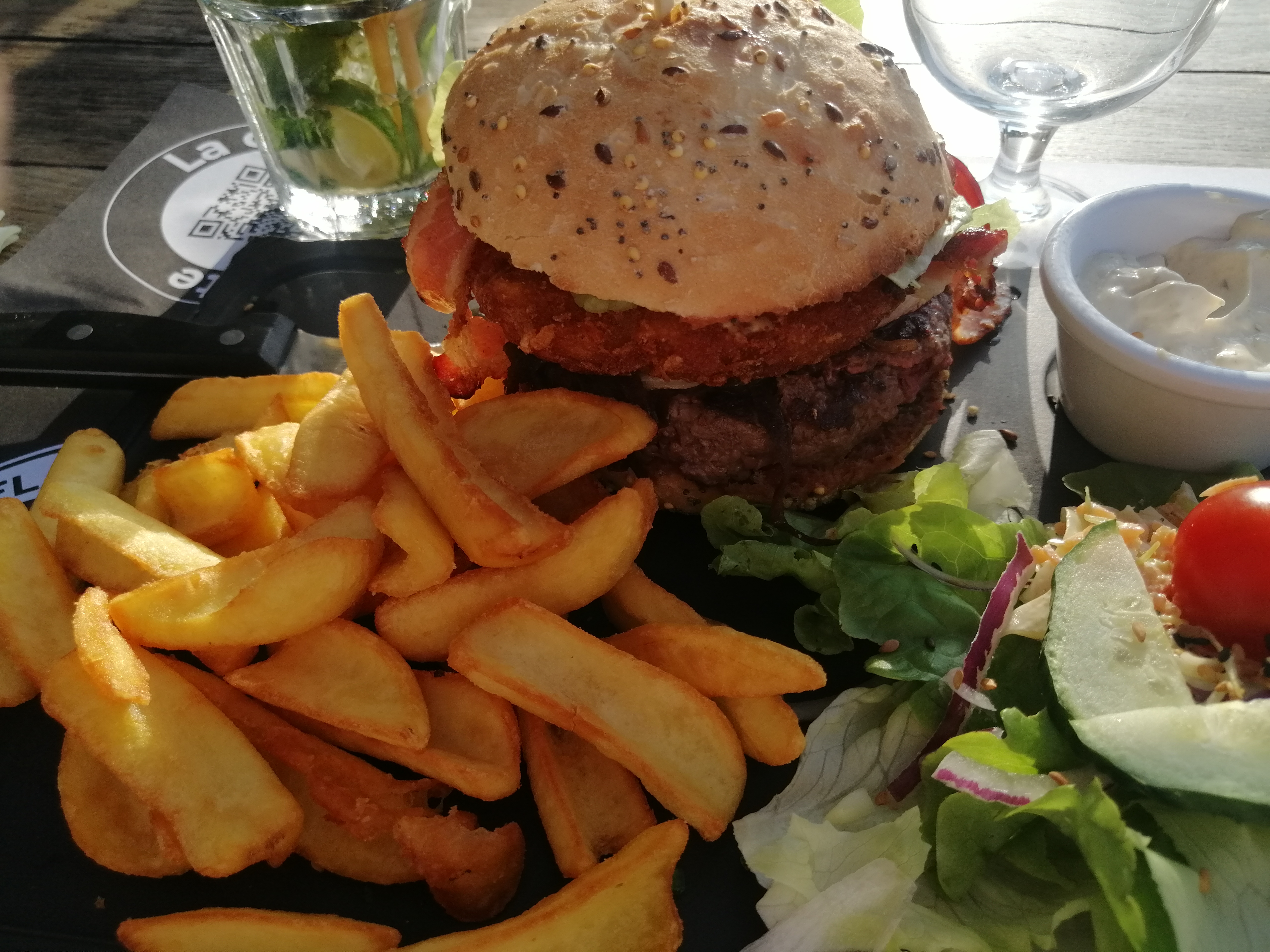 Arrives vers 12h30 devant le restaurant, nous avons pu réserver pour 4 pour 13h15 en terrasse. La table était libre et prête à notre arrivée ! Un service, des sourires, un accueil de qualité : Vraiment au top ! (Mention spéciale à Paul !!) Burgers, Nuggets, et Salade : on s’est régalés ! Que des produits frais ! Une qualité vraiment au rdv ! Et superbe vue depuis la terrasse ! Nous recommandons sans hésitation !