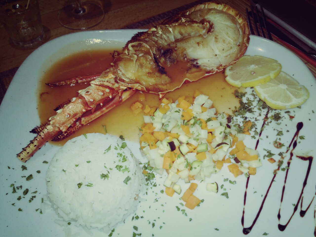 Endroit chaleureux, convivial, où on passe un bon moment, tant au comptoir à s'essayer à des dégustations de vins, de bières, de shooters aux parfums exotiques, de saucissons, qu'autour d'une table où l'on savoure des crêpes, pizzas, bonnes viandes ou, comme le montre la photo, une délicieuse langouste avec une sauce aux fruits de mer... Un régal !