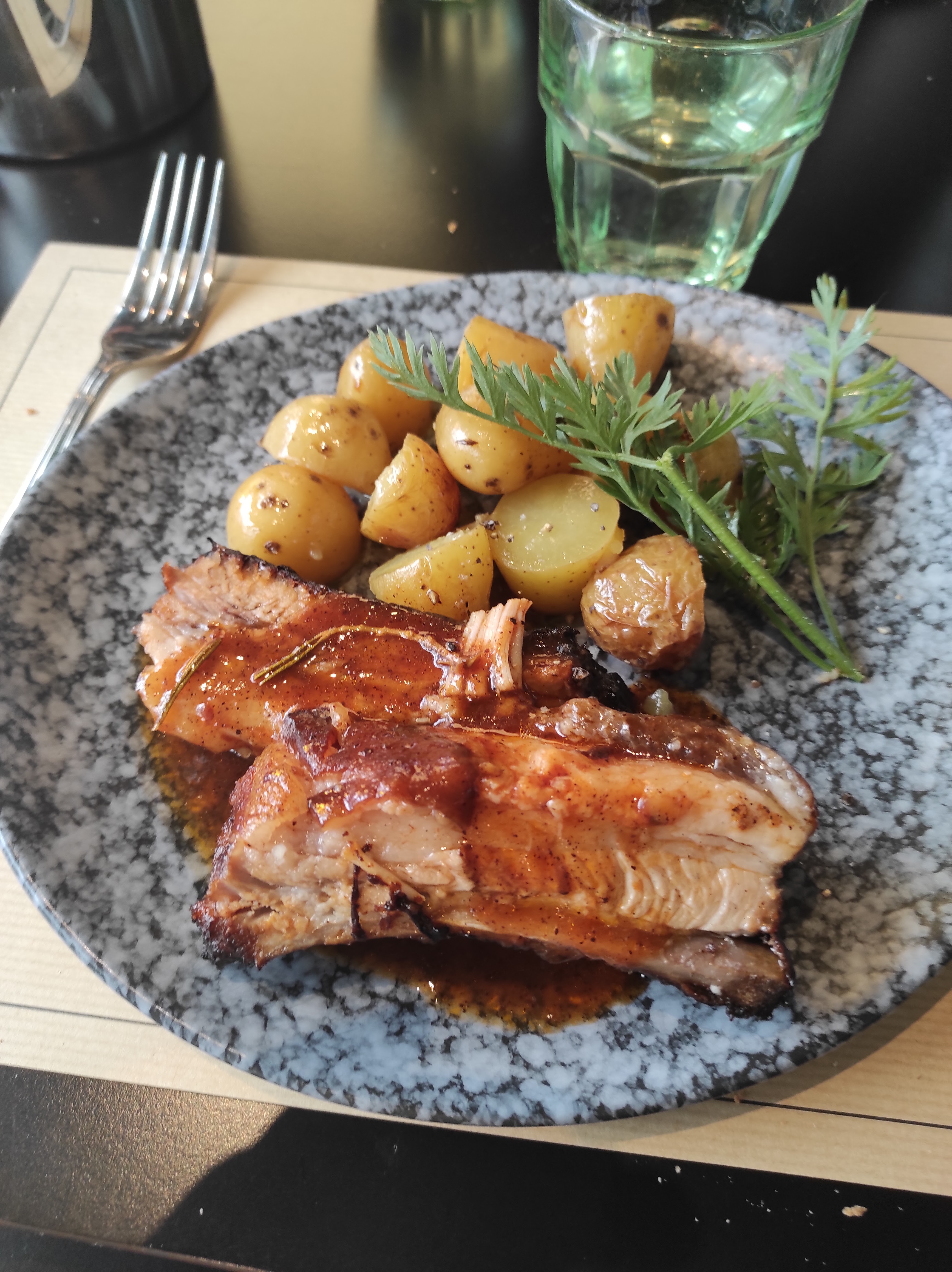 Un très très très gros bénéfice pour ce restaurateur, 3 tranches de porc et une patate (le seul accompagnement) pour 15 euros... et pour le crumble pomme poire, j'appellerai ça plutôt une compotée, et pour les frustrés du covid aucun masque pour le personnel