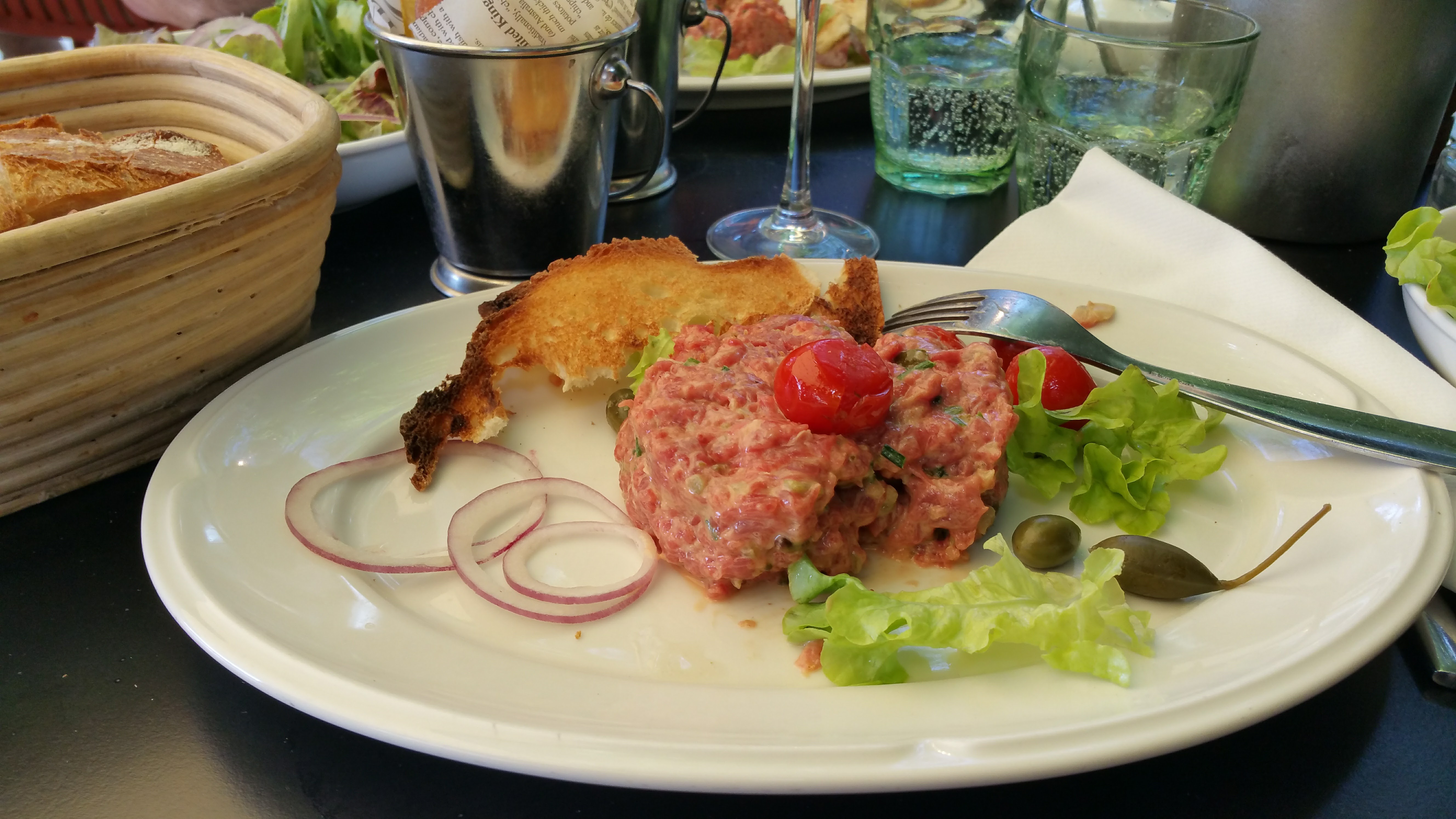 Steak tartare pas mal , frites classiques, toute petite salade , boisson , café , 22€